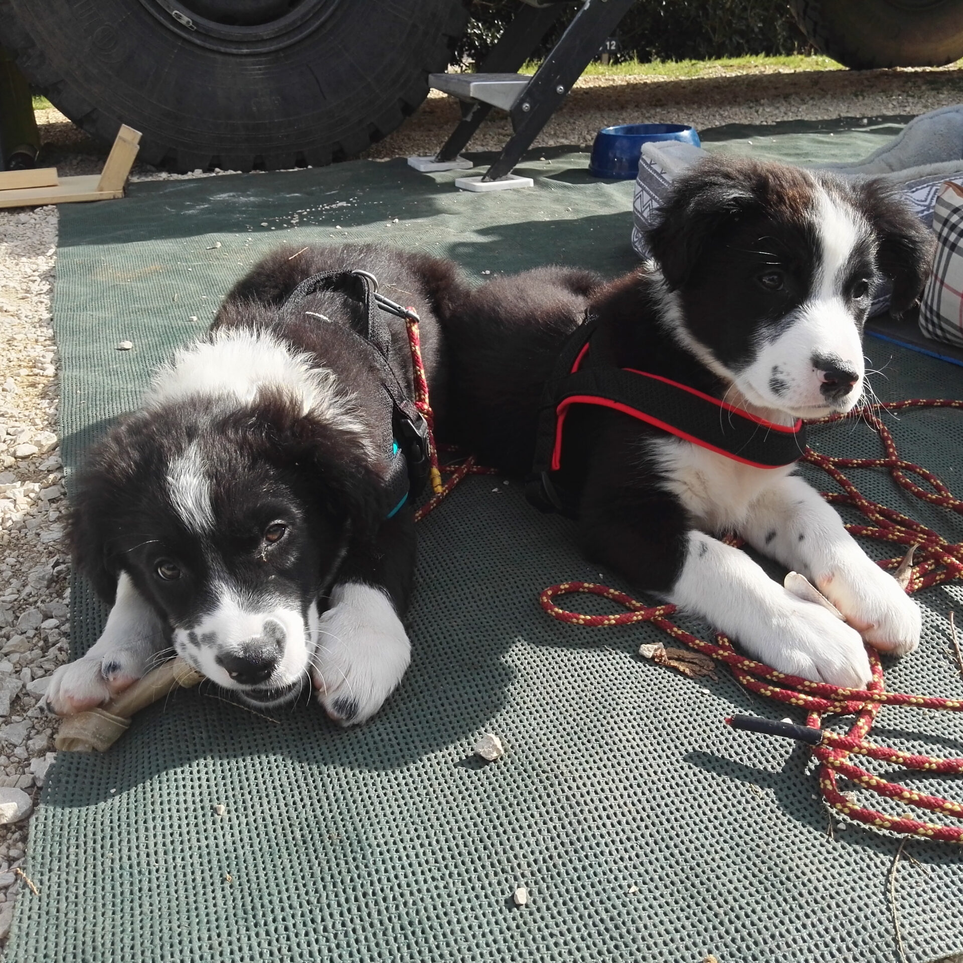 Am Anfang waren die beiden noch recht lieb und kuschelig miteinander. Gemeinsam hatten sie ganz viel Unsinn im Kopf! Gemeinsam waren sie auch gute Wachhunde. Egal, was oder wer sich dem LKW näherte, wurde umgehend und anhaltend verbellt. Relativ schnell merkten wir, dass die Erziehung von zwei Geschwisterwelpen eine richtige Herausforderung ist. Das allein hätten wir aber in Kauf genommen.