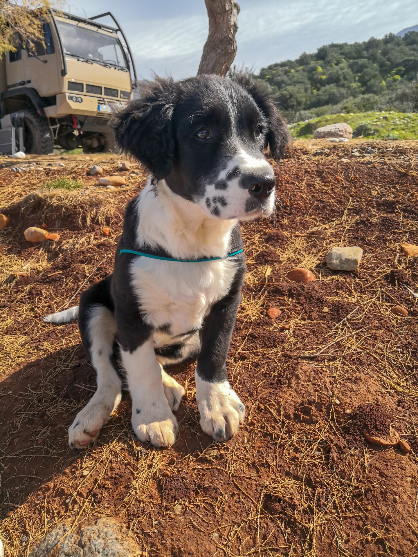 Es war also schnell klar, beide können wir nicht behalten. Nur wen behalten wir und für wen suchen wir einen neuen Platz? Die Vorstellung, uns von einem der beiden trennen zu müssen, war schrecklich. Letztendlich fiel die Wahl auf Yannis, da ihn das Reisen von Anfang viel mehr angestrengt hat. Er ist eher behäbig und bewacht gerne den LKW, sprich, er bewegt sich ungern fort. Auch die ständig wechselnden Umgebungen waren eine Herausforderung für ihn. Alma steigt aus und ist neugierig. Yannis steigt lieber erst gar nicht aus.