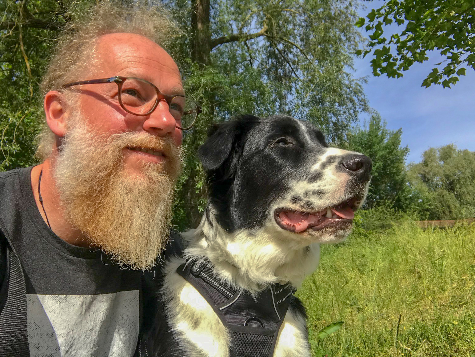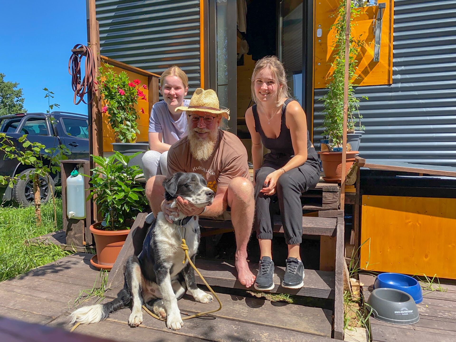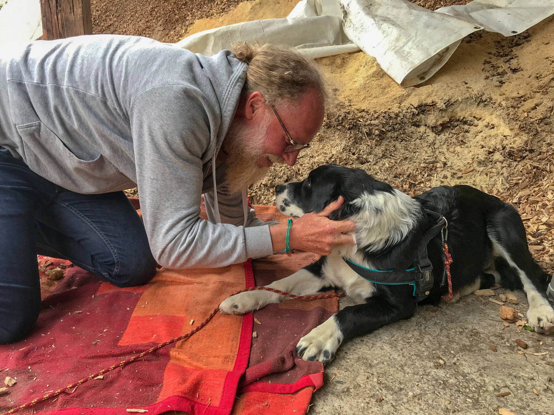 Bernd leint Yannis von der Schleppleine ab, nimmt die kurze Leine. Sagt: Komm Yannis, wir fahren. Yannis steht freudig auf, wedelt mit dem Schwanz, geht mit, steigt ins Auto und ist glücklich. Er hat nicht mal gekuckt! Also nach uns gekuckt! Da waren wir schon ein bisschen beleidigt.