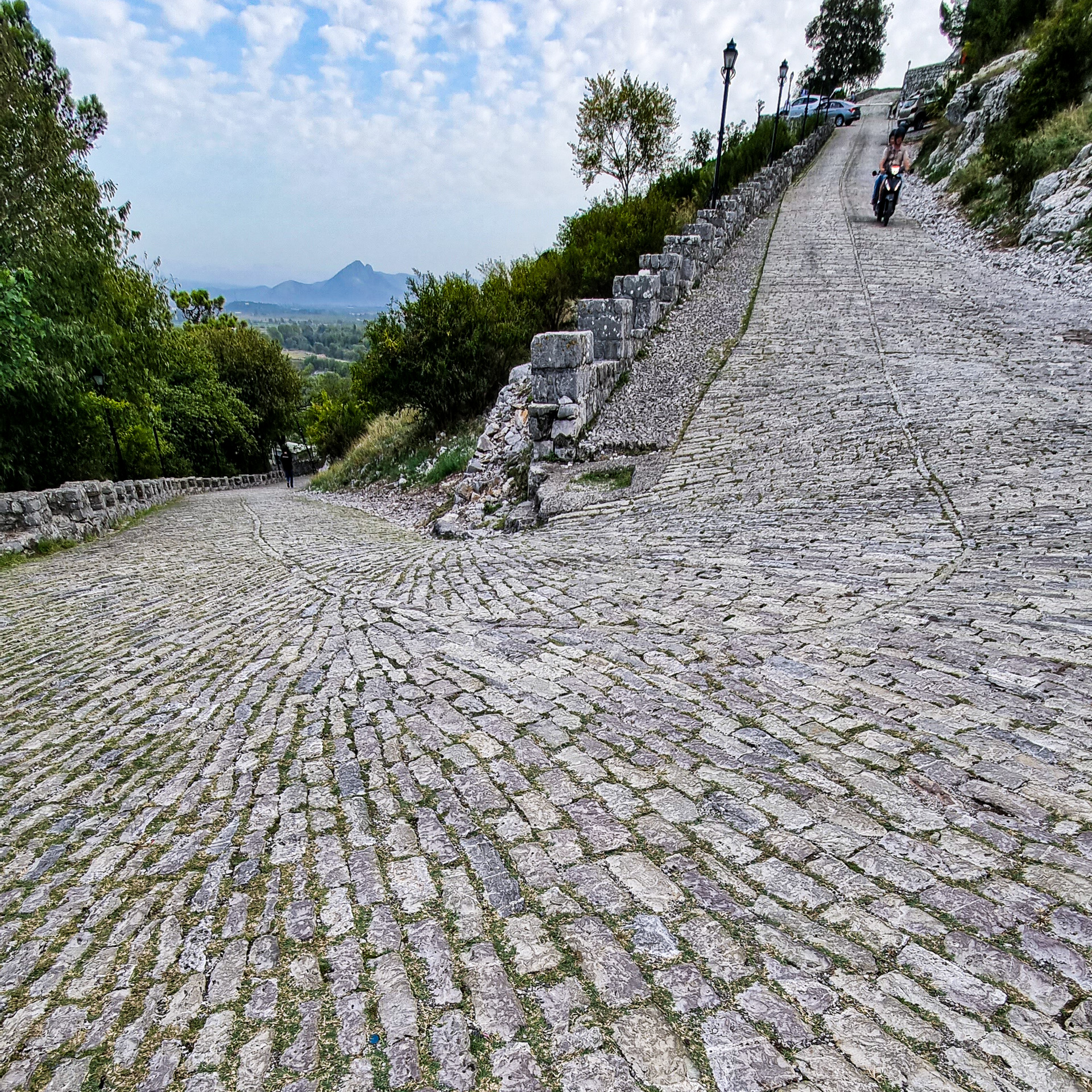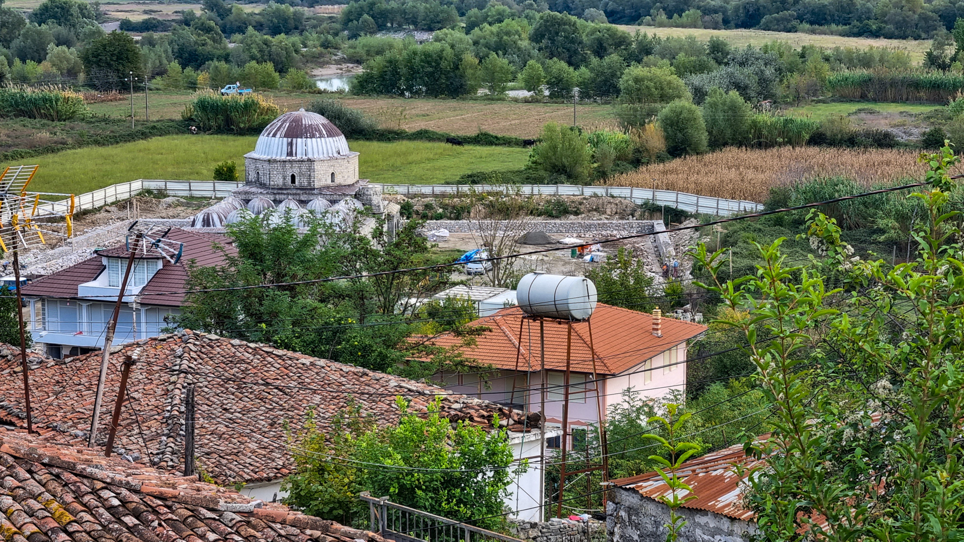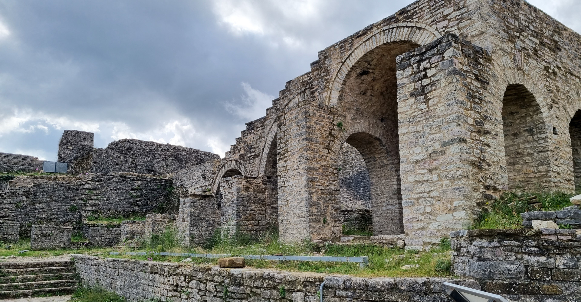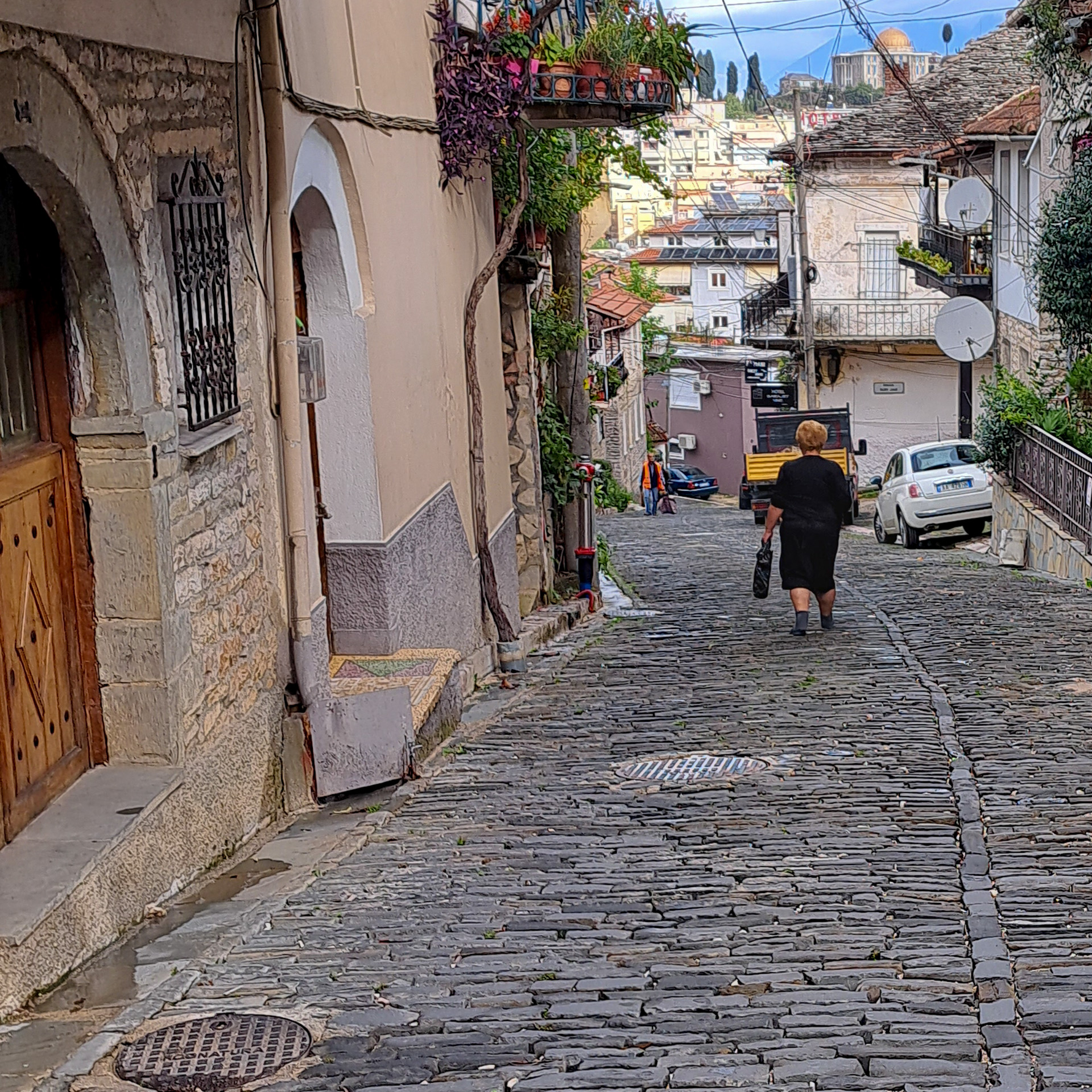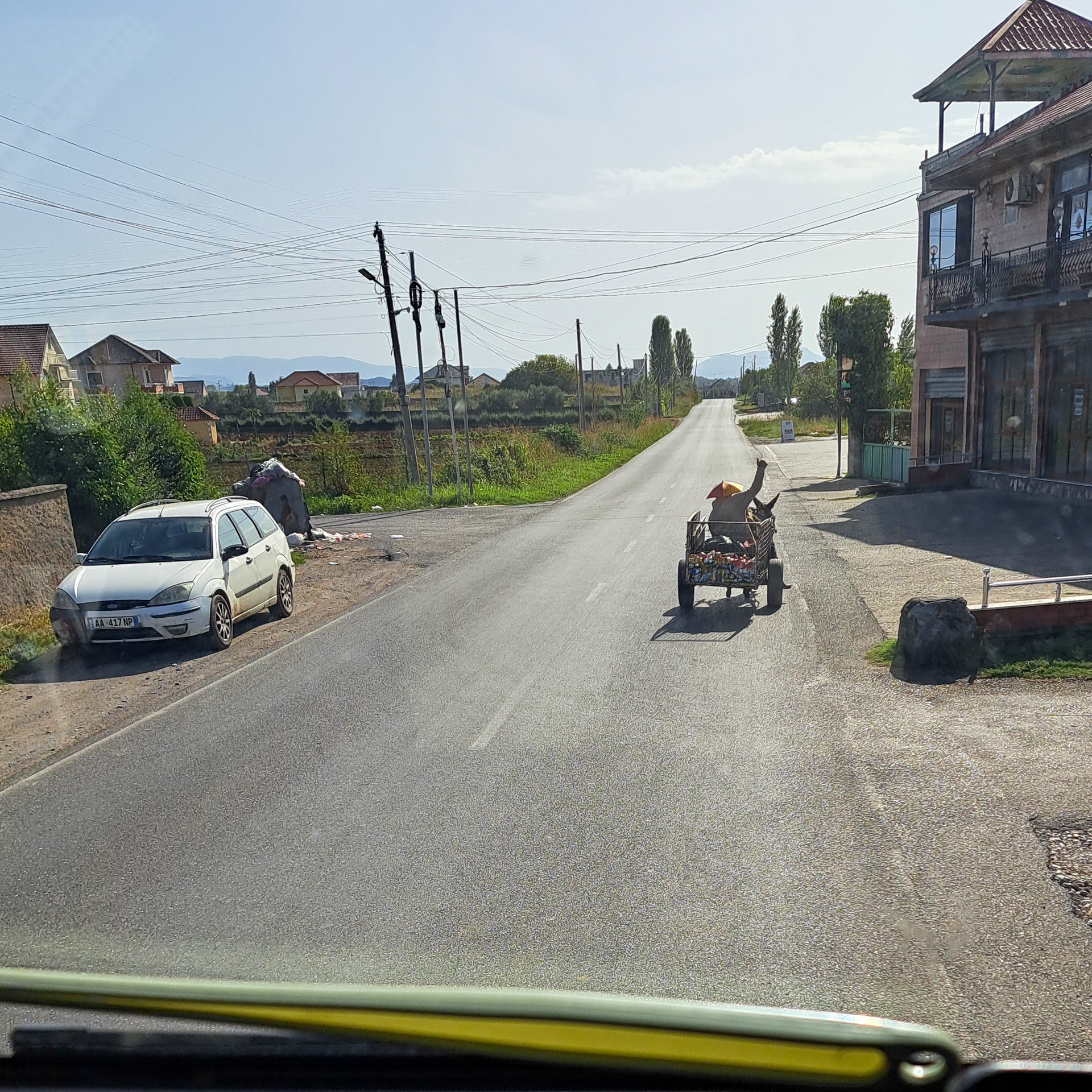 Die Reparatur mit einem einfachen, flachen Spiegel dauert keine halbe Stunde und so können wir noch am selben Tag unsere Reise mit einem voll funktionsfähigen Provisorium fortsetzen. Auf weitere Abenteuer haben wir nach der ganzen Aufregung allerdings keine Lust mehr. Geplant war, eigentlich weiter Richtung Süden zu fahren und durch die Berge über Ersekë, Leskovik und Përmet nach Gjirokastër zu gelangen. Das hätte aber wieder schlechte, enge Straßen und viel Wald bedeutet und der Wetterbericht verhieß auch nichts Gutes. Also fahren wir am nächsten Tag von unserem Stellplatz am Ohrid-See in Pogradec den Bogen über Elbasan und Fier auf der gut ausgebauten SH7 und SH4 nach Gjirokastër.