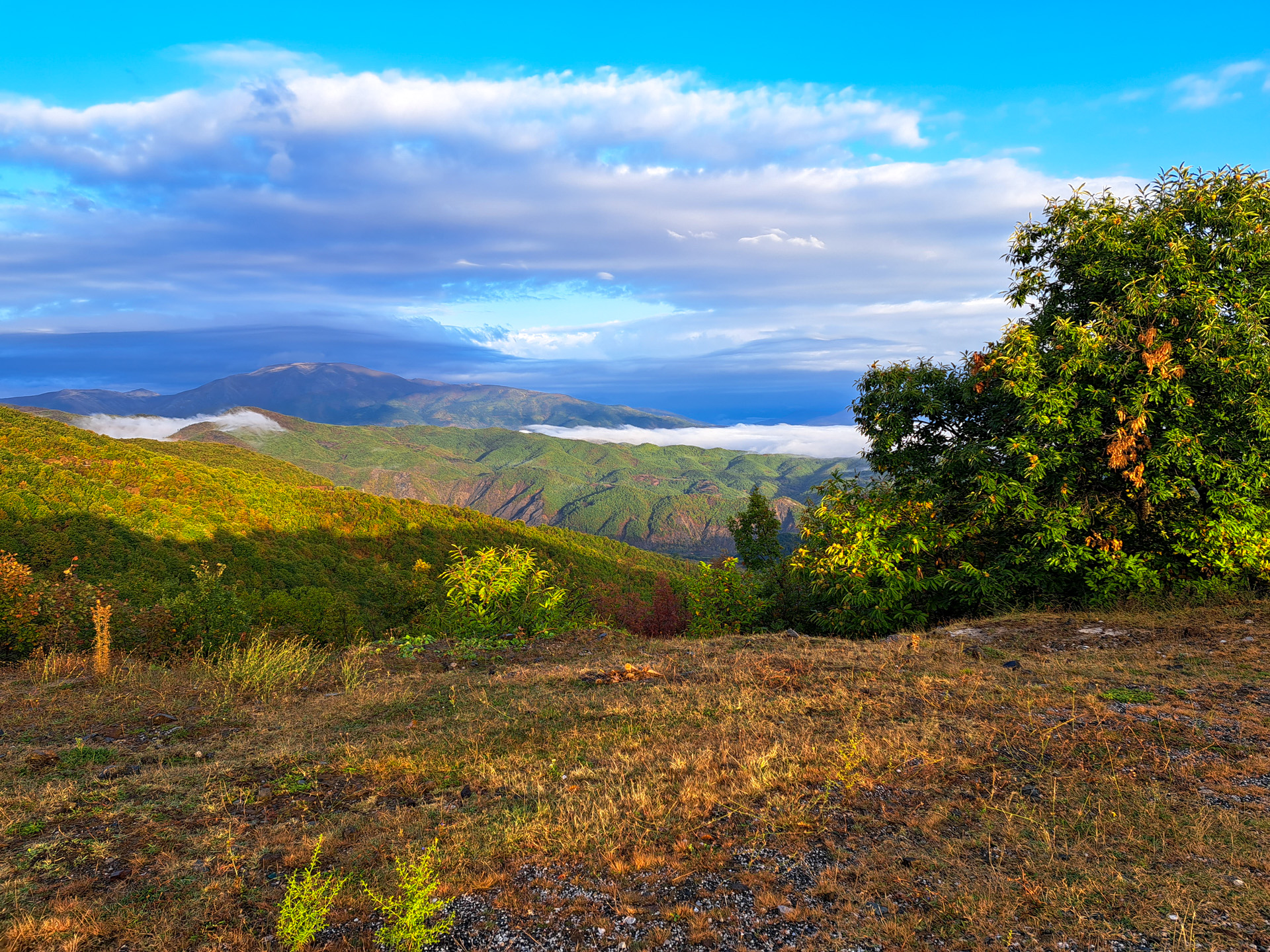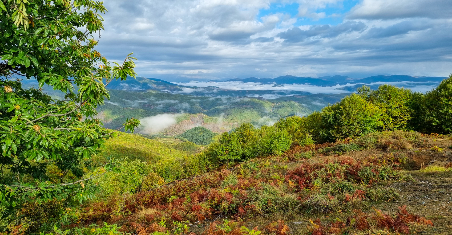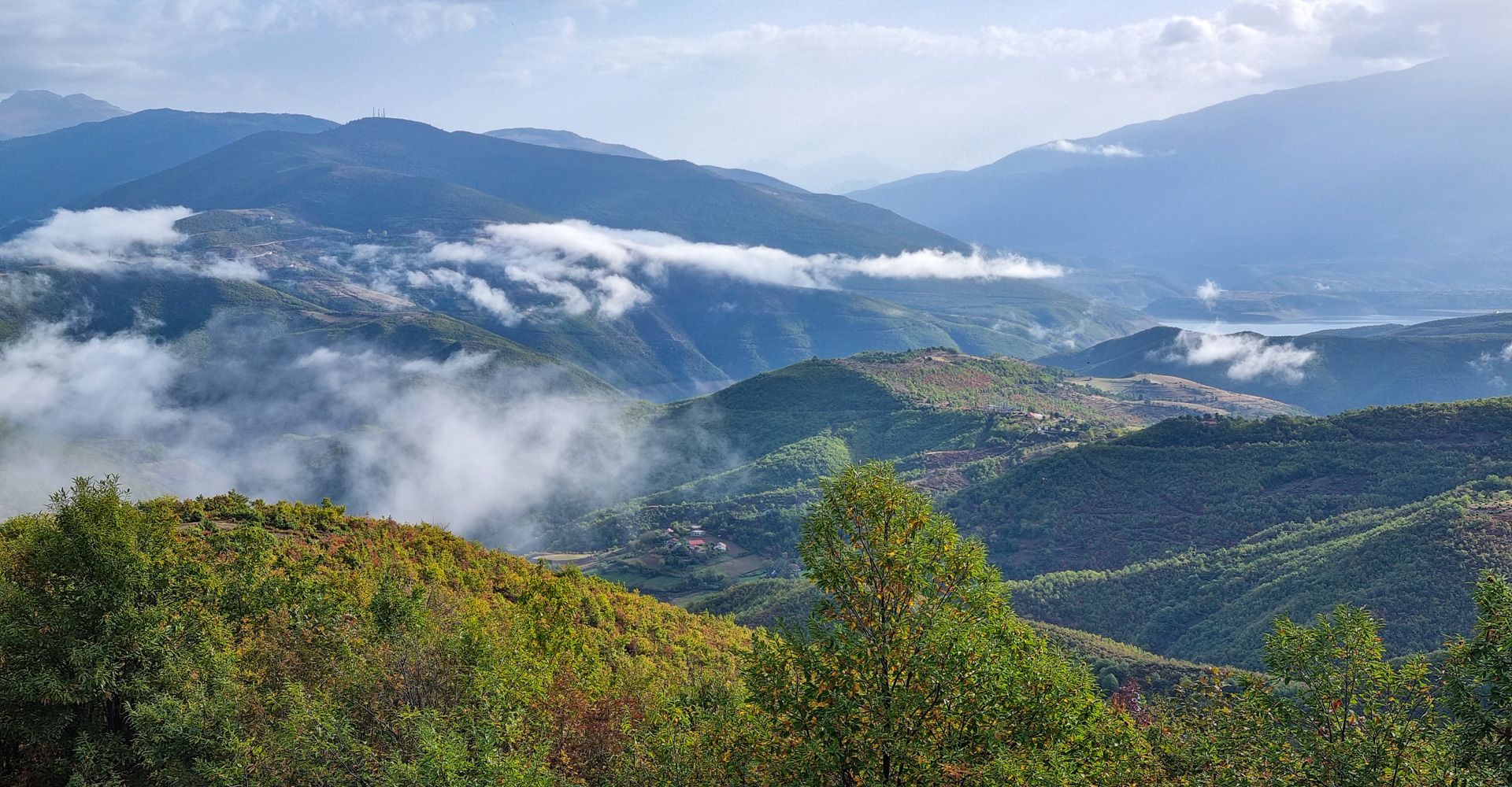 Am nächsten Tag ist eine Entscheidung gefallen, wir nehmen die Berge in Richtung Kukës in Angriff. Über Puka geht es immer die SH5 entlang. Leider erweist sich die Strecke nicht als das, was wir uns erhofft hatten. Sie führt fast durchgehend durch dichte Wälder ohne jede Aussicht, das Wetter ist auch eher durchwachsen und irgendwann werden dann auch die vielen Serpentinen anstrengend. Wir übernachten auf einer Anhöhe bei Regen und Sturm und werden dafür am nächsten Morgen zumindest mit einer großartigen Aussicht auf die wolkenverhangene Landschaft belohnt.