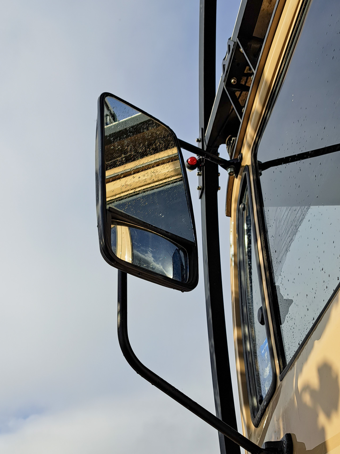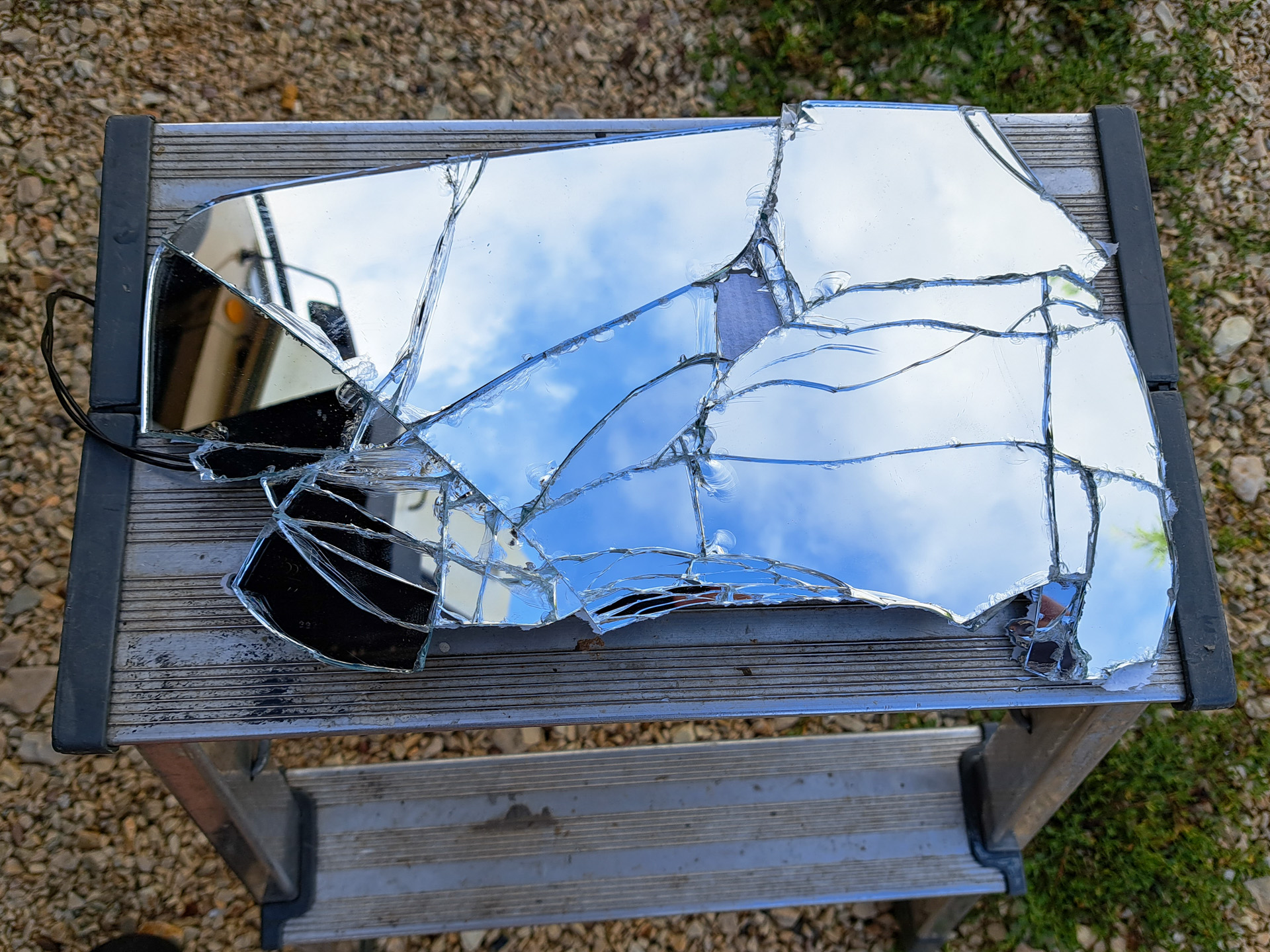 Wir schneiden die zerbrochenen Reste ab, basteln aus einem kleinen Badspiegelchen einen Notbehelf und fahren weiter bis wir zu einer größeren Tankstelle kommen. Dort gibt es erst einmal einen Kaffee zur Beruhigung der Nerven. Von den freundlichen und sehr hilfsbereiten Mitarbeitern der Tankstelle bekommen wir eine Adresse genannt, die wir ansteuern sollen.