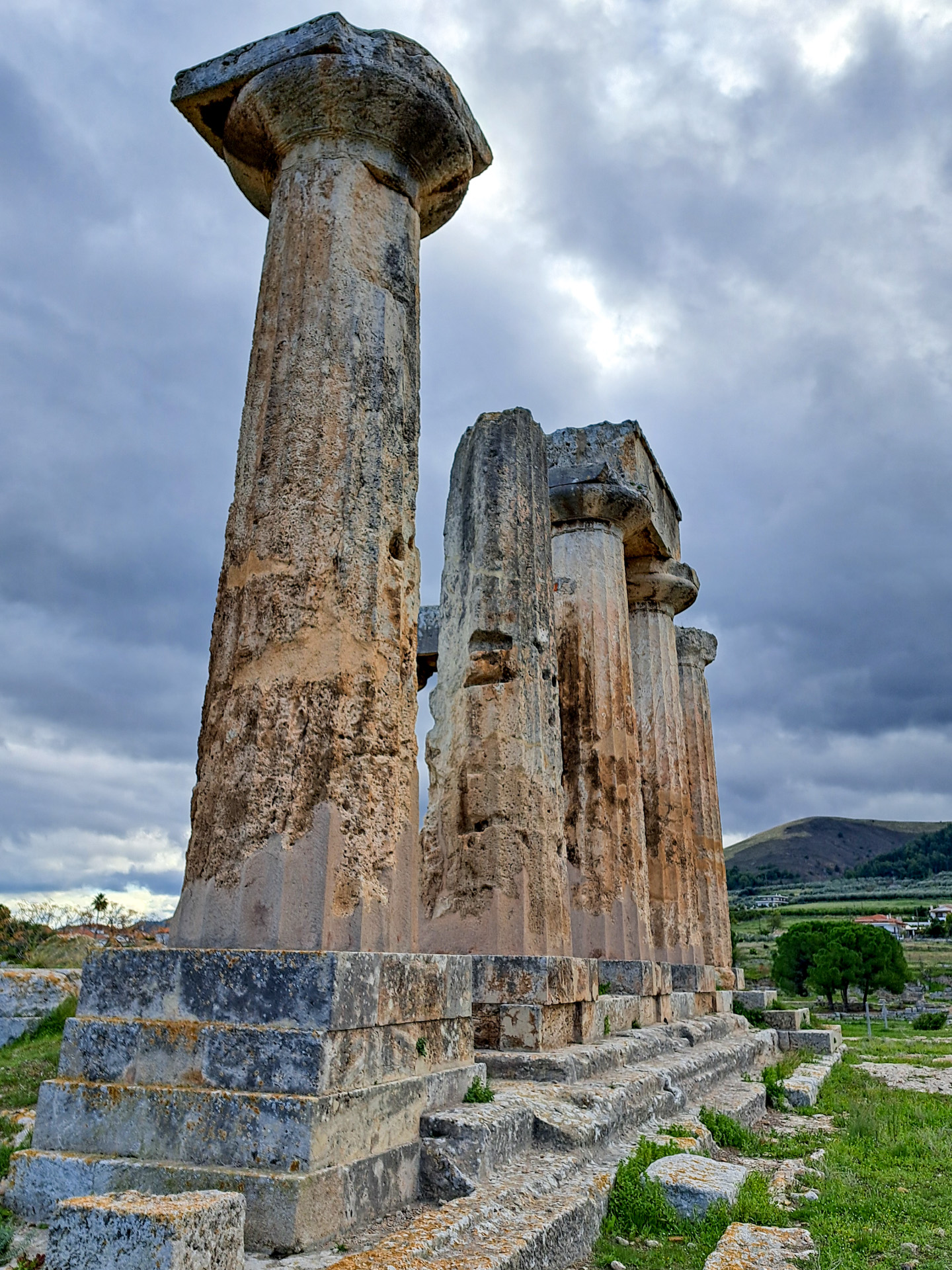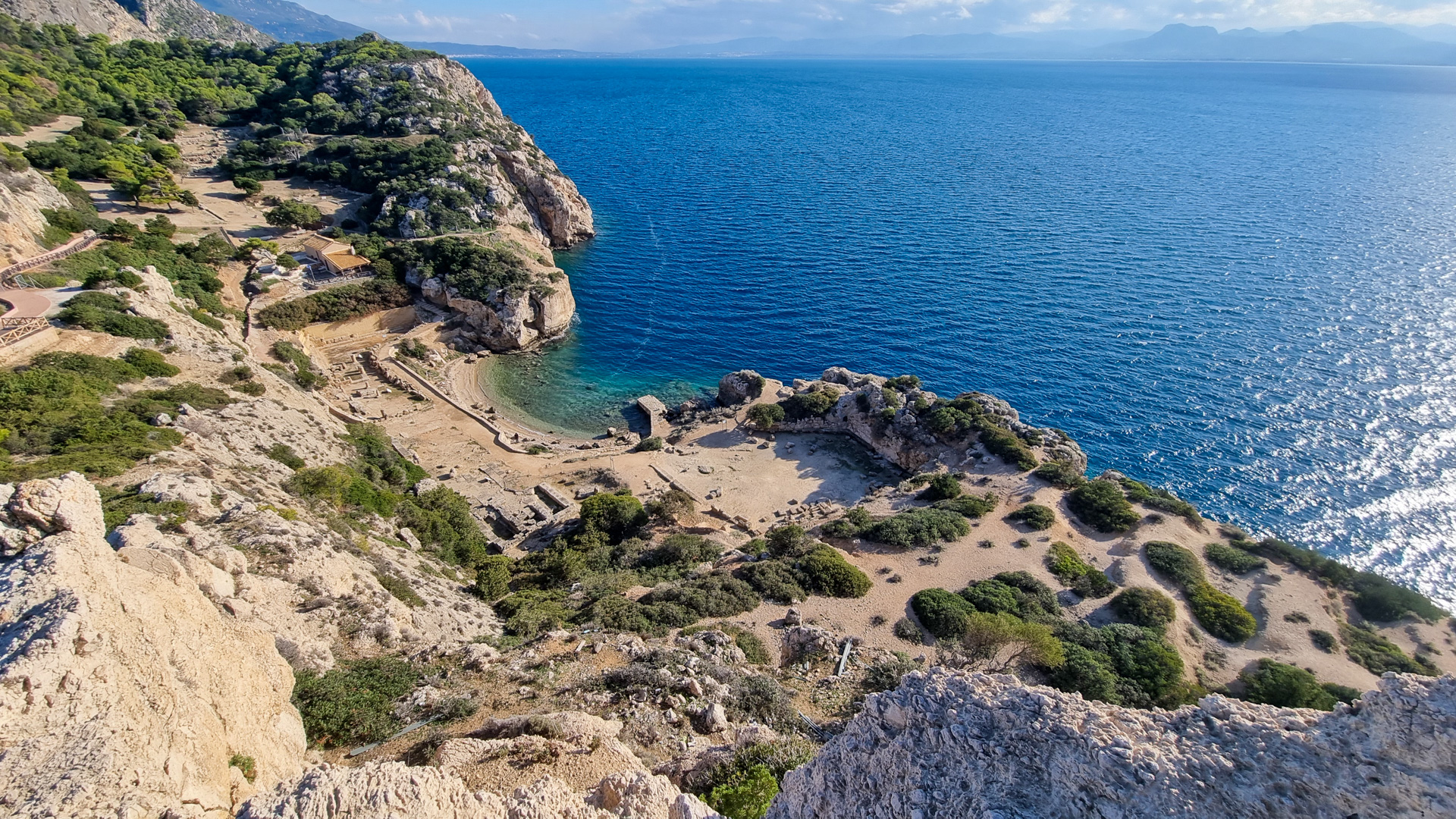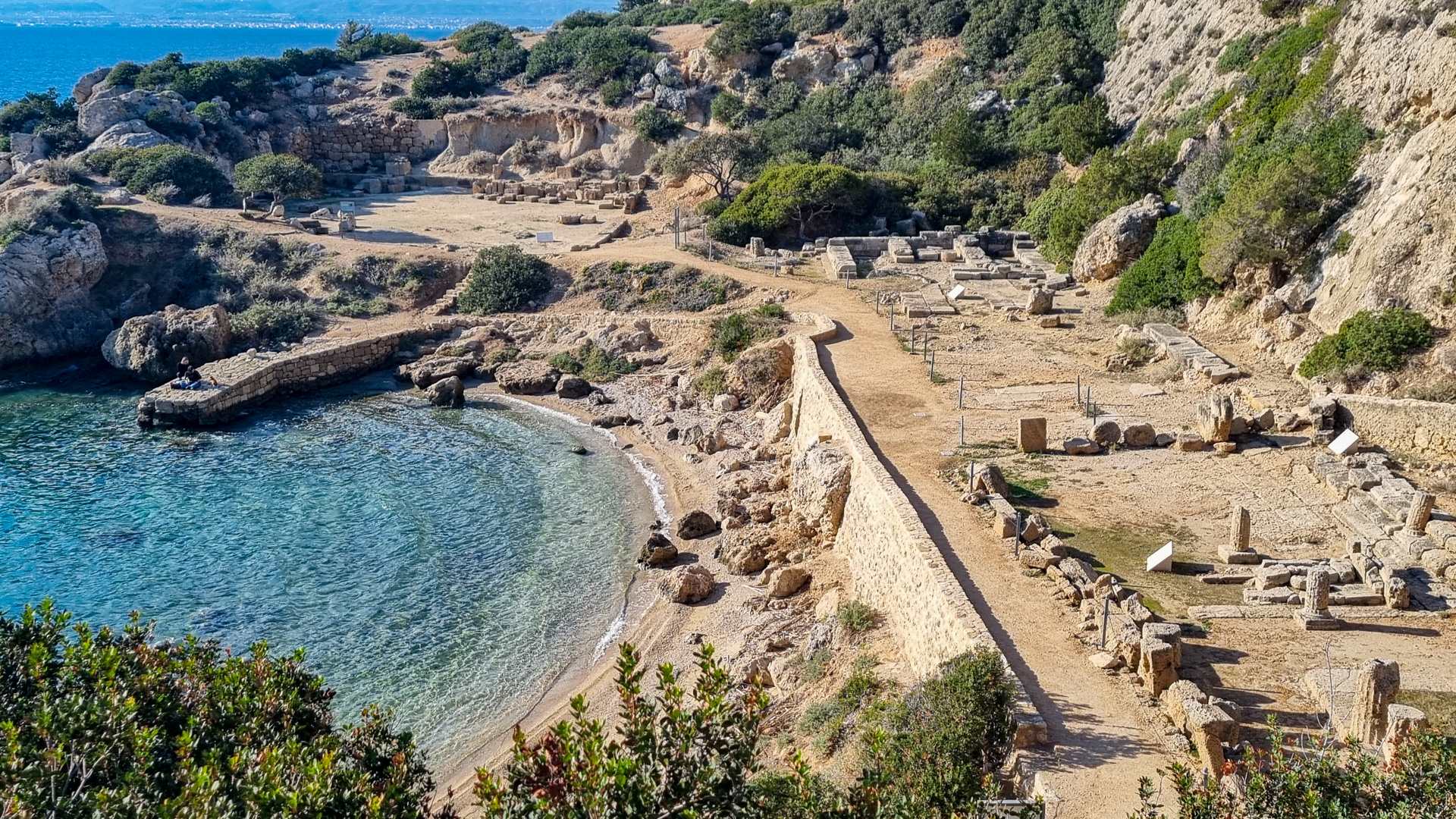 Machen wir erst einmal einen Sprung über den Kanal von Korinth auf das Festland. Der Kanal wird gerade saniert, so dass leider keine Schiffe passieren. Wir fahren über Loutraki zum Kap Ireon. Dort befindet sich das Heraion von Perachora (Ηραίο Περαχώρας), ein Heiligtum der Göttin Hera. Neben dem Hera-Tempel wurden die Überreste unter anderem einer L-förmigen Stoa, einer großen Zisterne und eines zweiten möglichen Tempels gefunden. Man schätzt den Beginn des Baus auf das 9. Jahrhundert vor Christus. Die Anlage liegt in einer außergewöhnlich schönen Bucht, die Bewachung erfolgt durch zahlreiche schnurrende Vierbeiner.
