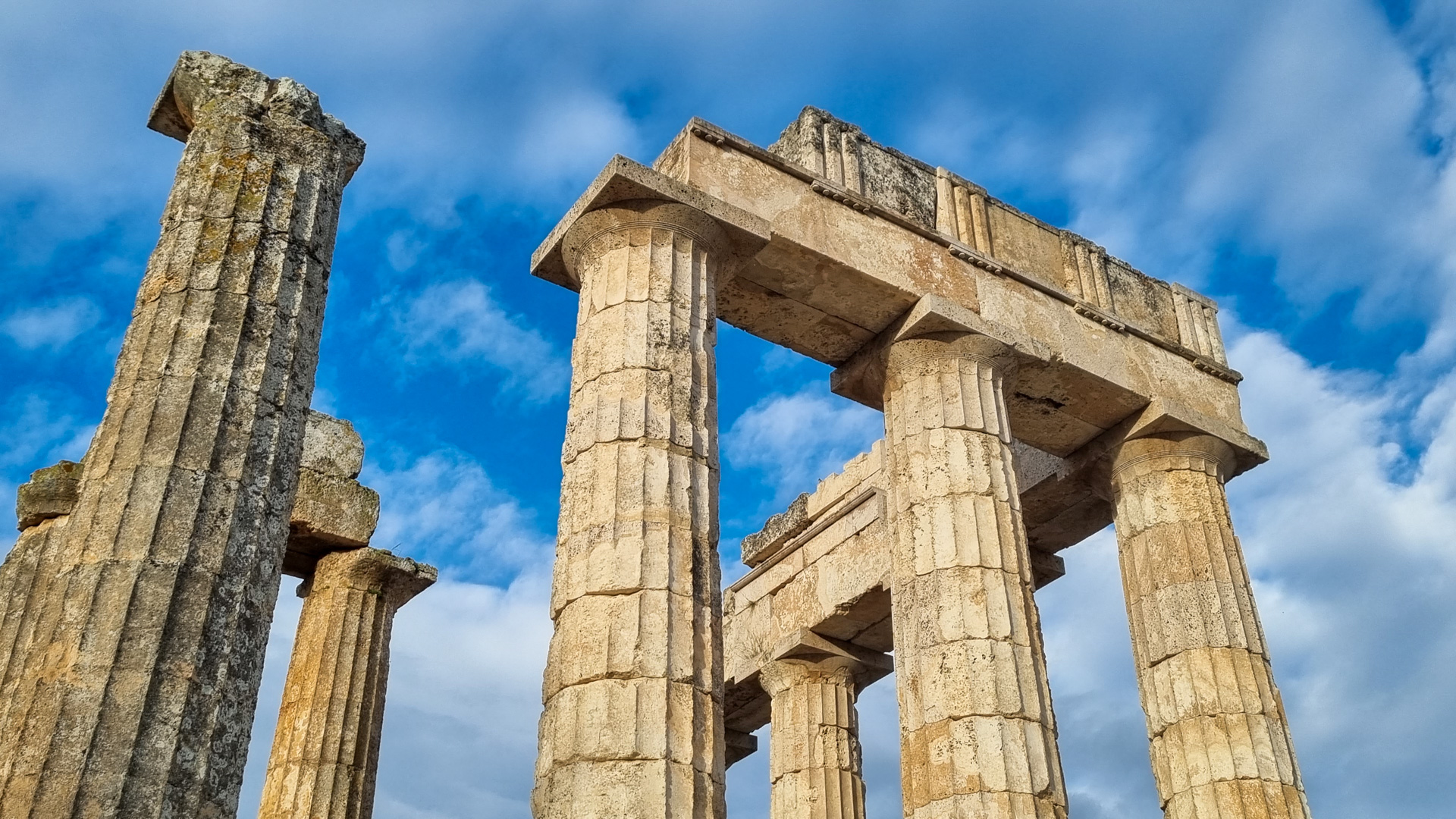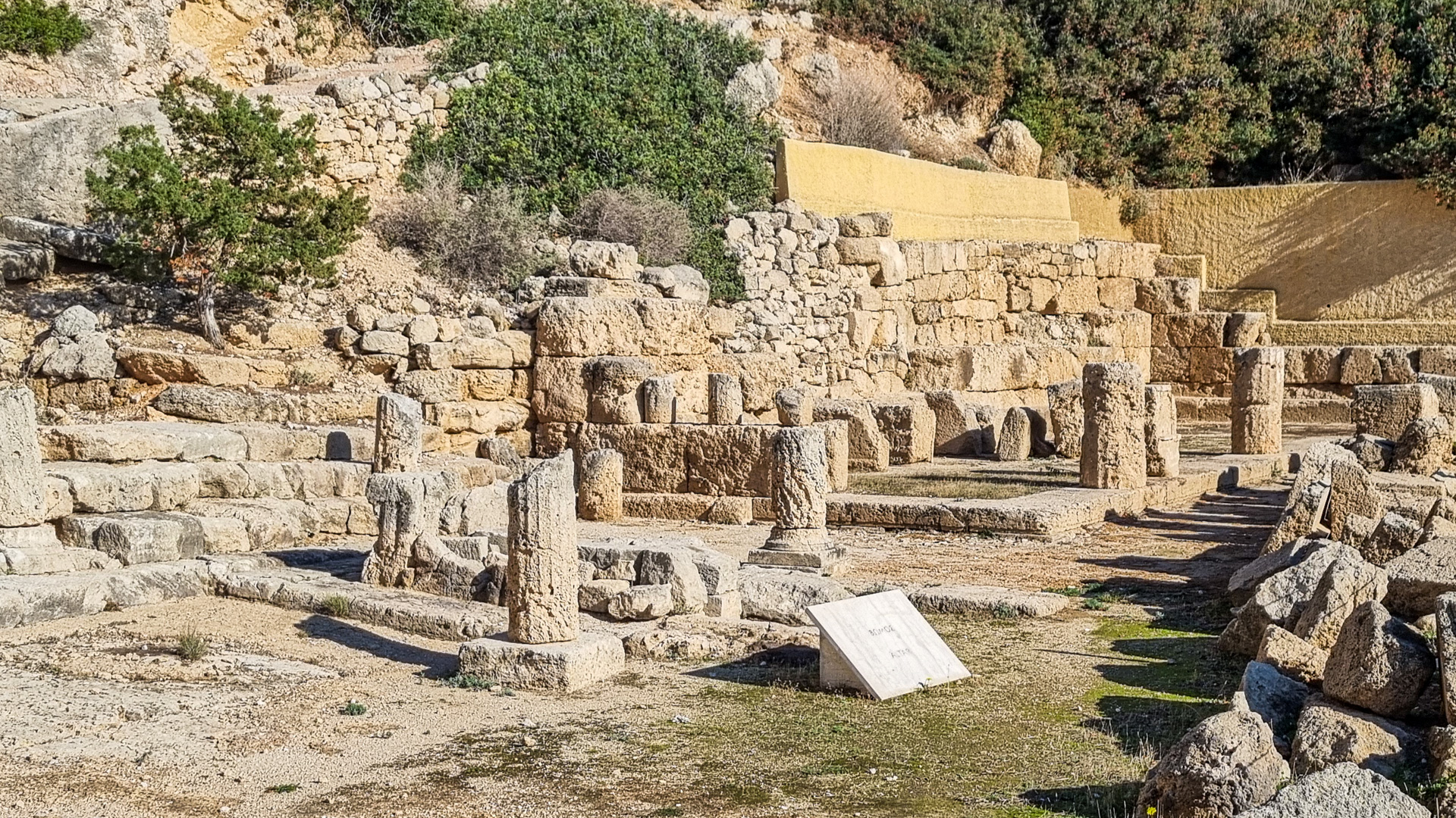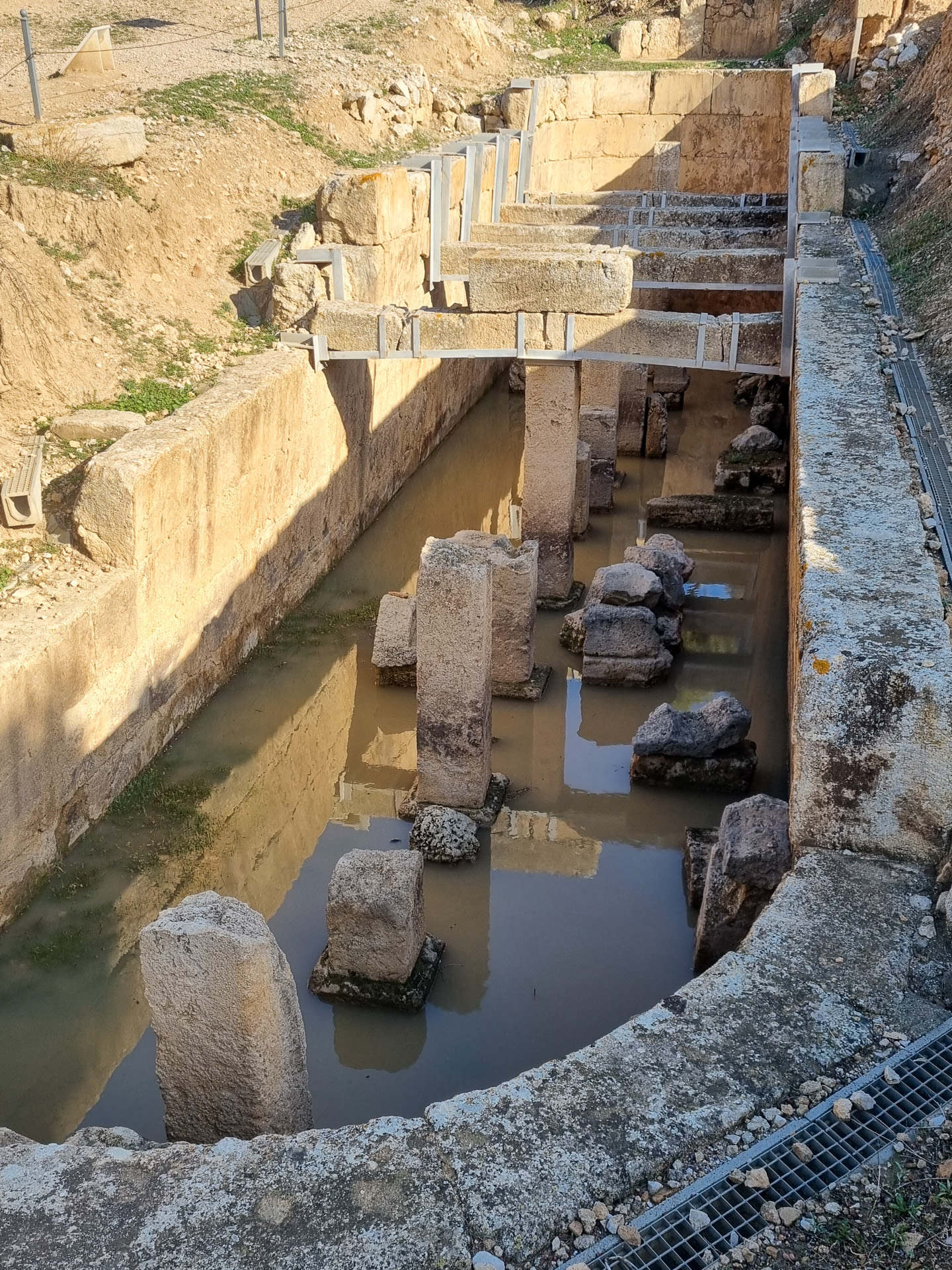 Machen wir erst einmal einen Sprung über den Kanal von Korinth auf das Festland. Der Kanal wird gerade saniert, so dass leider keine Schiffe passieren. Wir fahren über Loutraki zum Kap Ireon. Dort befindet sich das Heraion von Perachora (Ηραίο Περαχώρας), ein Heiligtum der Göttin Hera. Neben dem Hera-Tempel wurden die Überreste unter anderem einer L-förmigen Stoa, einer großen Zisterne und eines zweiten möglichen Tempels gefunden. Man schätzt den Beginn des Baus auf das 9. Jahrhundert vor Christus. Die Anlage liegt in einer außergewöhnlich schönen Bucht, die Bewachung erfolgt durch zahlreiche schnurrende Vierbeiner.