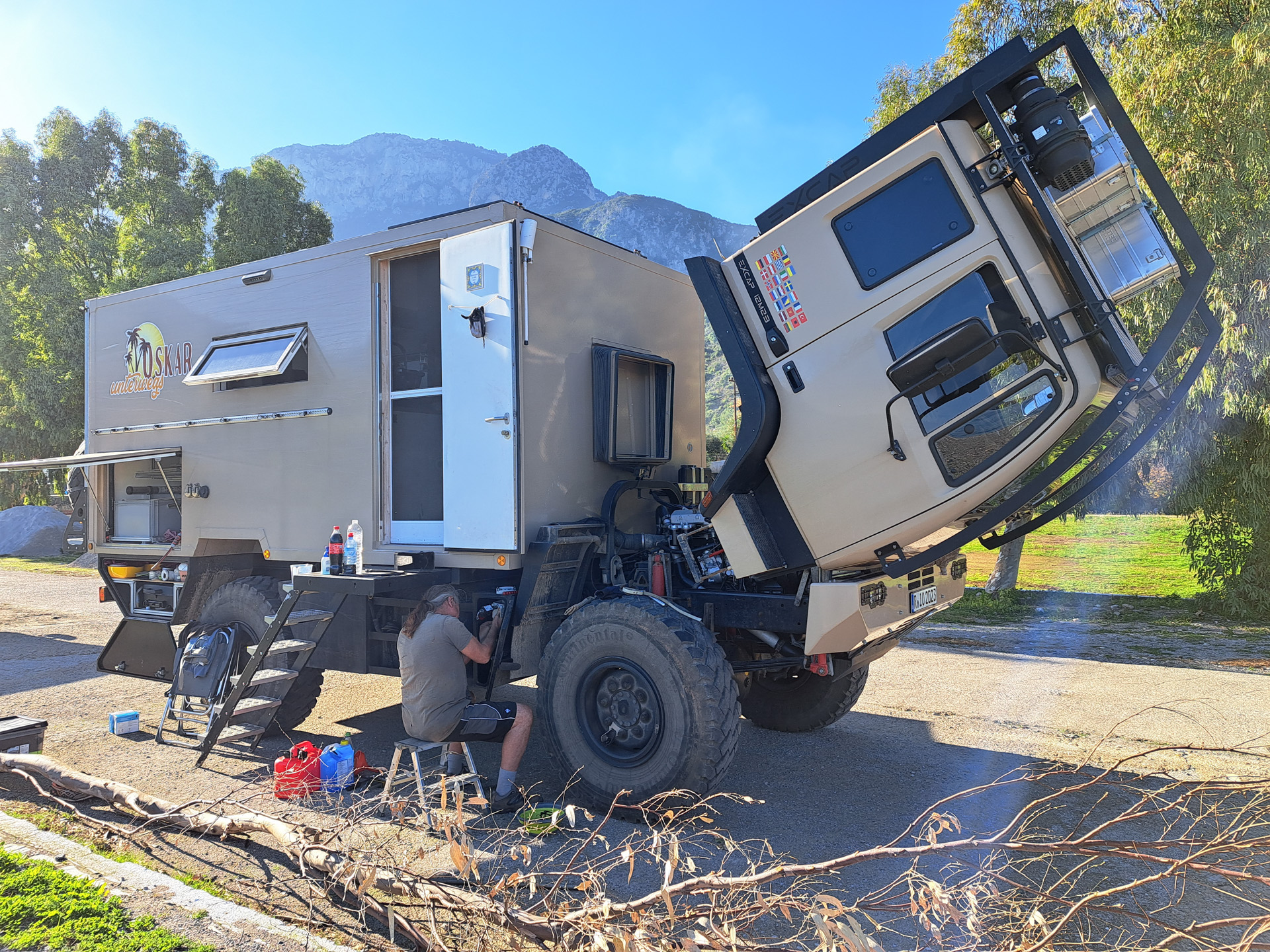 Gleichzeitig haben wir auf Ratschlag unseres Freundes Kurt den ADAC kontaktiert. Auf die Idee wären wir tatsächlich nicht gekommen. Aber: Ein Mitarbeiter der Zentrale in Thessaloniki hat nach unserer Anfrage per E-Mail innerhalb kürzester Zeit zurückgerufen. Er versucht zunächst, ein Abschleppen des LKWs zu organisieren, falls wir das Problem nicht lösen können. Anruf eine halbe Stunde später: Abschleppen ist doch nicht möglich aufgrund unserer Position: Umgeben von Bergen mit engen Serpentinstraßen.