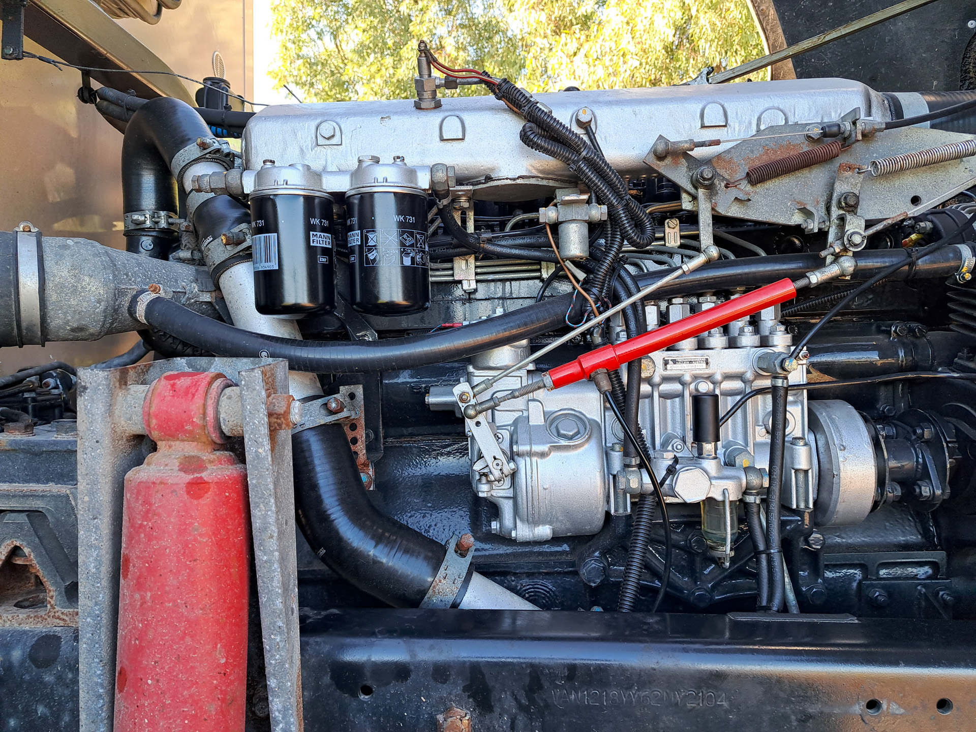 Wir beginnen mit der Überprüfung, soweit dies für uns möglich ist. Einen Ersatz für eine defekte Einspritzpumpe haben wir nicht. In dem Fall müssen wir uns hier häuslich niederlassen.