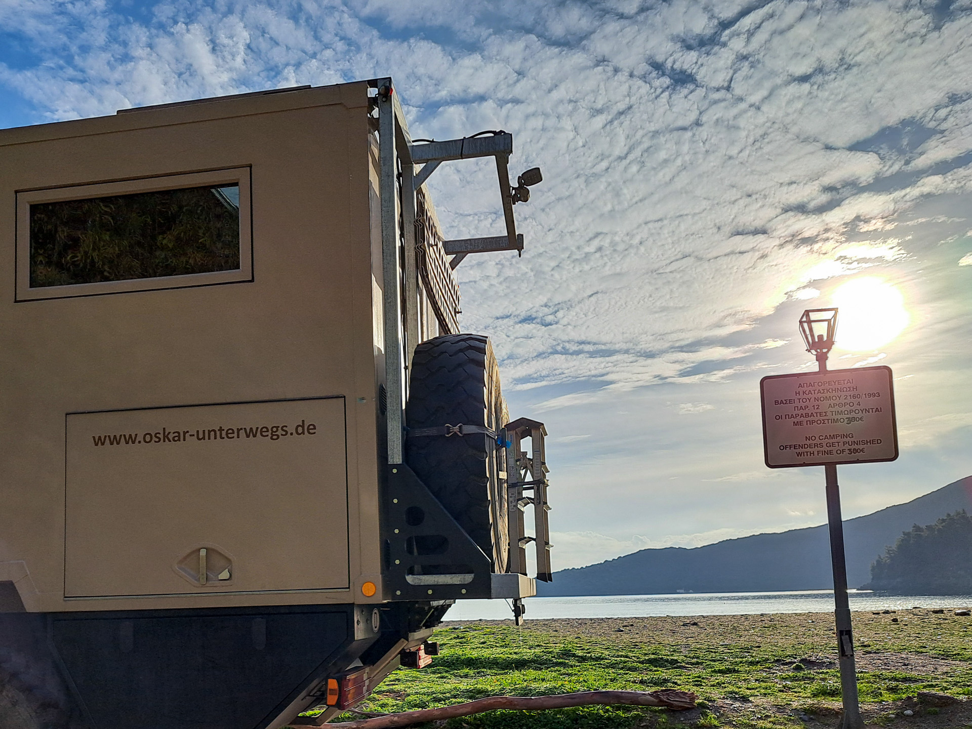 Wir sind überglücklich. Anja fragt nochmals nach, ob wir auch wirklich über die hohen Berge kommen. Aber klar, kein Problem, der LKW wird nicht stehen bleiben, sagt er optimistisch. Wir bedanken uns überschwänglich und er verabschiedet sich in seinen wohlverdienten Feierabend. Wir beschließen, erst am nächsten Morgen zu fahren, es ist schon spät geworden. Bei der Abfahrt bemerken wir, dass wir direkt vor einem großen Schild geparkt haben mit dem Hinweis „No camping – offenders get punished with fine of 300 €“.