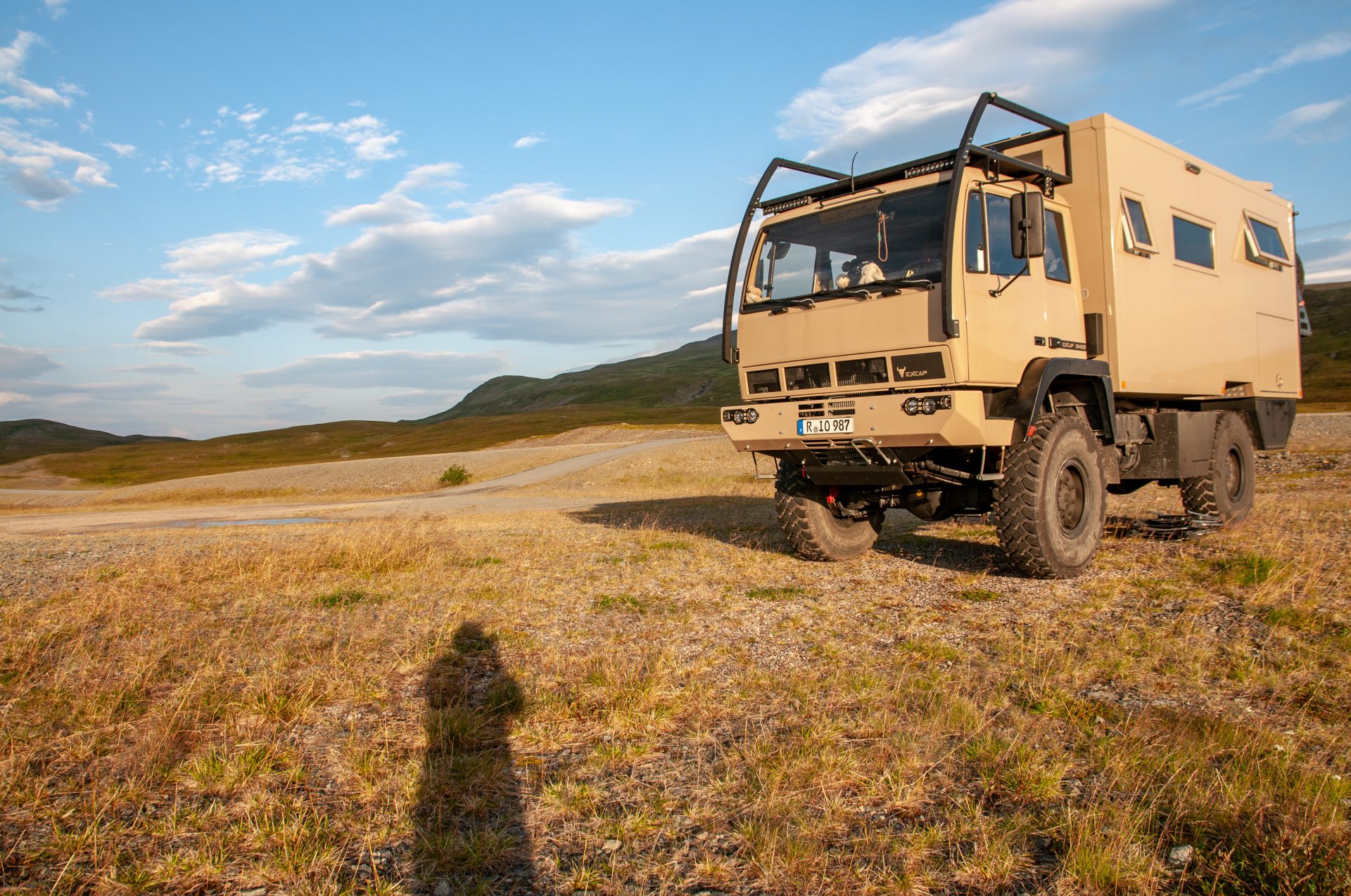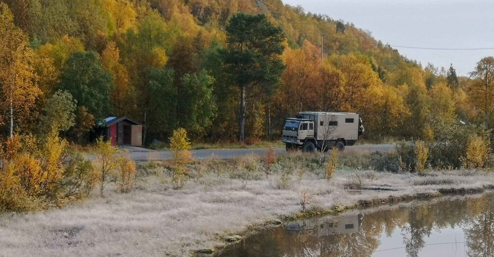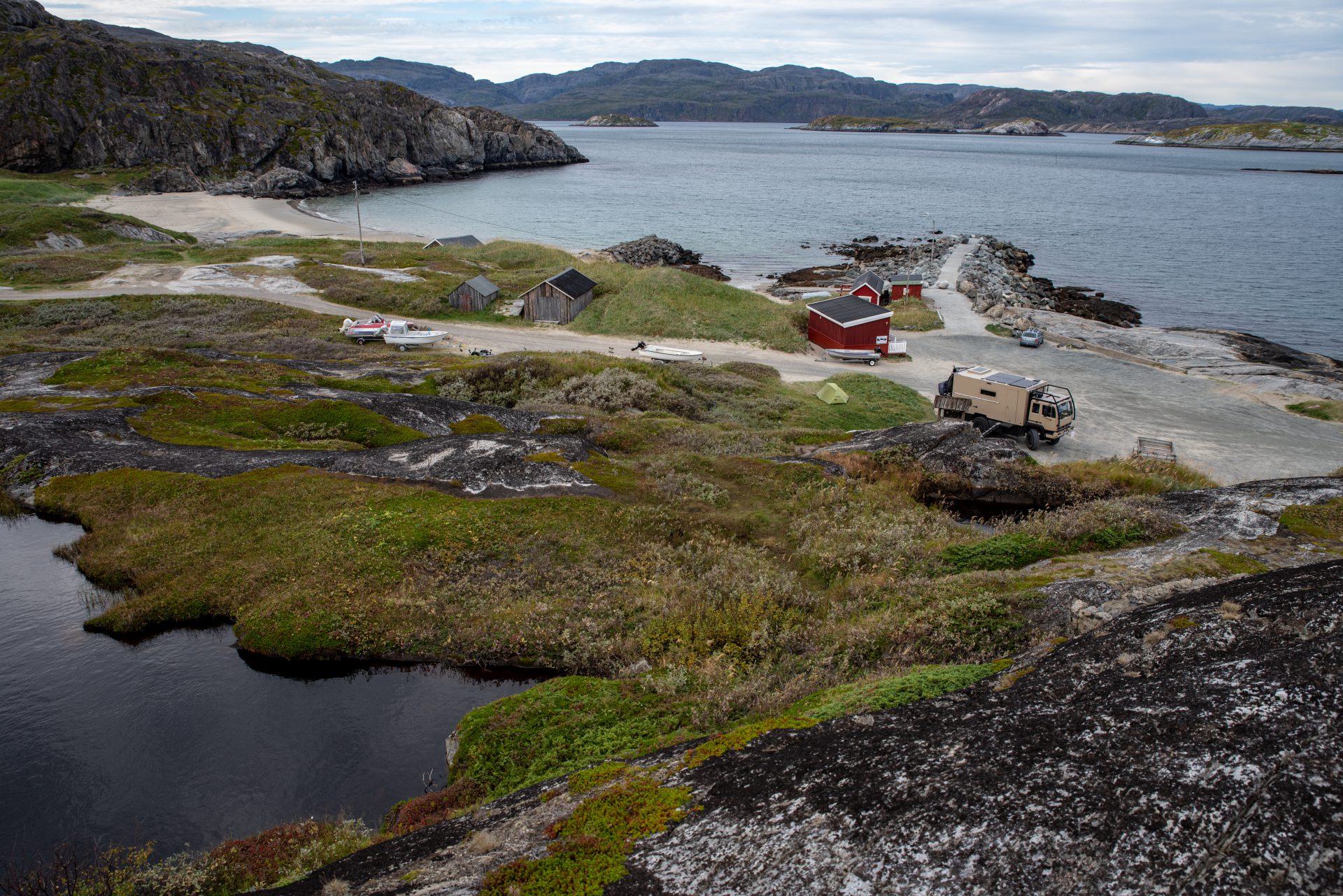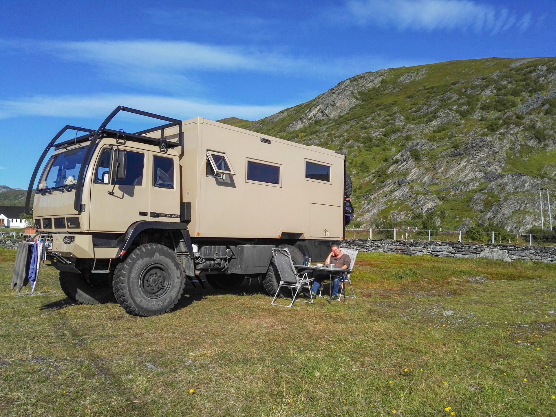 In Lebesby machen wir eine kurze Pause und lernen Max und Kathi kennen, begleitet von 2 süßen Hunden. Die zwei sind mit einem ehemaligen Schweizer Militärfahrzeug unterwegs und kommen gerade aus Russland. Sie sind die Runde, die wir planen, also von Murmansk Richtung Sankt Petersburg zu fahren, von Süden nach Norden gefahren. Bisher haben wir noch niemanden getroffen, der aus Russland kommt, die meisten fahren über Finnland, und so freuen wir uns sehr über die vielen wertvollen Tipps und sind nun wirklich auf Russland gespannt.