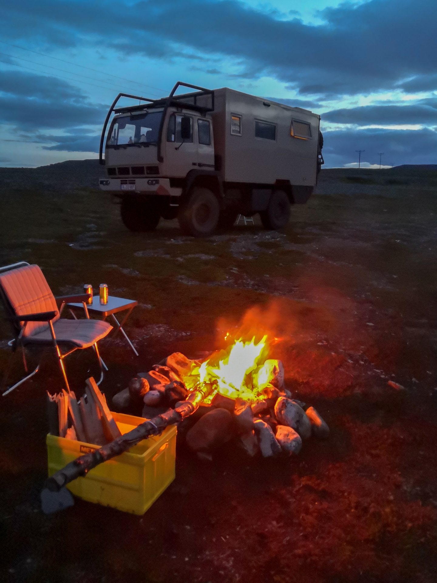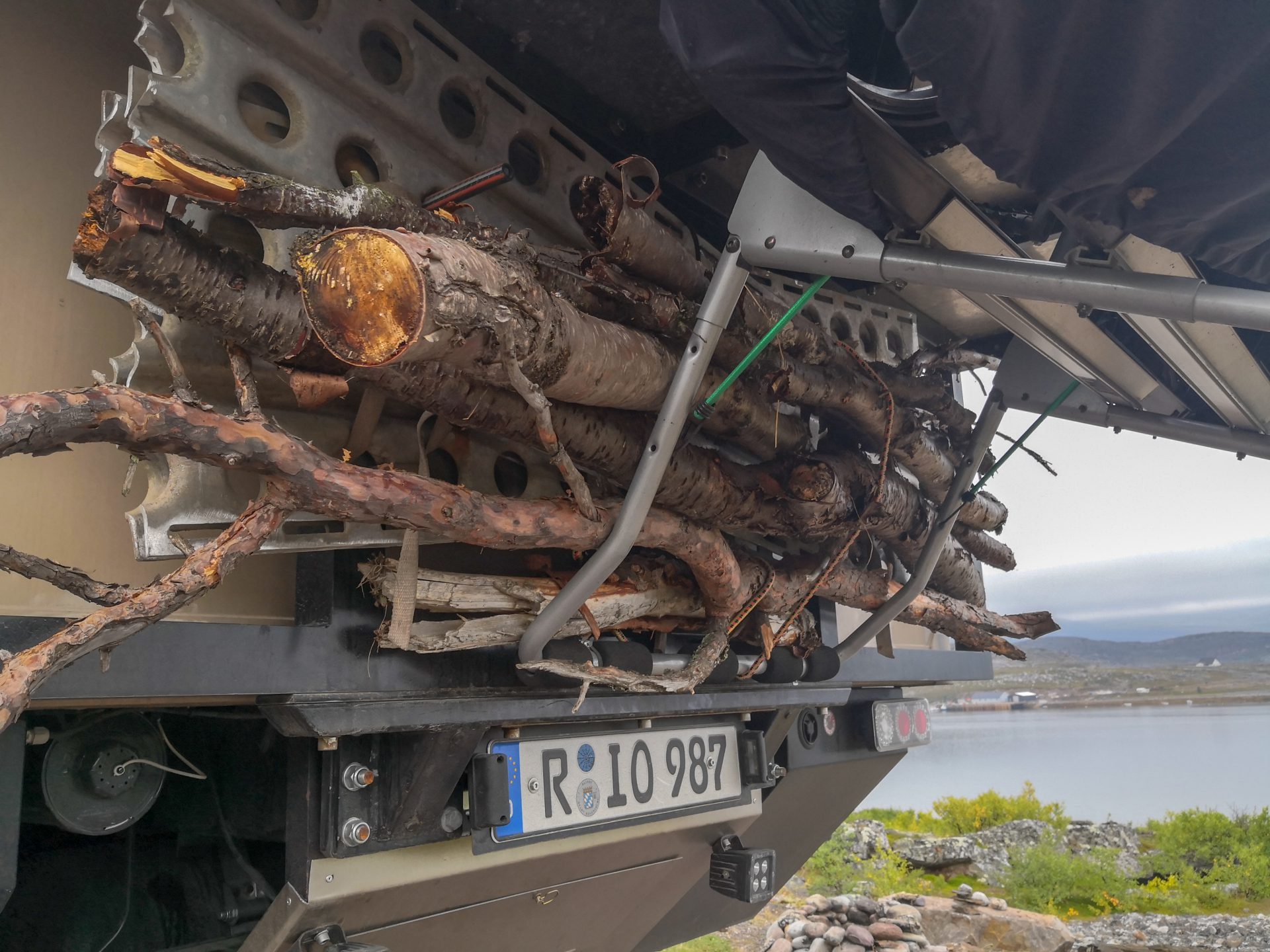 Sodann geht’s weiter Richtung Karasjok, der Hauptstadt der norwegischen Samen. Wir übernachten ausnahmsweise mal wieder auf einem Campingplatz, da ich mich immer noch um einige Angelegenheiten aus meinem früheren Arbeitsleben kümmern muss und dringend WLAN brauche! In solchen Momenten hält man kurz inne und freut sich über die unendliche Freiheit, die man als Weltenbummler genießen darf. Am nächsten Tag fahren wir gemütlich die E6 an der finnischen Grenze weiter, dieser Streckenabschnitt nennt sich eben Arcticroute. Wir sehen unendlich viele Birkenpilze auf der Fahrt. Aber jedes Mal, wenn wir anhalten und welche suchen, sind sie verschwunden!!! Frechheit. Immerhin sammeln wir so genügend Feuerholz und haben auch schon einen sehr geeigneten Feuerholztransportplatz an Oskar entdeckt. Bei Torhop finden wir einen wunderschönen Platz zum Übernachten und das Lagerfeuer am Abend darf natürlich nicht fehlen.