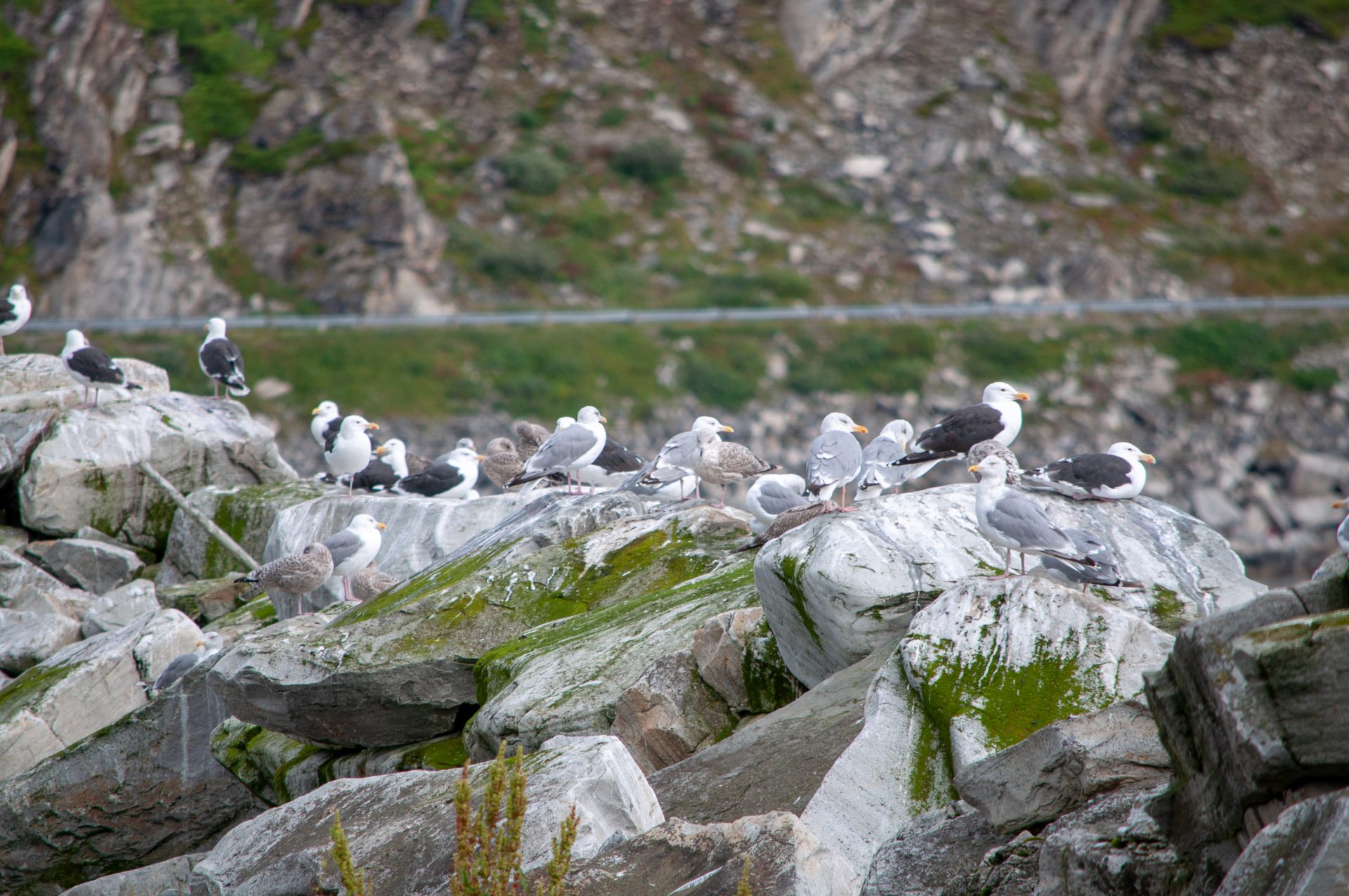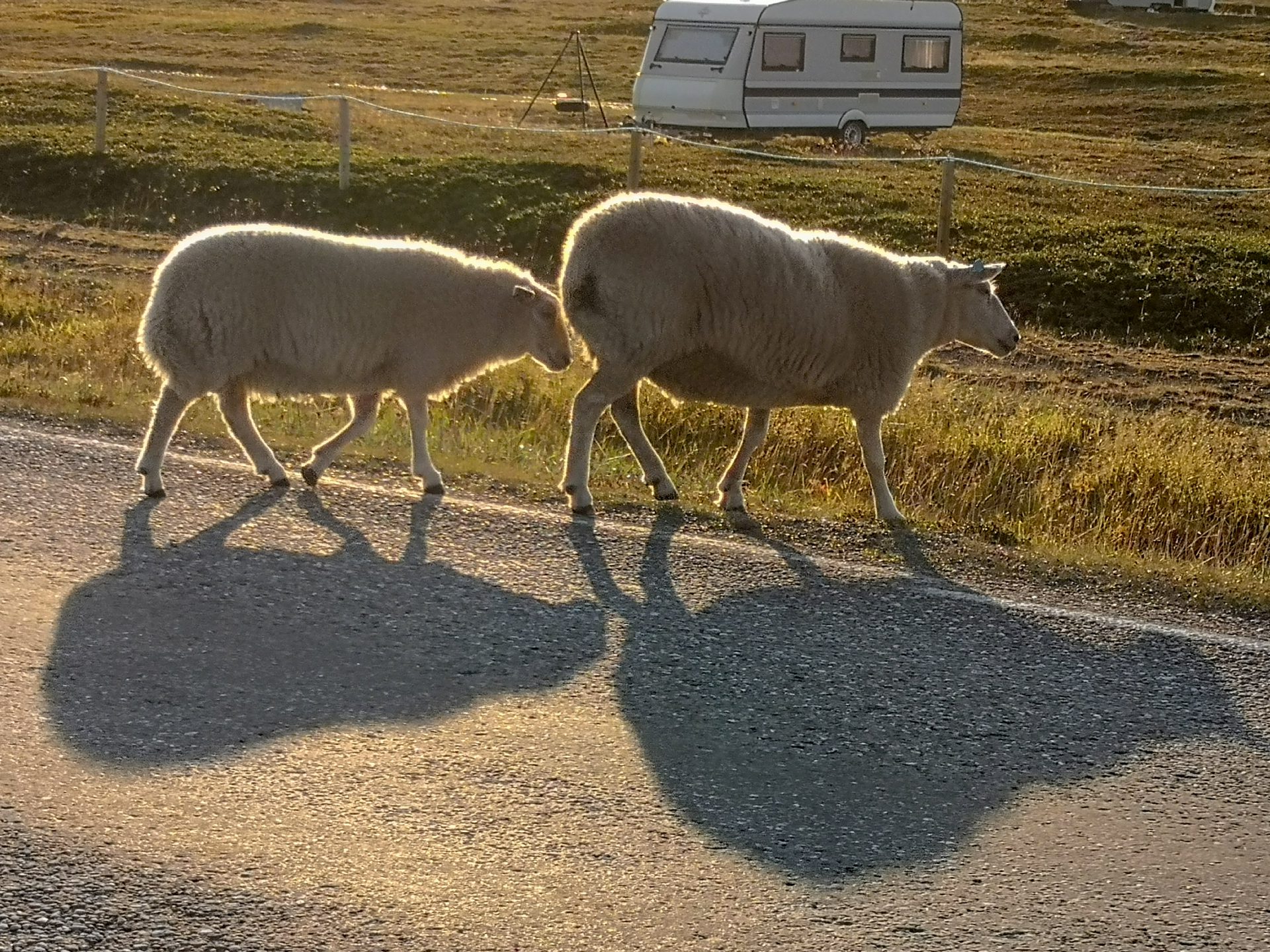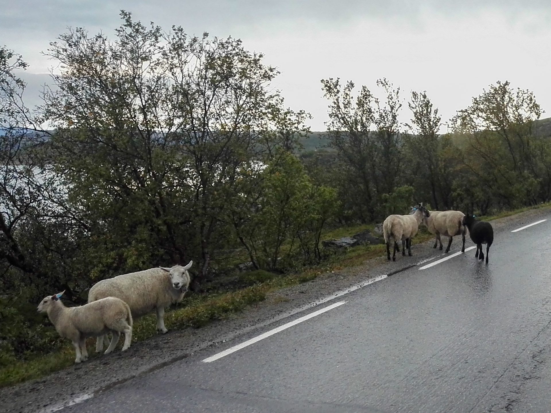 Viele Tiere begleiteten unseren Weg, vor allem im Norden. Wilde Kreaturen wie die diebische Elster, angriffslustige Möwen, als hübsche Raupe getarnte Schädlinge und der gefährliche Bacalao! Viele wunderschöne Adler, die sich nur sehr ungern fotografieren lassen wollten. Schafe, Rentiere und Kühe immer und überall, vor allem mitten auf der Straße, wahrscheinlich die dem Touristen nicht bekannten Symbole für den Beginn einer verkehrsberuhigten Zone. Glücklicherweise werden wir allenthalben auf die Gefahr dieser Hufer hingewiesen.