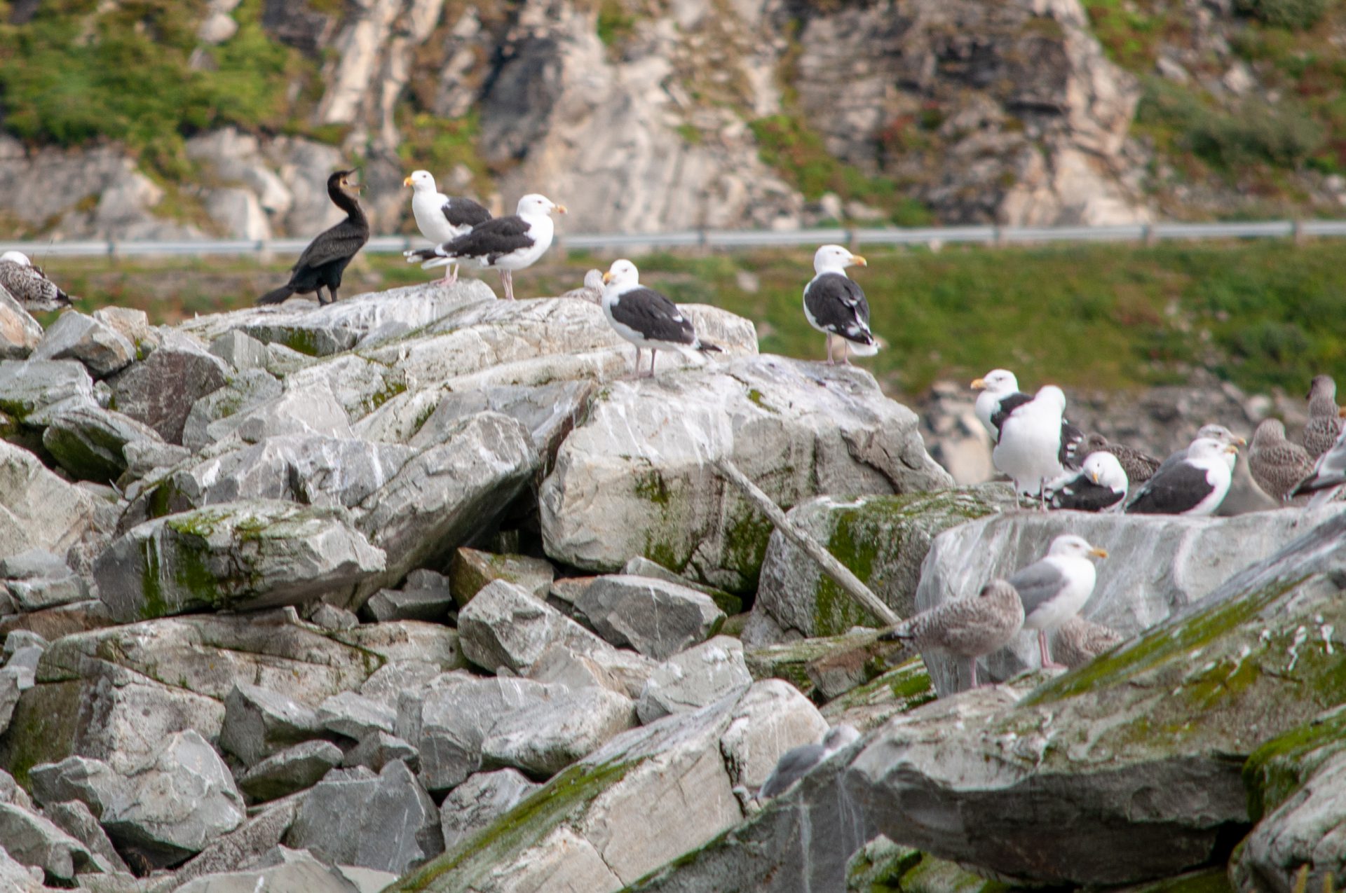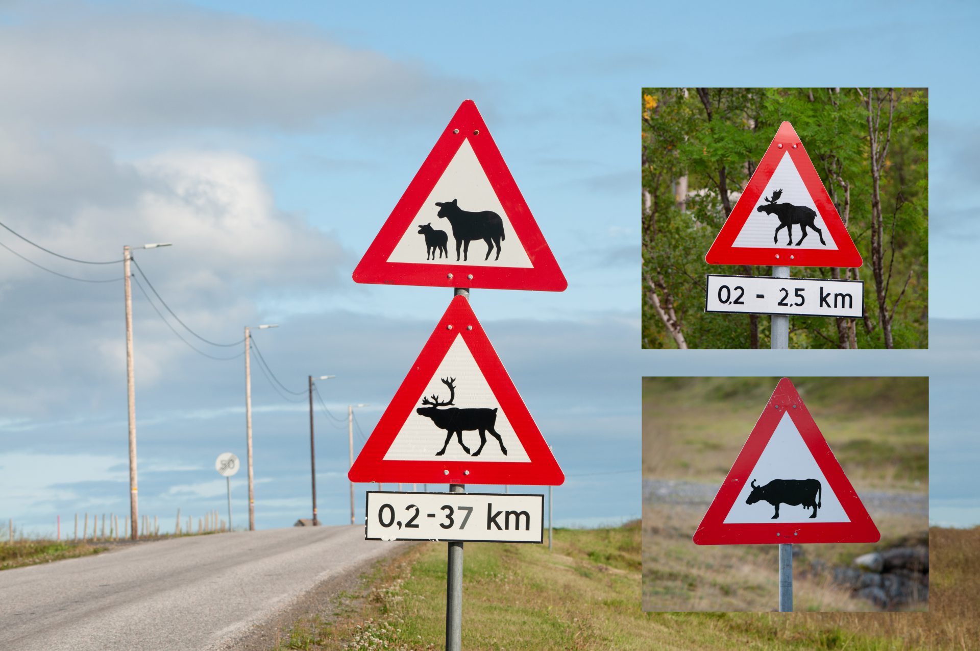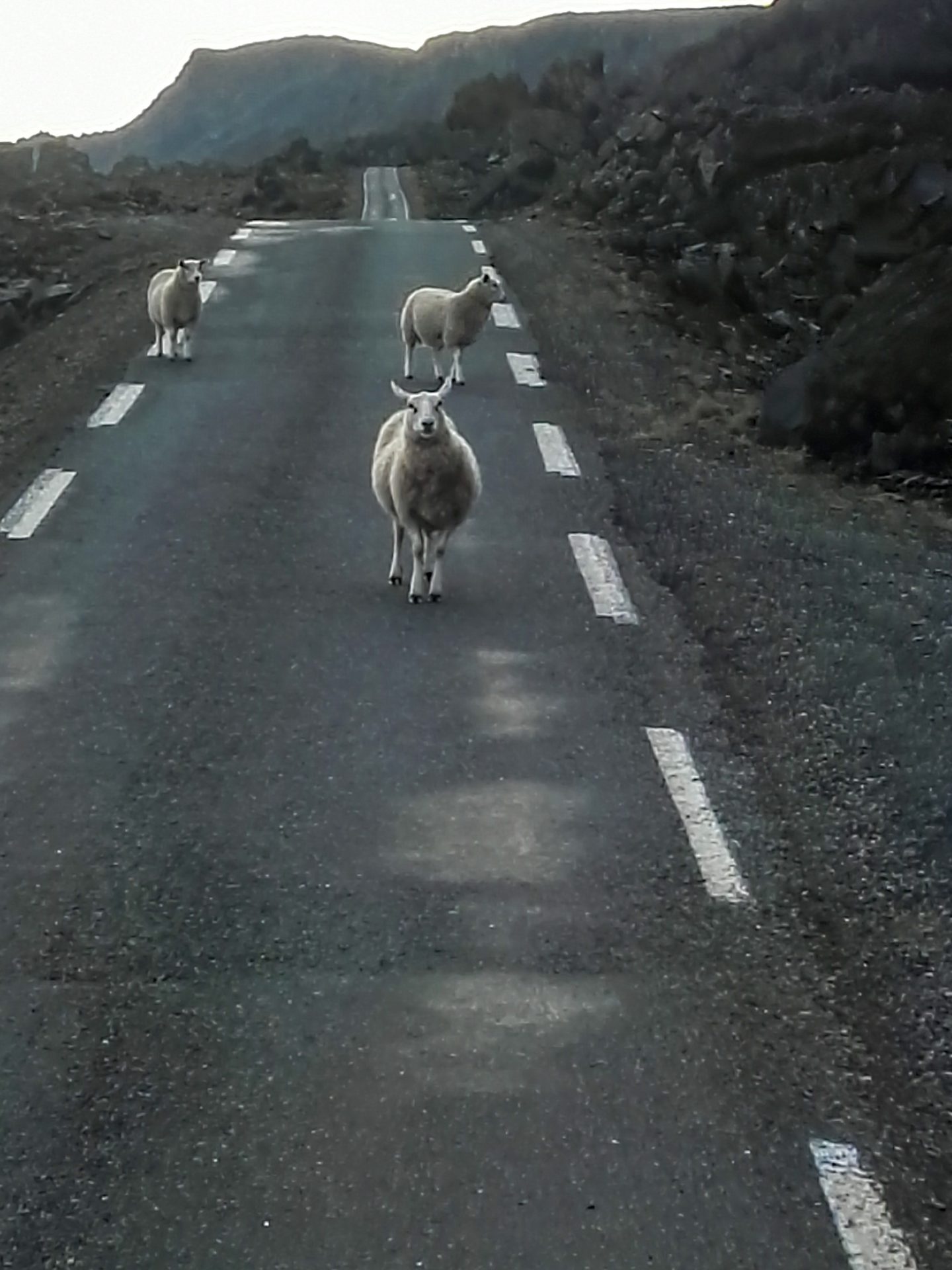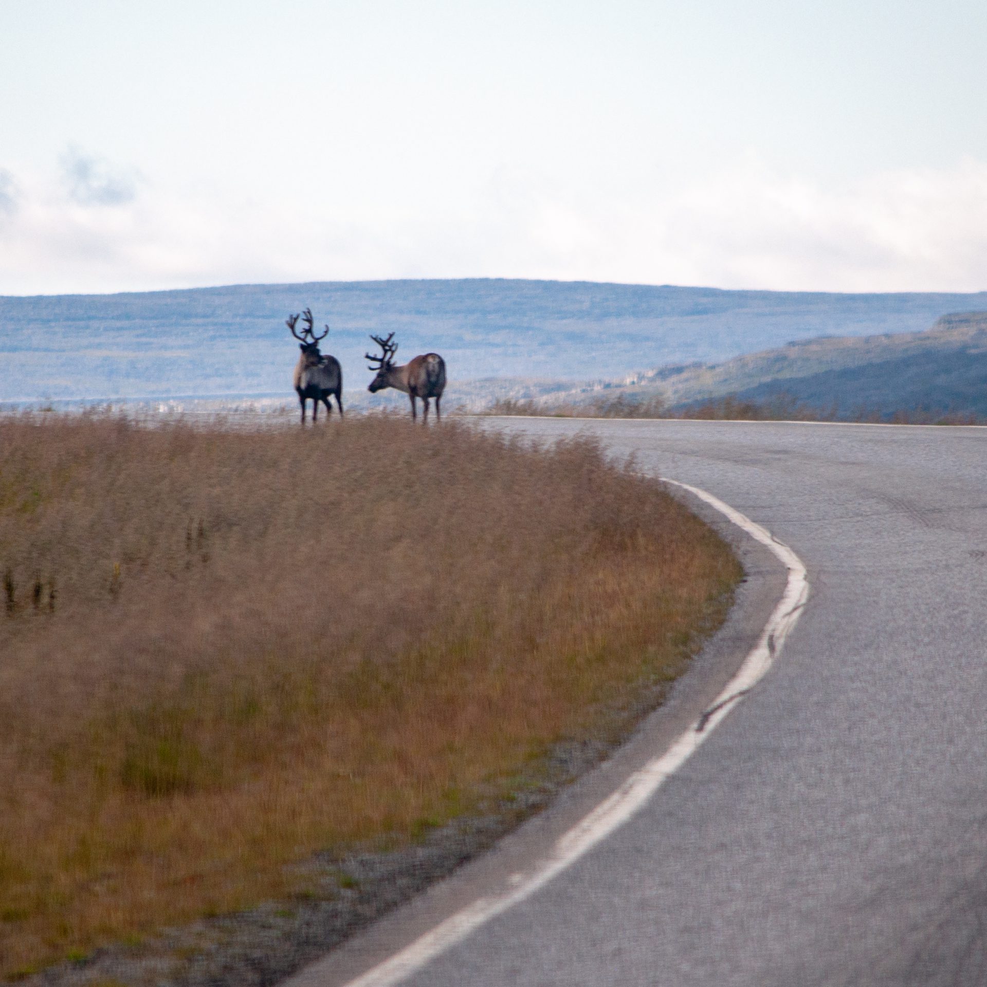 Viele Tiere begleiteten unseren Weg, vor allem im Norden. Wilde Kreaturen wie die diebische Elster, angriffslustige Möwen, als hübsche Raupe getarnte Schädlinge und der gefährliche Bacalao! Viele wunderschöne Adler, die sich nur sehr ungern fotografieren lassen wollten. Schafe, Rentiere und Kühe immer und überall, vor allem mitten auf der Straße, wahrscheinlich die dem Touristen nicht bekannten Symbole für den Beginn einer verkehrsberuhigten Zone. Glücklicherweise werden wir allenthalben auf die Gefahr dieser Hufer hingewiesen.