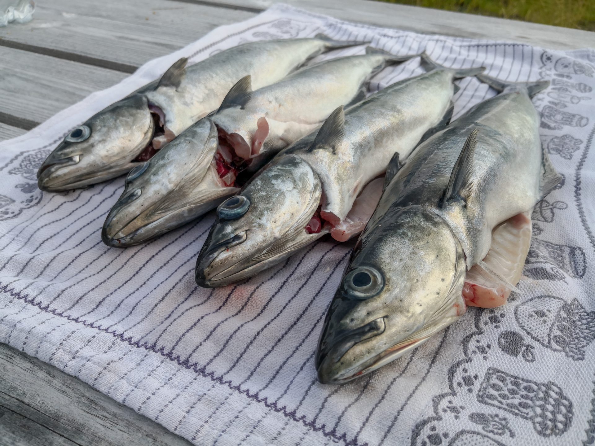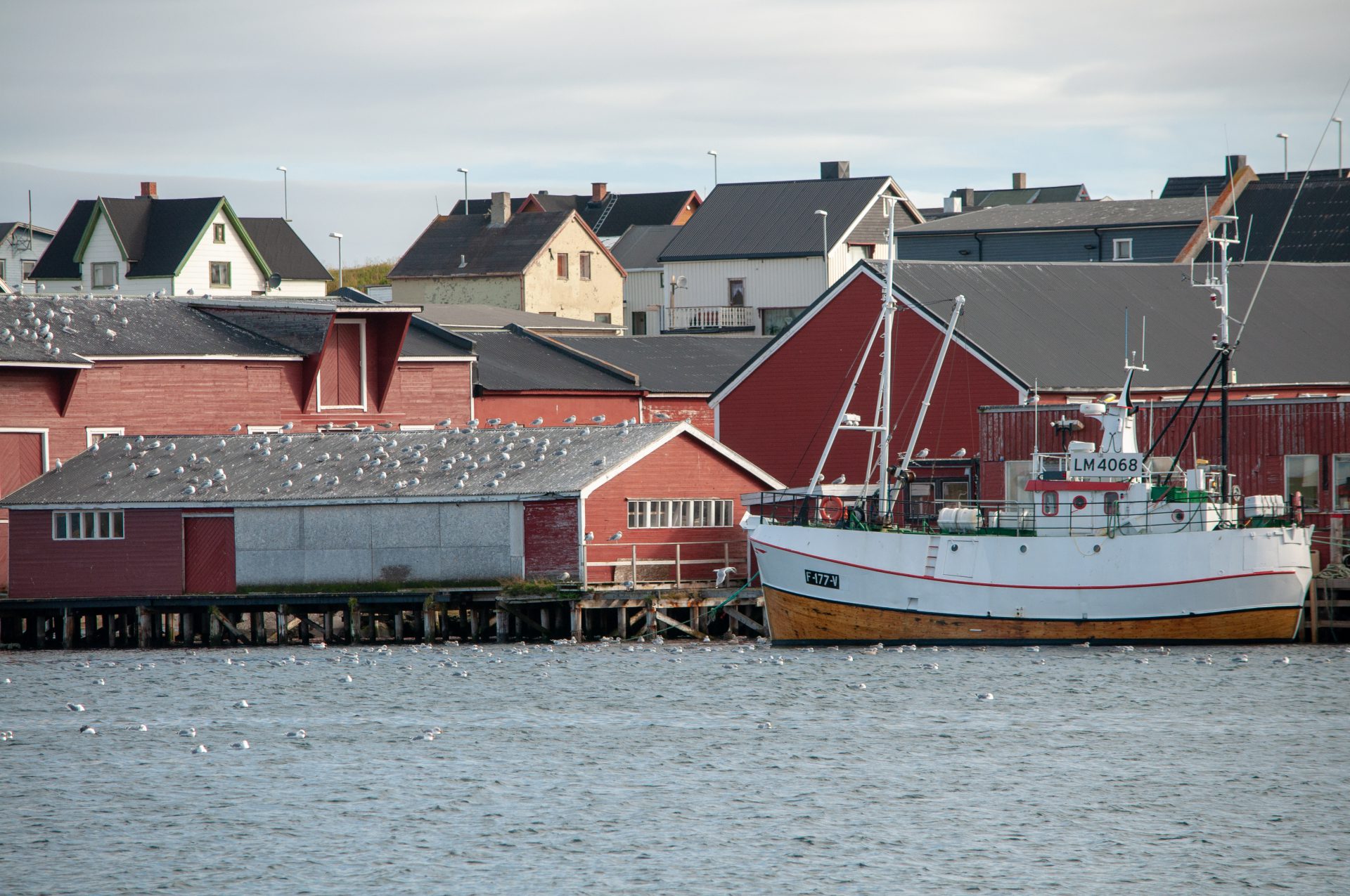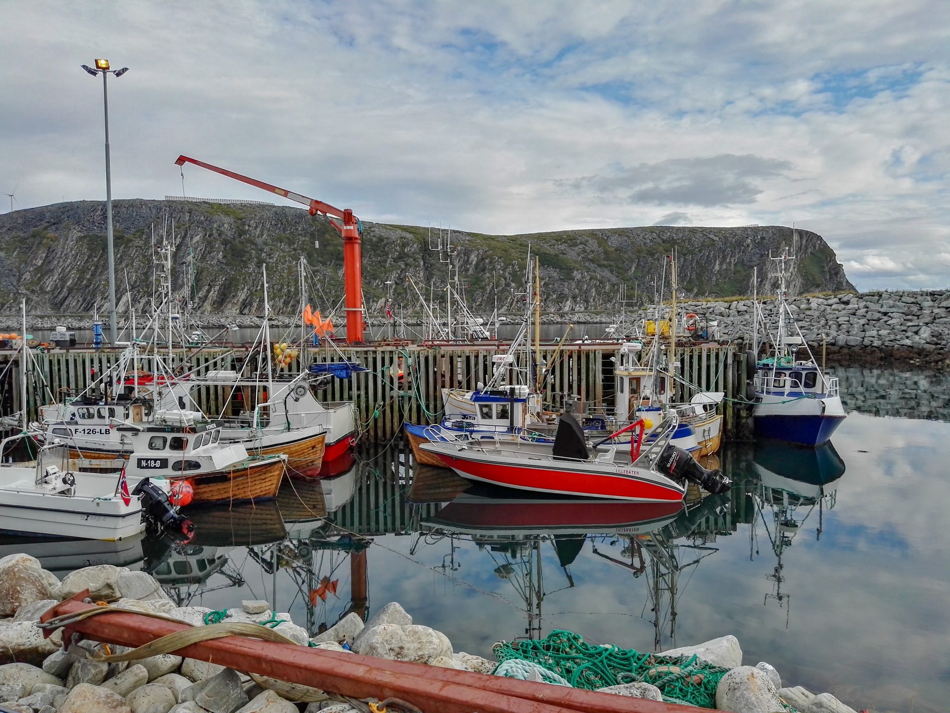 Auf dem Weg zurück nach Mehamn am nächsten Tag ärgern wir uns, dass wir auf der Strecke von Mehamn nach Gamvik nicht fotografiert haben. Wir dachten, da fahren wir sowieso nochmal durch und wir genießen jetzt einfach die Landschaft. Heute aber ist es regnerisch und vor allem so neblig, dass man kaum etwas sieht. Das ist zwar auch sehr beeindruckend, aber ein paar Fotos bei Sonnenschein wären schön gewesen. Wir fahren die 888 zurück und dann auf die Westseite nach Kjøllefjord. Das ist ein nettes Städtchen, aber zum Übernachten finden wir nichts. Ein Stück zurück führt eine kleine Straße nach Dyfjord und dort finden wir einen traumhaften Stellplatz oberhalb des Hafens mit einer kleinen Bank und einem Tisch davor. Gleich kommen wir mit einem jungen Fischer ins Gespräch, der natürlich alles über unseren Oskar wissen möchte. Er erklärt, dass er auf einem der Krabbenkutter arbeitet und wenn wir wollen, dann kann er uns später ein bisschen Beifang vorbeibringen. Gerne wollen wir das! Wir genießen den Tag und sehen den jungen Mann nicht wieder. Dafür begrüßen uns zwei Delfine, direkt am Hafen! Natürlich hatte ich so schnell die Kamera nicht griffbereit und genieße einfach nur den Anblick der beiden. Jochen ist derzeit beim Fischen und bringt sage und schreibe 4 Köhler mit nach Hause! Was für ein schöner Tag.