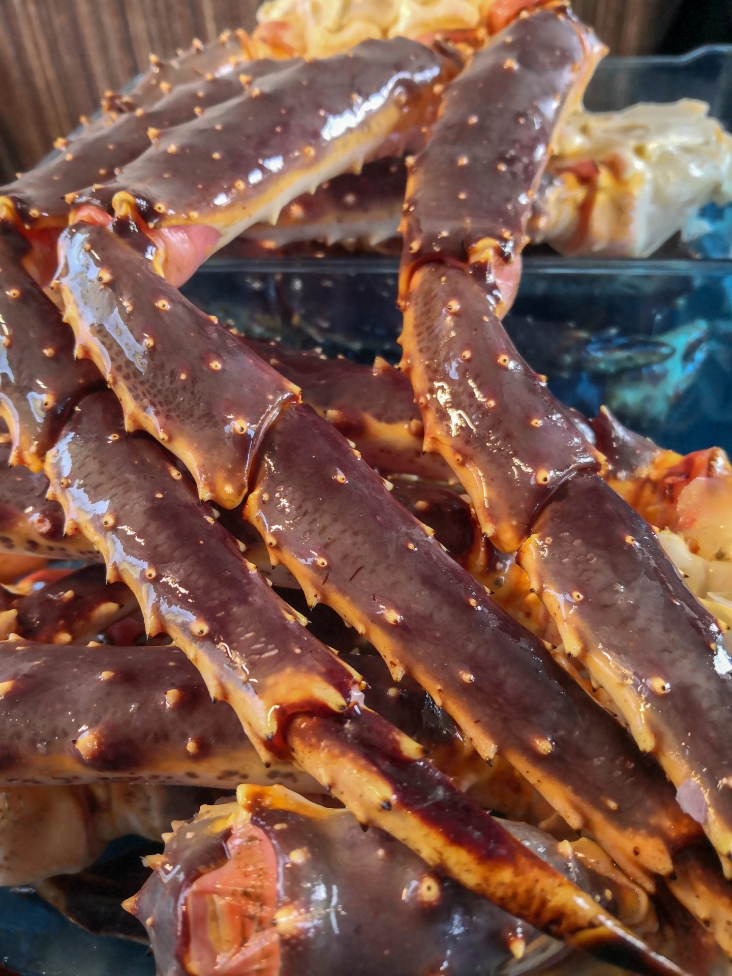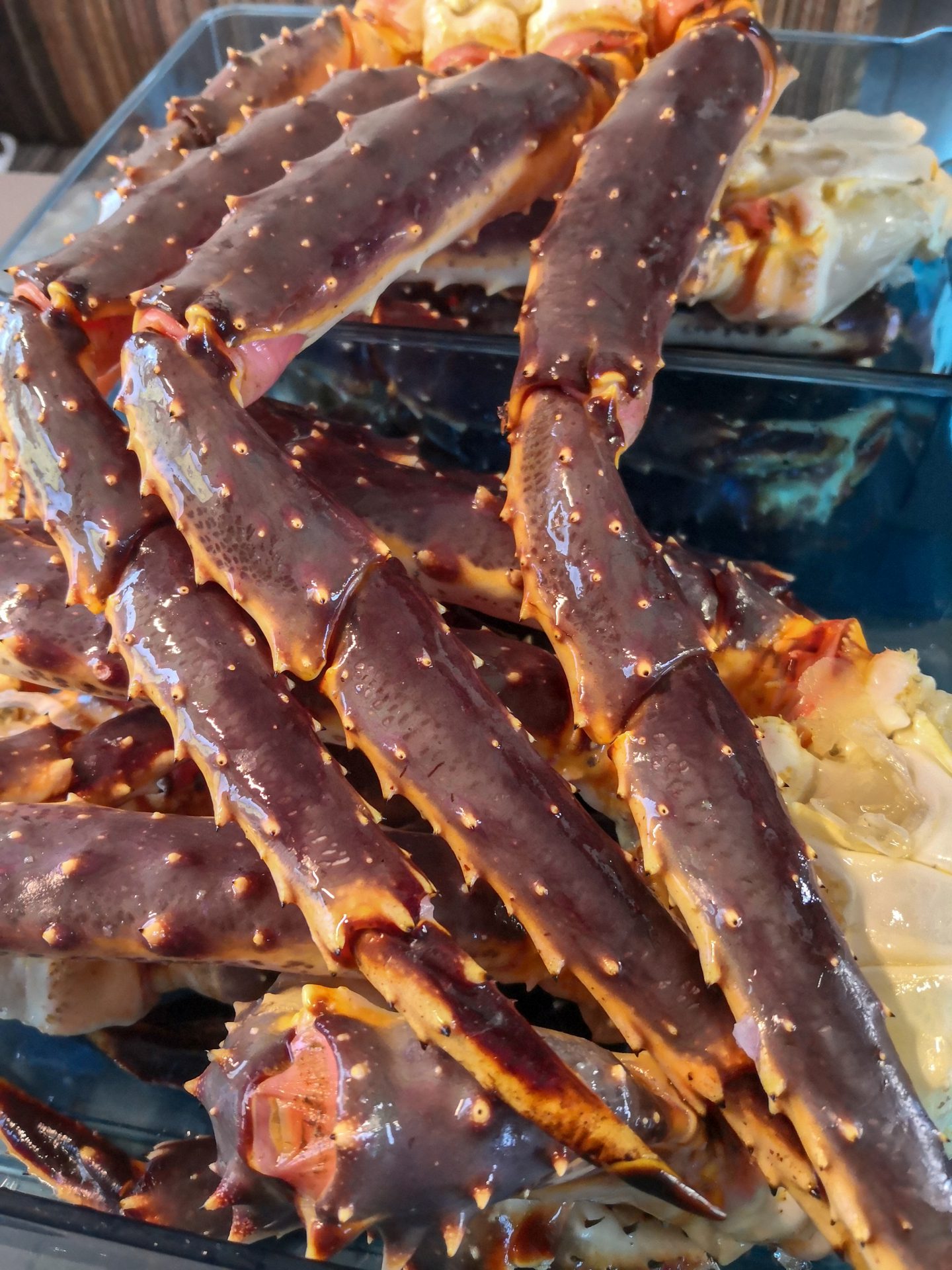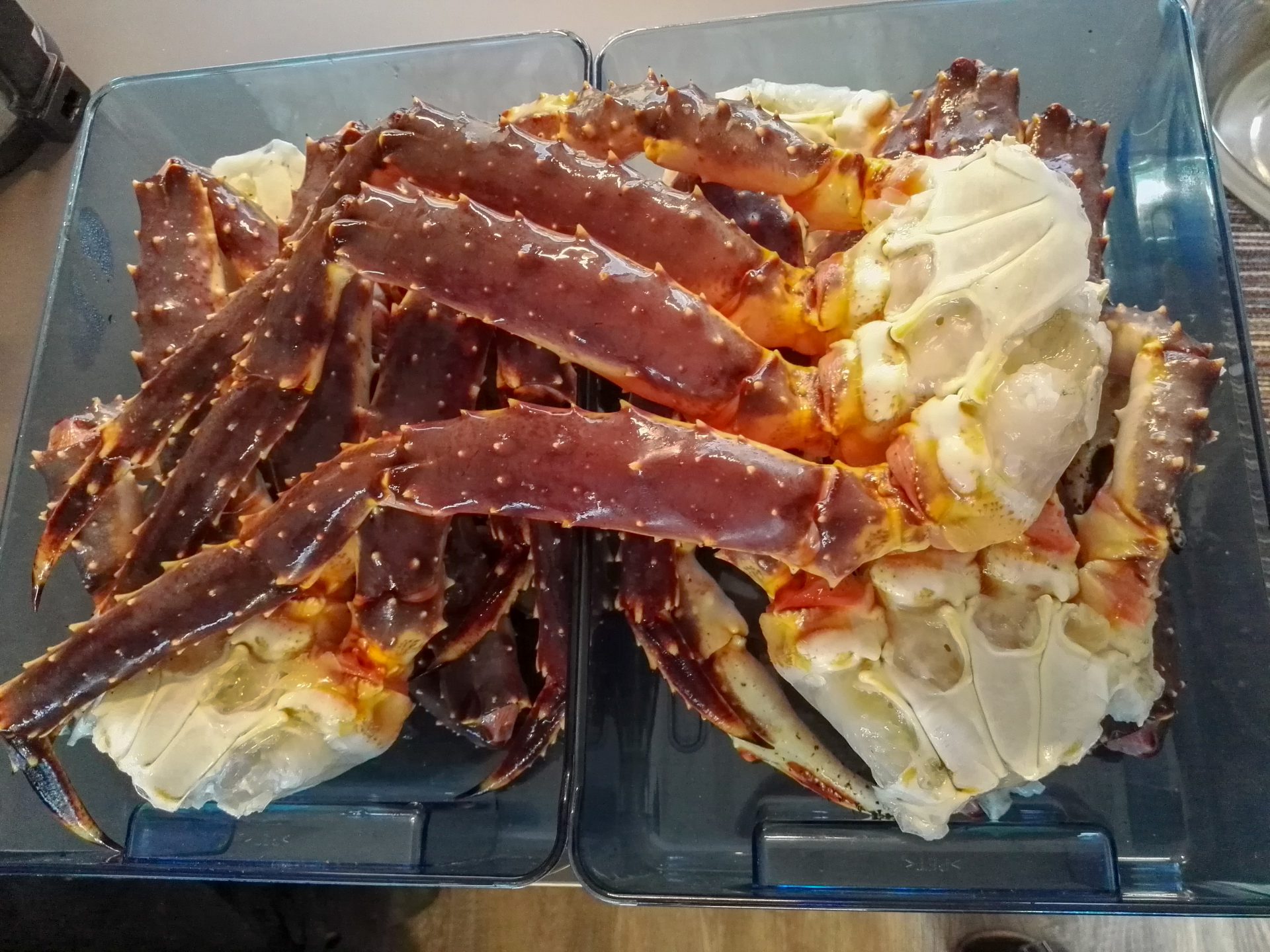 Am nächsten Morgen entdecken wir Seltsames! Da liegt doch eine Papiertüte unter unserem Auto, die war gestern noch nicht da, oder? Vorsichtig nähern wir uns. Sie ist sehr schwer, man spürt, dass sie mit Eis gefüllt ist und irgendetwas piekst. Königskrabben! Und nicht nur eine! Das müssen mindestens zwei sein, schön zerlegt und auf Eis gekühlt. Wir haben uns so gefreut! Leider können wir uns bei dem jungen Fischer nicht mehr persönlich bedanken. Wir hinterlassen eine Nachricht auf dem Tisch und hoffen, dass er sie bekommen hat.