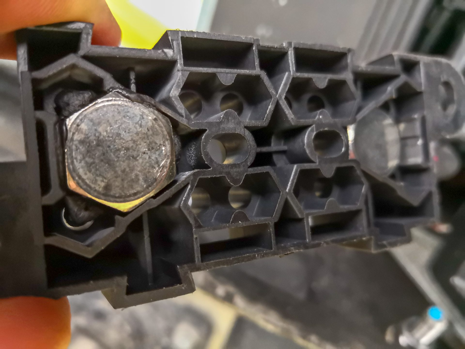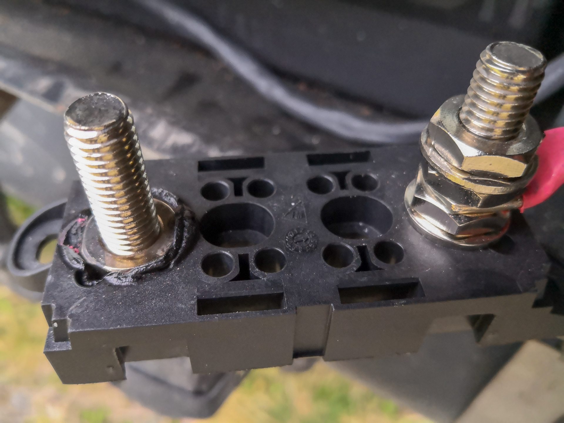 Wie immer steht uns Rico bei der Fehlersuche hilfreich zur Seite. Vielen lieben Dank! Mit der Firma, die die Ladewandler herstellt, telefonieren wir auch. Die Ladewandler werden nur auf Bestellung gefertigt, das dauert mindestens 6 Wochen. Beide meinen allerdings, am Ladewandler liegt es nicht. Jochen sucht weiter, misst nochmal alle Anschlüsse durch. Am nächsten Tag findet er den Fehler! Mein Held des Oskarschraubens! Die Sicherung der Leitung von der Starterbatterie zum Ladewandler war nicht richtig verschraubt und dadurch kam am Ladewandler nicht mehr genug Strom an, weshalb er nicht mehr eingeschaltet hat. Der Sicherungshalter war an der Stelle schon komplett durchgeschmort und die Stelle wurde unter Last richtig heiß. Das hätte böse ausgehen können. Derselbe Fehler bereits zum zweiten Mal, ausgeführt von unserem „Elektro-Fachmann“. Vielen Dank dafür!