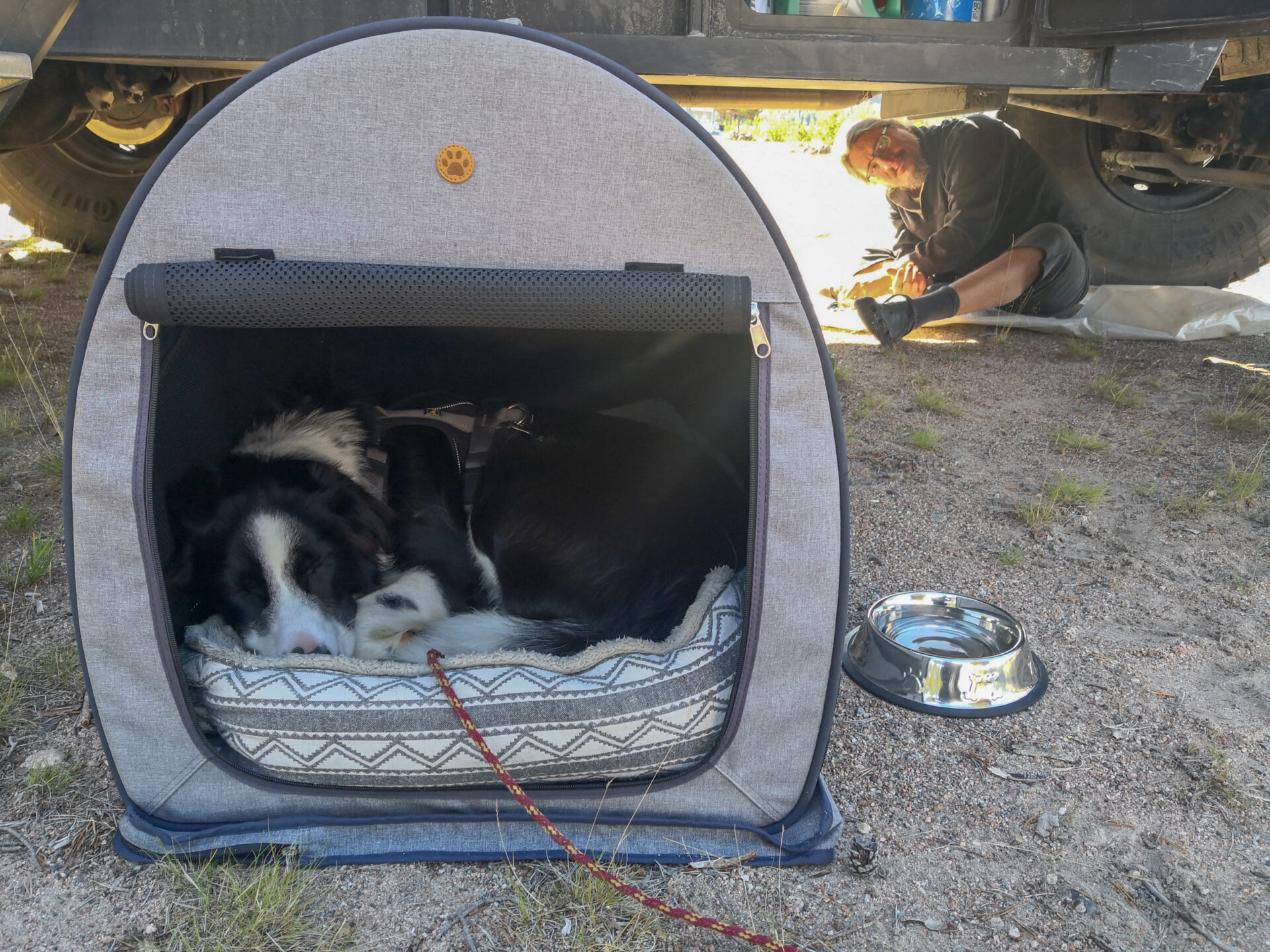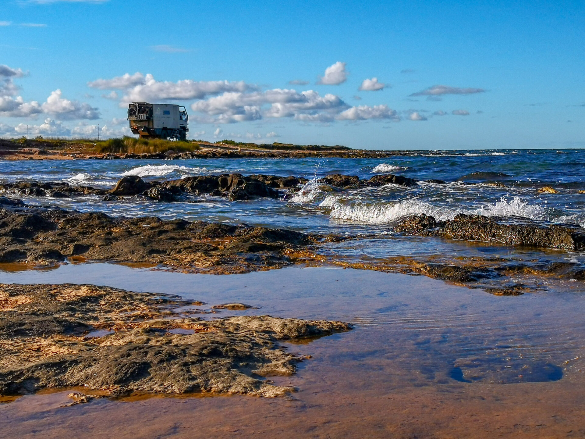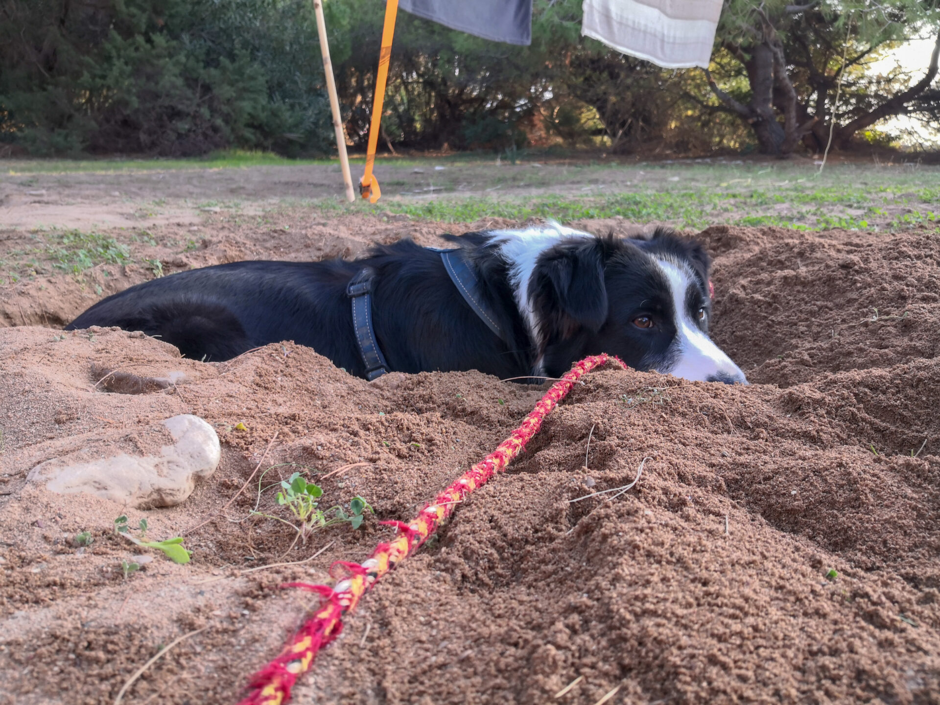 Innerhalb von zwei Tagen werden aus 30 weit verstreuten Campern über 150 Fahrzeuge. Nachdem wir schon eine Woche hier sind, haben wir einen schönen, etwas abgeschiedenen Platz, aber auch um uns herum wird es voller und voller. Leider verläuft auch Almas Kastration nicht problemlos, ihr Bauch ist stark geschwollen und überall zeigen sich große, rote Blutergüsse. Die folgenden Wochen werden anstrengend.