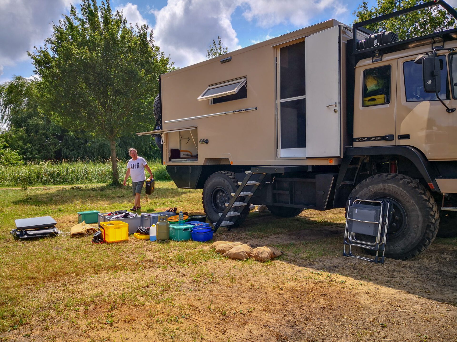 Aber die Nacht geht vorbei und am nächsten Morgen warten wir ungeduldig auf die Entlassung durch den Stationsarzt. Am späten Vormittag ist es endlich soweit und wir können weiter, die letzten paar Kilometer bis nach Kiebitzreihe, um die Schneeketten abzuholen. Da ich aber trotz allem noch etwas k.o. bin, beschließen wir, heute nur noch bis Itzehoe zu fahren und uns dort nochmal für die Weiterreise zu organisieren. Wir brauchen auf jeden Fall ein Notfallset, falls mich doch mal wieder eines der Mistviecher stechen sollte – vielen Dank hier auch an unsere Hausarztpraxis Hinrichs & Angermeier in Sinzing, die uns mit den nötigen Rezepten per Fax versorgt haben – und der Stauraum in der Heckgarage muss ebenfalls nochmal neu eingeräumt werden. Der Stellplatz in Itzehoe ist dafür perfekt, eine große Wiese an einem kleinen See und das Wetter passt auch. Also alles raus und nochmal kritisch beäugt. Brauchen wir das wirklich alles?