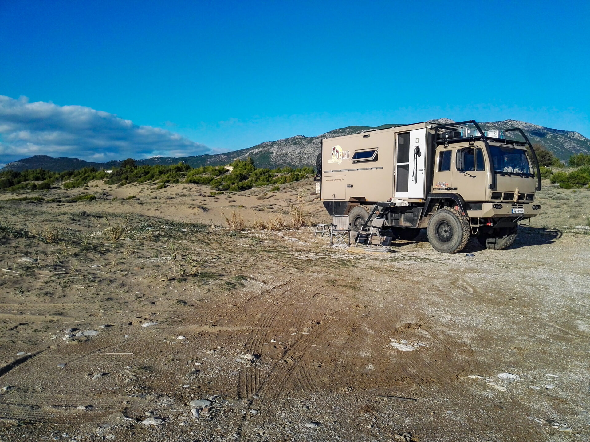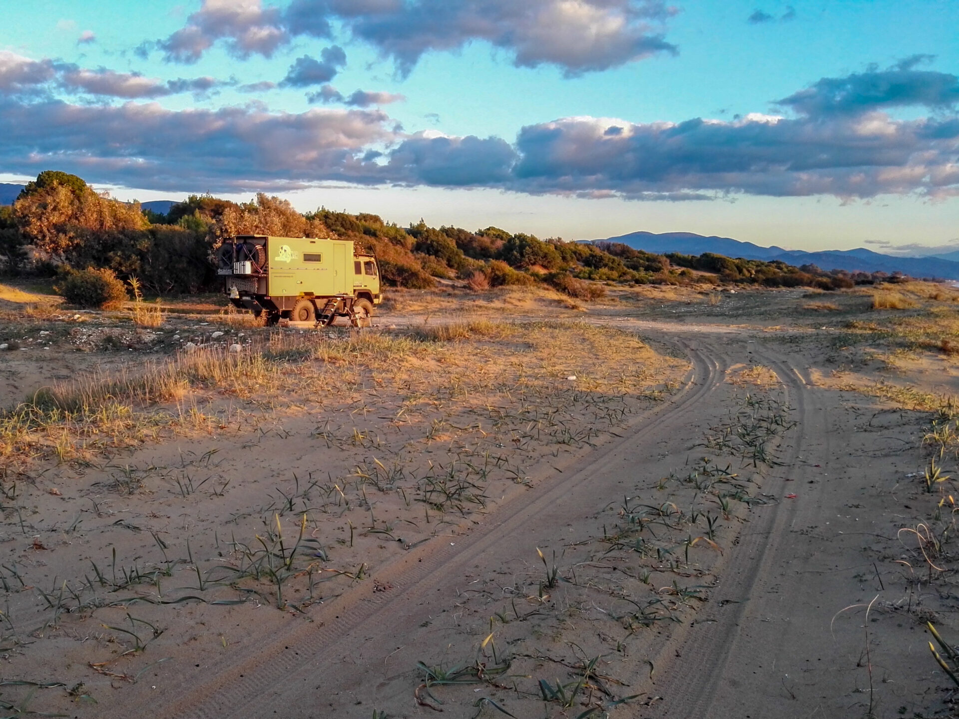Am 18. Januar ziehen wir nach über 6 Wochen wieder in unseren Oskar ein. Der Lockdown wird zwar nochmals verlängert, aber das kann uns jetzt auch nicht mehr aufhalten. Die zwei Tage bis zur Schlüsselübergabe verbringen wir in den Dünen gleich hinter Zacharo und dann geht es endlich wieder los.