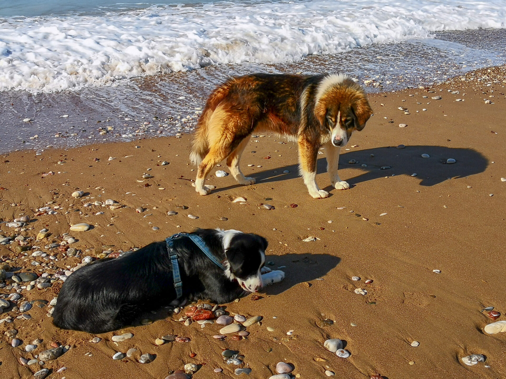 Natürlich bleibt es auch diesmal nicht bei nur einer Nacht, schuld daran ist aber vor allem Bodo. Bodo – wir haben ihn mal schnell so getauft – ist das überdimensionierte Wollknäuel von einem Hund, der wohl dem hiesigen Schäfer gehört, aber auch gerne allein am Strand spazieren geht. Und unsere Alma ist absolut hin und weg von seinem Anblick. Wir gönnen ihr den Spaß und bleiben einen Tag länger.