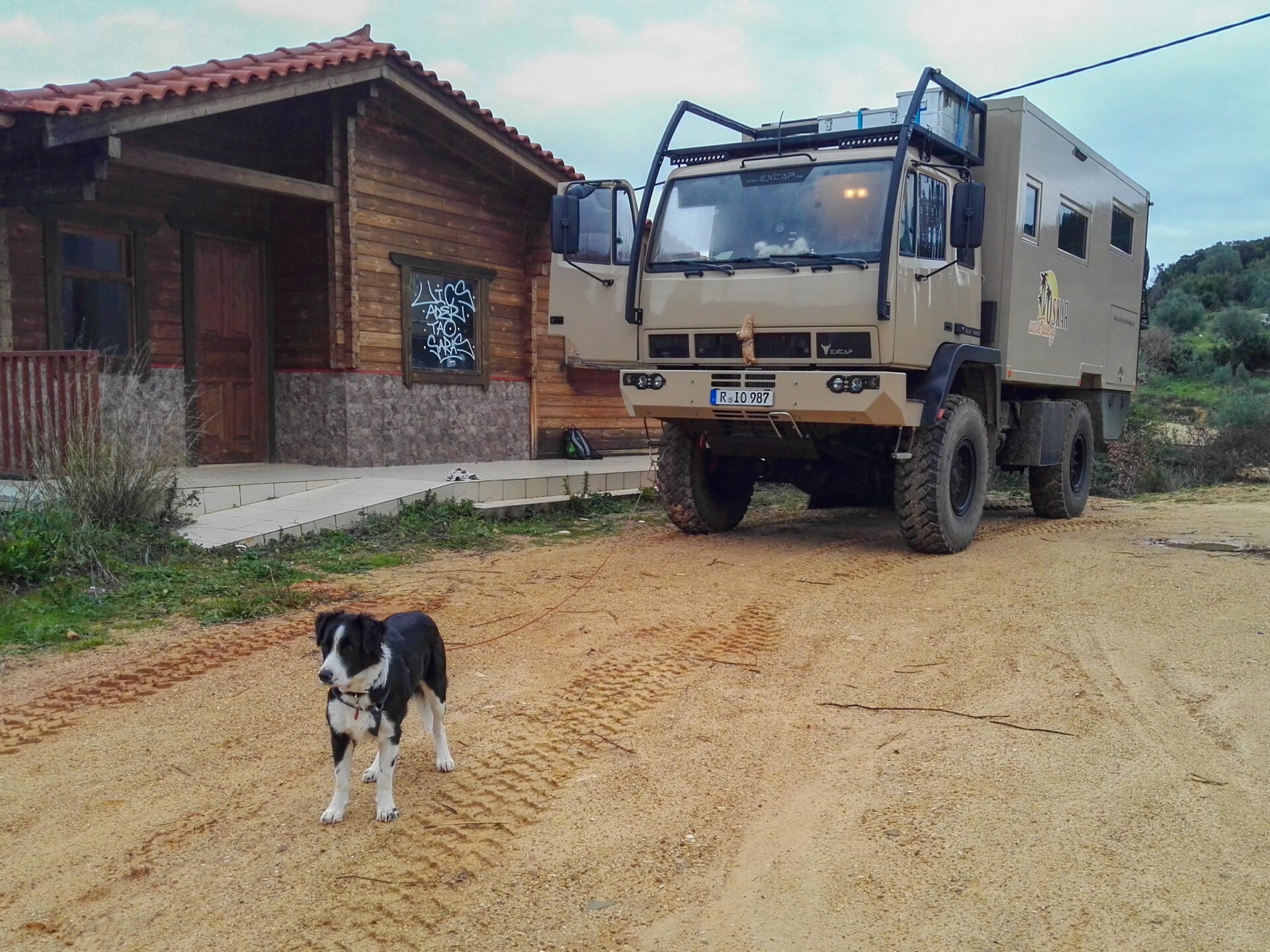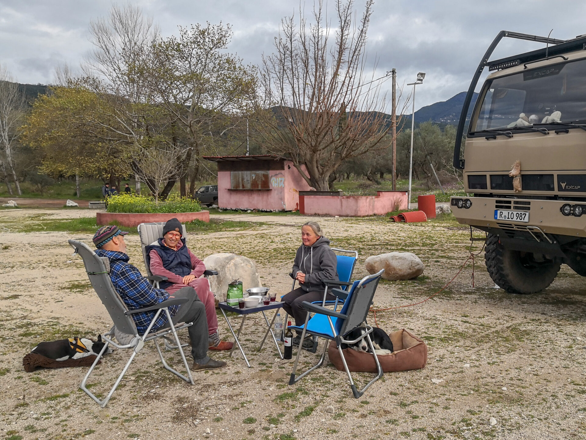 Als erstes besuchen wir Freunde, die wir hier in Griechenland kennengelernt haben: Lisi von der Monschterburg mit ihren zwei Hunden, die in Neochori den Lockdown aussitzt und anschließend Bernd und Gabi, die sich inzwischen in Yannitsochori niedergelassen haben. Und nachdem es dann doch schon später ist als geplant, beschließen wir, ein hoffentlich allerletztes Mal für eine Nacht in Elea Halt zu machen.