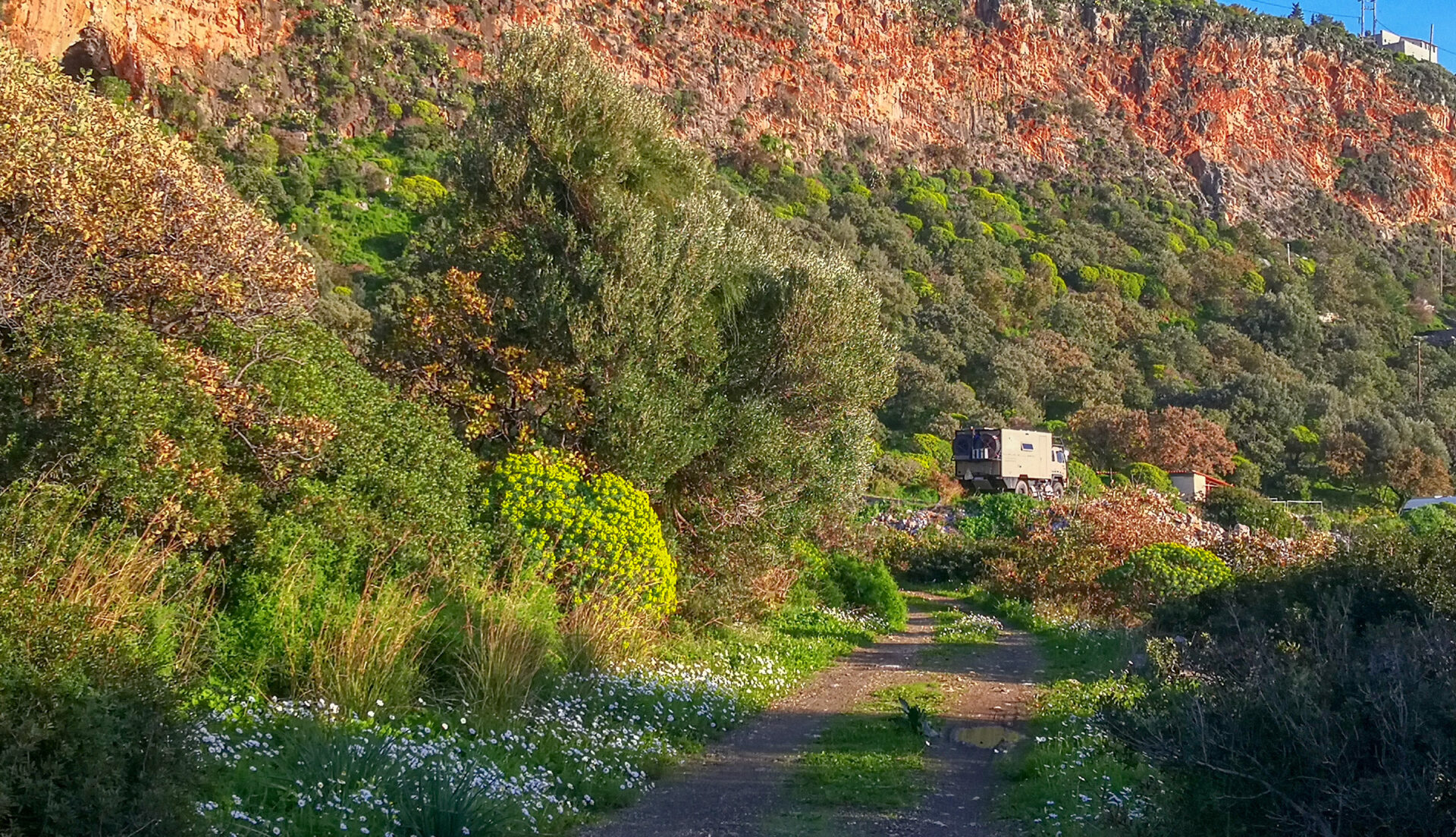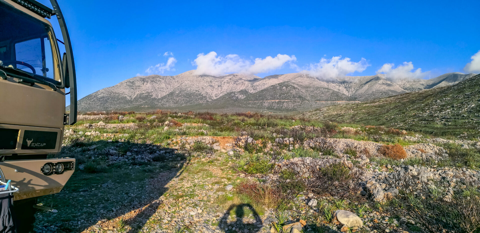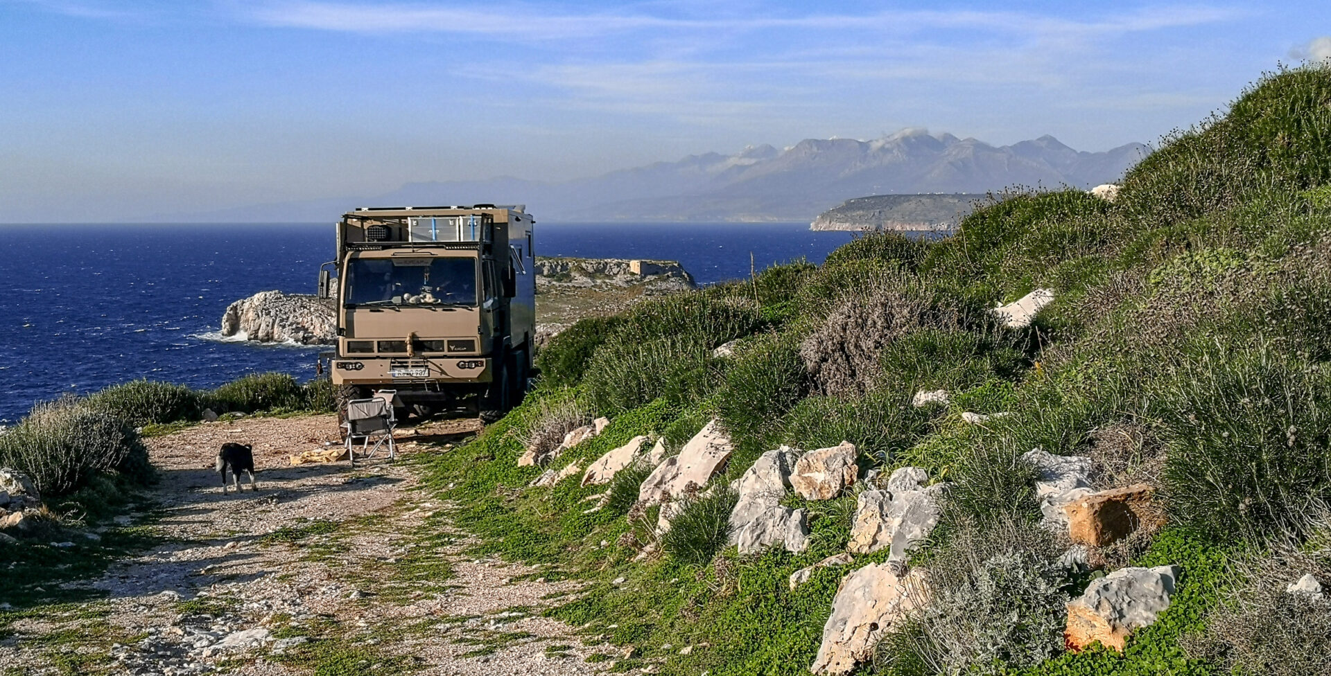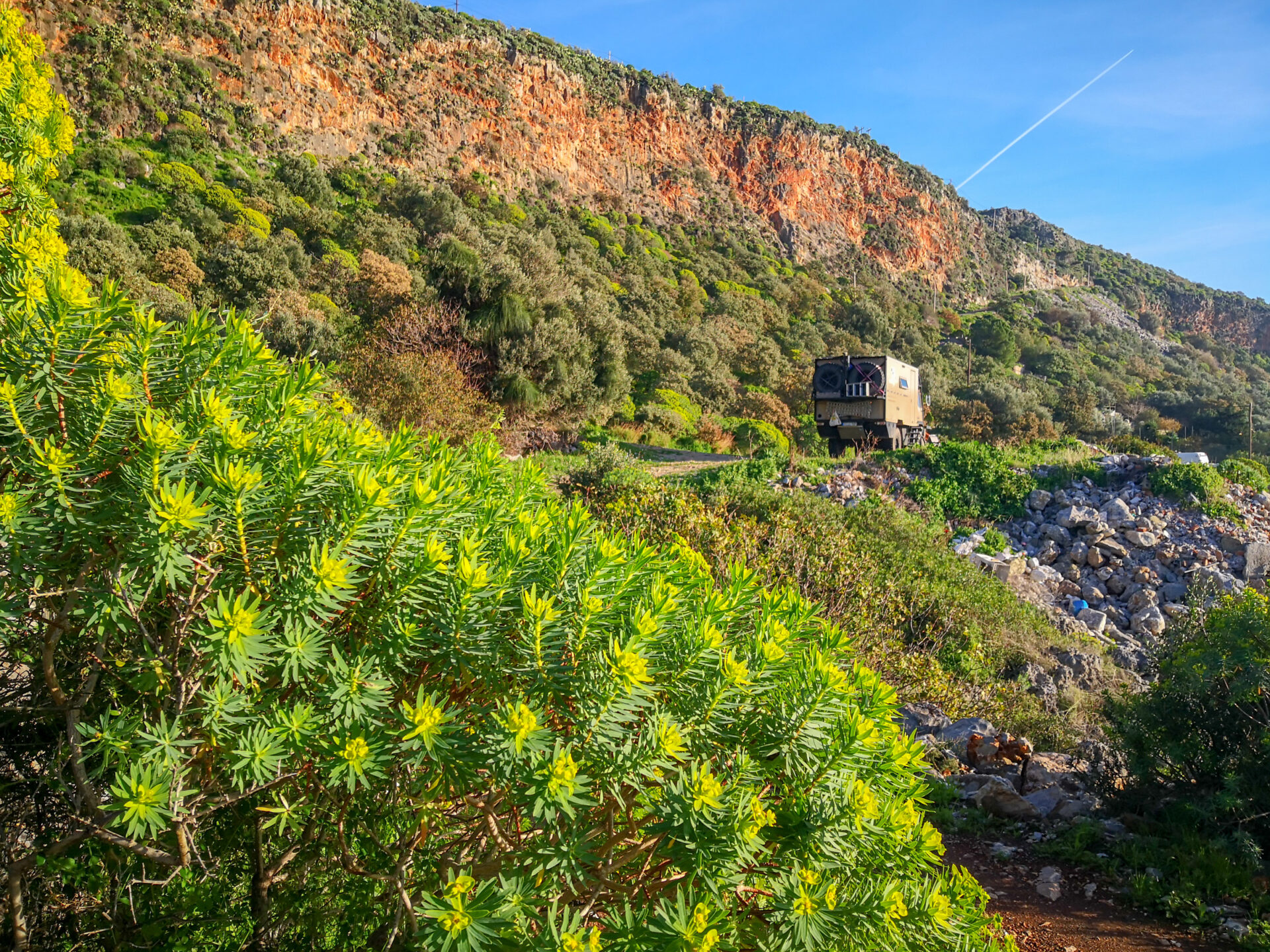 Mangels Alternativen fahren wir aber trotzdem weiter in Richtung Kap Tenaro, finden einen spektakulären Platz an der Steilküste und sind mal wieder froh über den kurzen Radstand unseres Steyr. Ein bisschen länger und wir hätten den holprigen Weg rückwärts wieder hochfahren müssen.