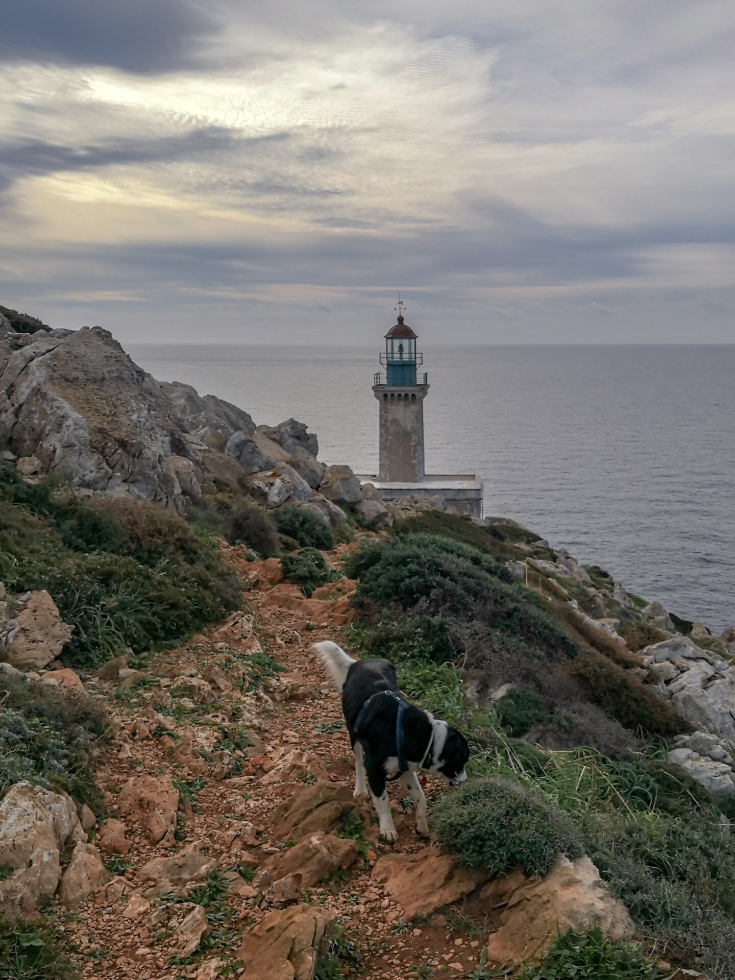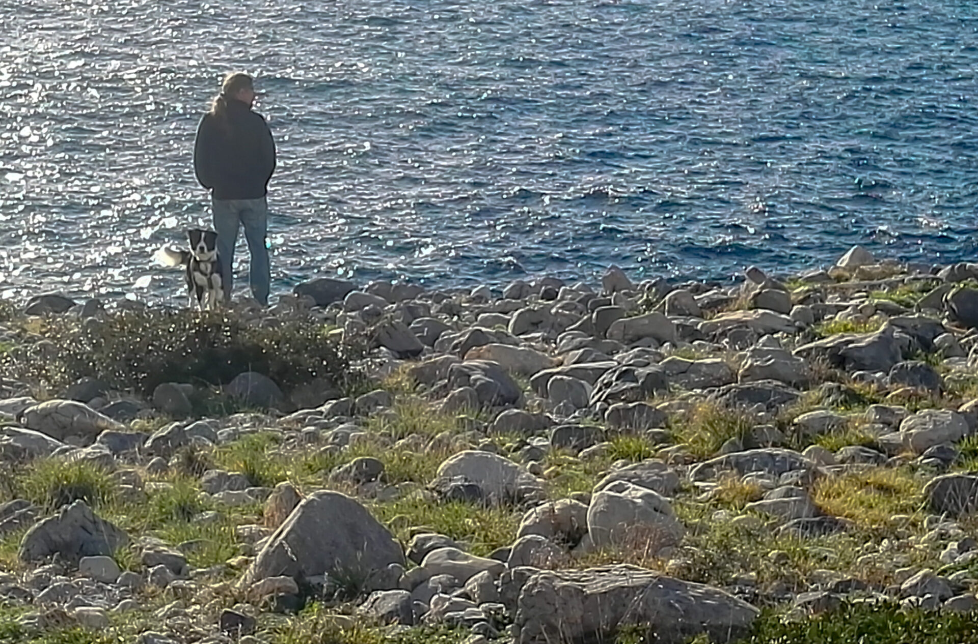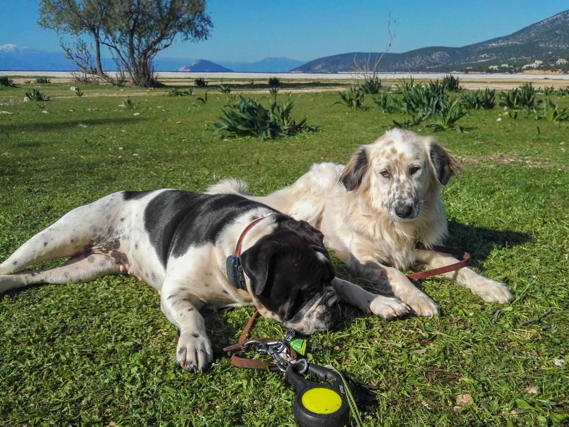 Nach zwei weiteren Tagen in Salanti fahren wir Lisi hinterher zum Strand bei der „Froschinsel“. Ein wunderschöner Platz gegenüber der Insel Hydra am östlichen Ende des „Daumens“. Vorgelagert liegt eine kleine Insel, die vom Strand aus wie ein großer Frosch im Wasser aussieht. Wir verbringen drei schöne Tage hier, gehen viel spazieren, trinken Kaffee mit Lisi und die Hunde toben bis zur völligen Erschöpfung.