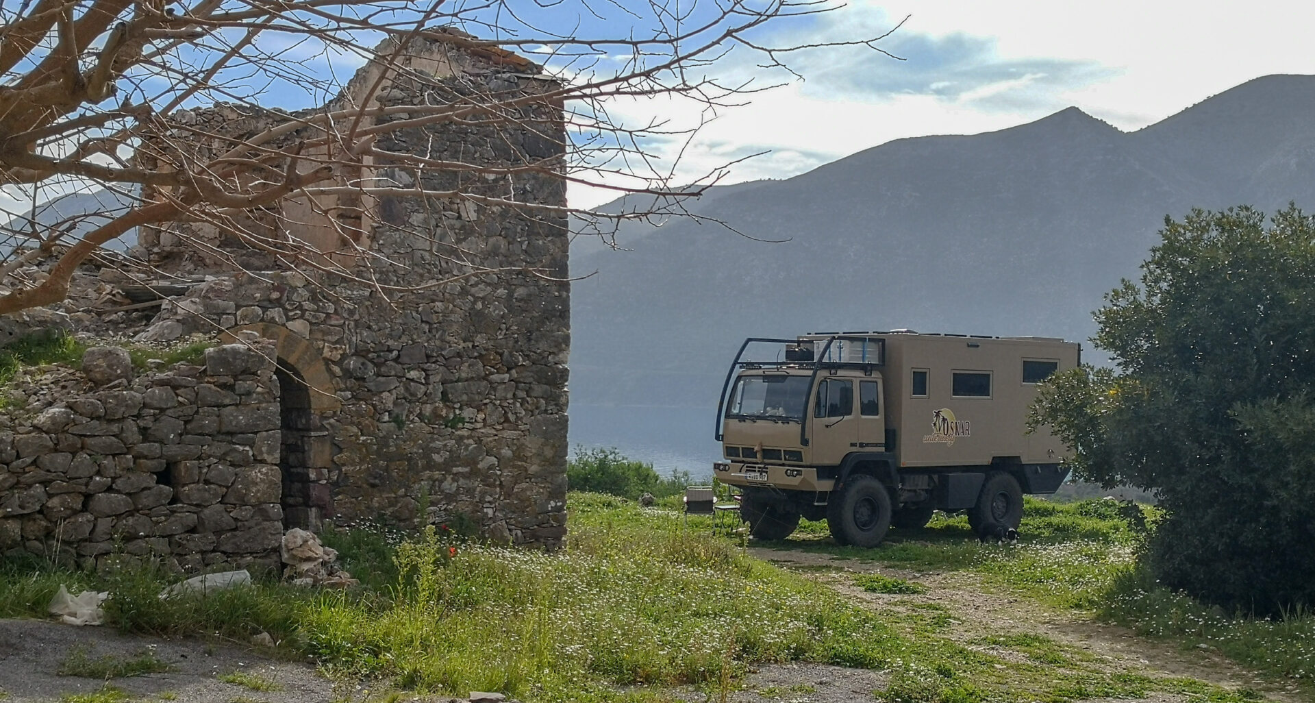 Nach vier entspannten Tagen fahren wir weiter über Polilimnio nach Kardamily. Unser Ziel ist die Mani, der mittlere Finger des Peloponnes, auf der wir es letzten Winter nur bis zum Dinosauriereierstrand geschafft haben, bevor wir umkehrten, um Yannis nach Deutschland zu bringen. In Kardamily lernen wir Monique und Sjors aus den Niederlanden kennen, die bereits sieben Jahre in Afrika unterwegs waren. Auch sie wollten wie wir in die Mongolei und auch sie denken immer wieder mal darüber nach, ihre Reise zu unterbrechen.