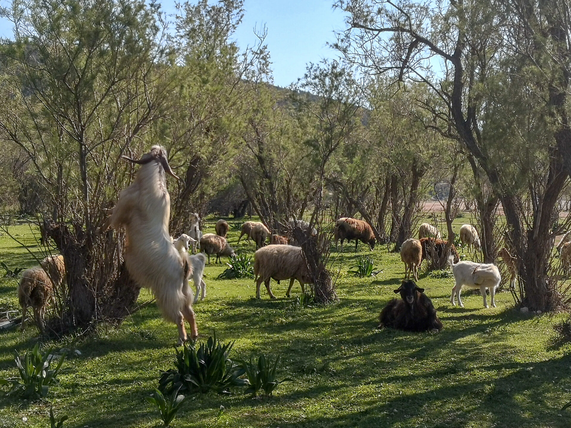 Kaum dort angekommen, werden wir von vier kleinen vierbeinigen Rackern begrüßt, die wild kläffend unser Auto belagern. Alma ist einen Moment verwirrt, merkt aber schnell, dass die Jungspunde mehr Angst vor ihr haben als umgekehrt. Bis zum nächsten Tag ist die Situation geklärt und wir haben auf einmal fünf Hunde beim Auto liegen, die sich in der Sonne räkeln und auf Futter warten. Tagsüber kommen einige griechische Fischer zu ihren Booten und amüsieren sich köstlich über unseren Zoo und vor allem über unser verrücktes Huhn Alma.