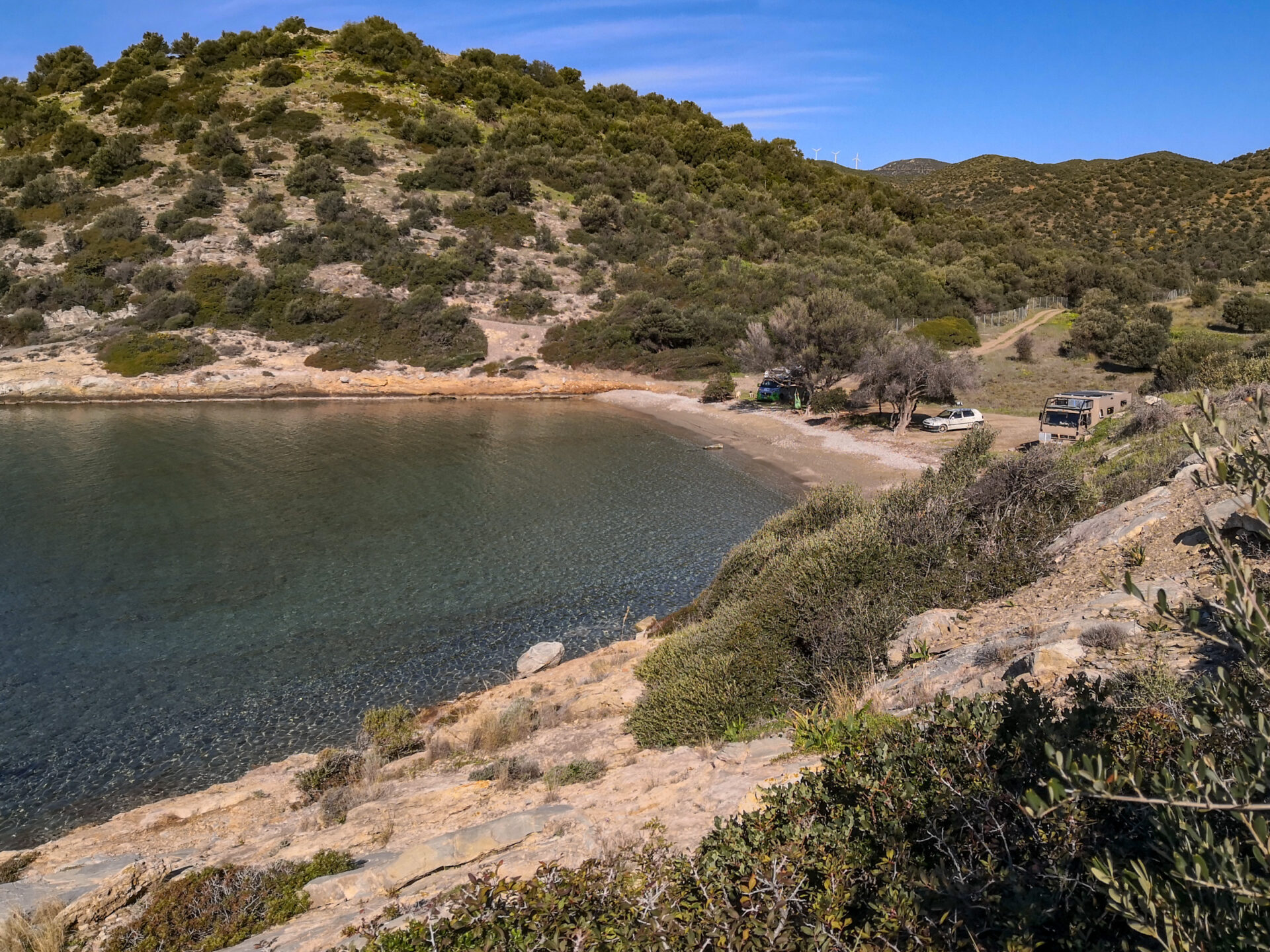Über die unbefestigte Küstenstraße fahren wir weiter in Richtung Galatas. Wir entdecken weitere kleine Buchten mit tollen Übernachtungsmöglichkeiten, aber die Straße wird auch immer enger und holpriger und die beiden Damen im Auto sind bereits sichtlich genervt von dem Geschaukel. Also zurück auf die Hauptstraße und nach Galatas zum Einkaufen. Direkt gegenüber liegt das schmucke Städtchen Poros auf der gleichnamigen Insel, aber auch hier verzichten wir auf einen Besuch, da ja immer noch Ausgangssperre ist. Am Strand von Metamorfosi, wo wir die Nacht verbringen, treffen wir Monique und Sjors wieder, die wir am Beginn unserer Mani-Runde kennengelernt haben.