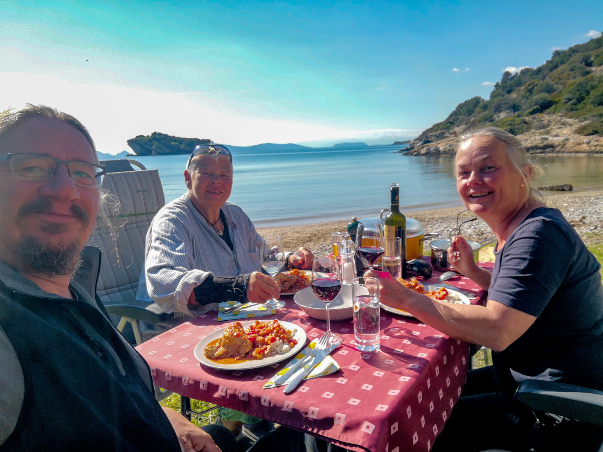 Aber am nächsten Tag geht es trotzdem weiter. Vorräte auffüllen in Kyparissia und weiter entlang der Küste Richtung Süden. Wir finden einen wunderschönen Platz in Romanos und treffen dort kurioserweise ein junges Paar aus der Schweiz wieder, mit denen wir schon vor 8 Monaten in Schweden am See gestanden sind. So klein ist die Welt.