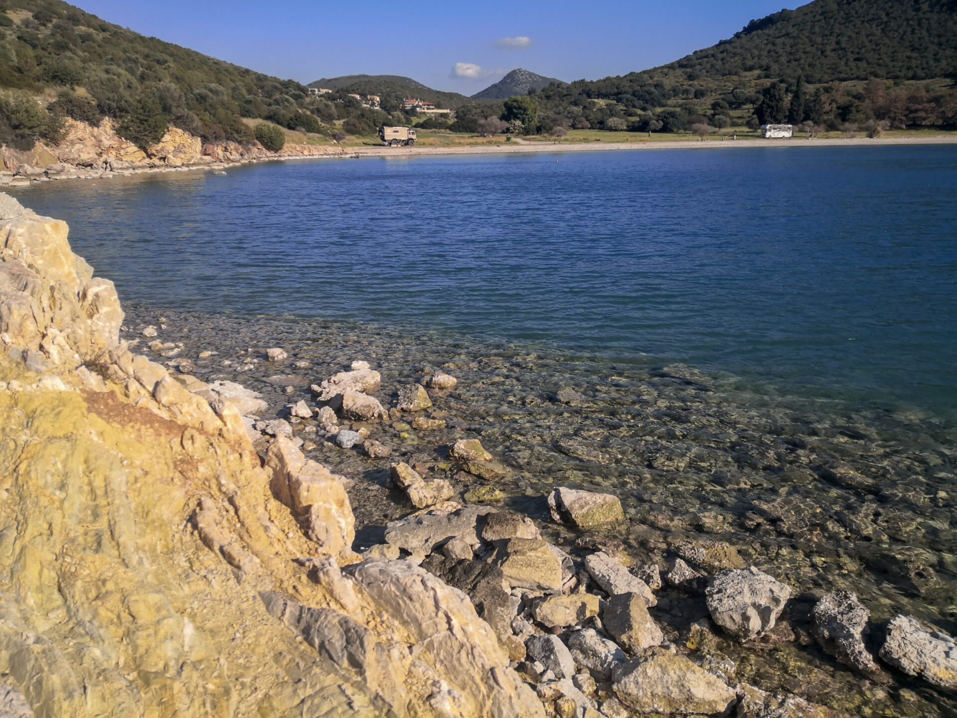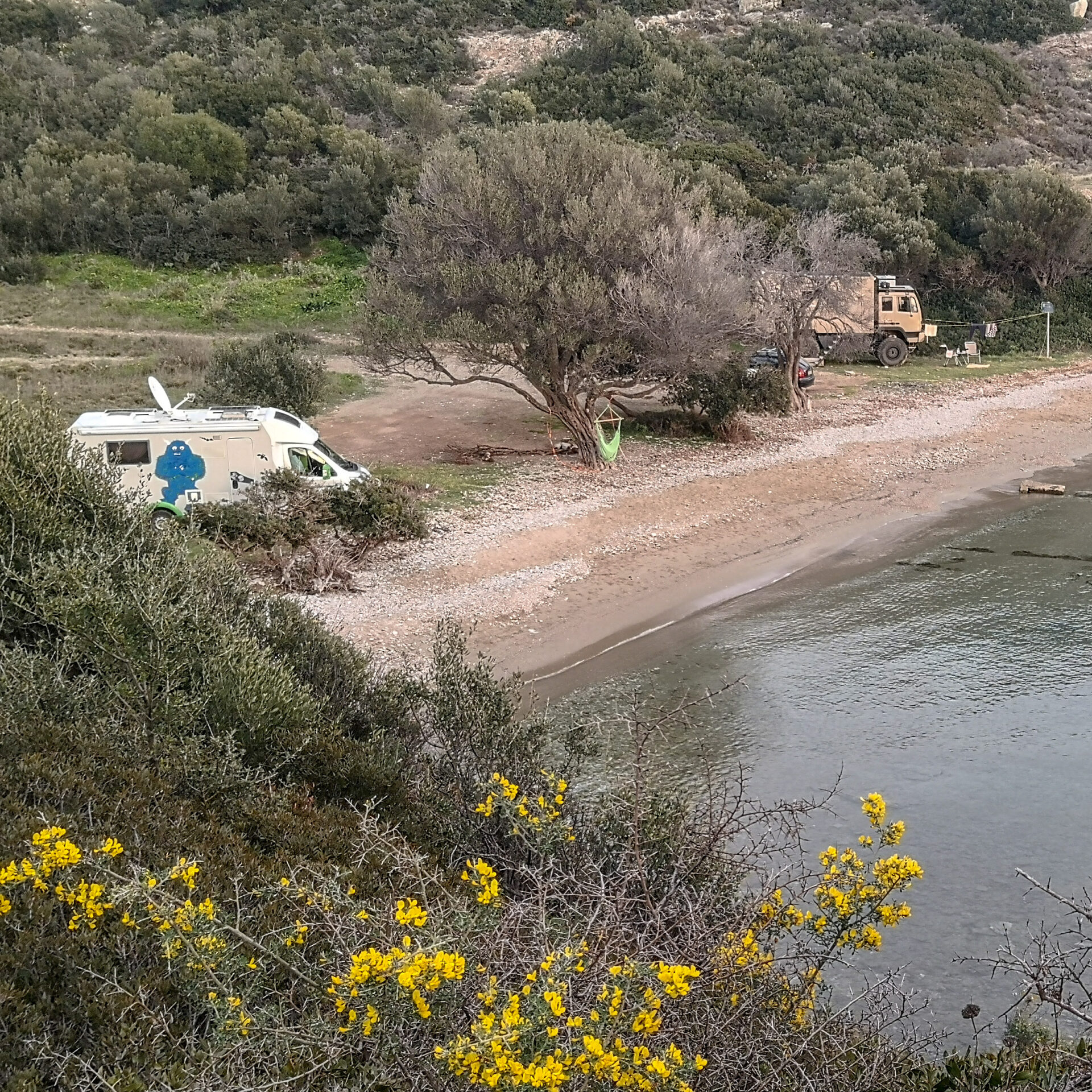 Nachdem in Griechenland noch immer der strenge Lockdown herrscht, verhalten wir uns die nächsten zwei Wochen ruhig und hoffen, dass sich dann endlich etwas an der Situation ändert. Wir kehren nochmal für ein paar Tage zurück nach Salanti, ziehen dann um an den nur wenige Kilometer entfernten Strand von Fourni und fahren ein paar Tage später nochmal über die Berge nach Palea Epidauros, wo Mantoco schon am Strand stehen.