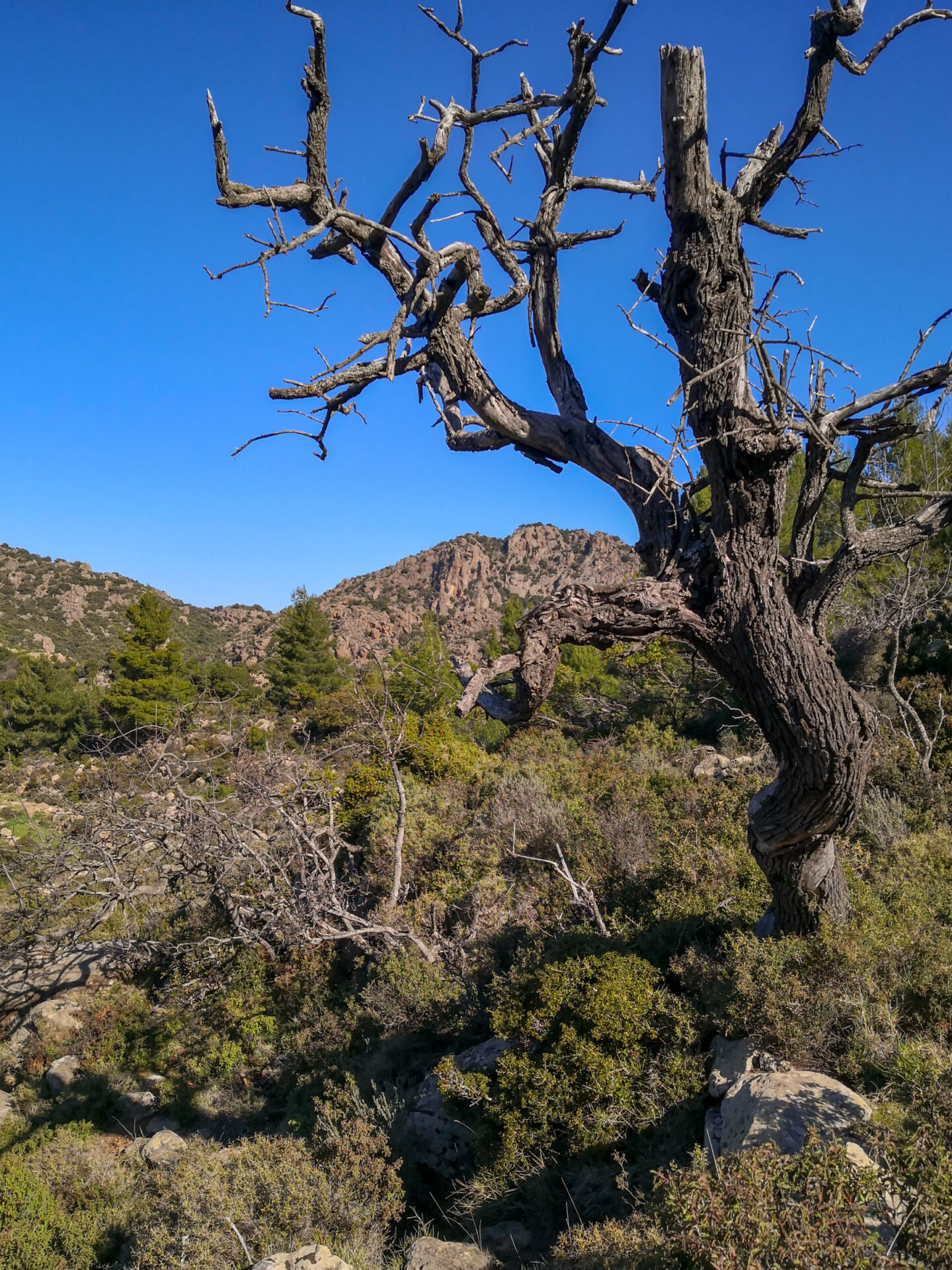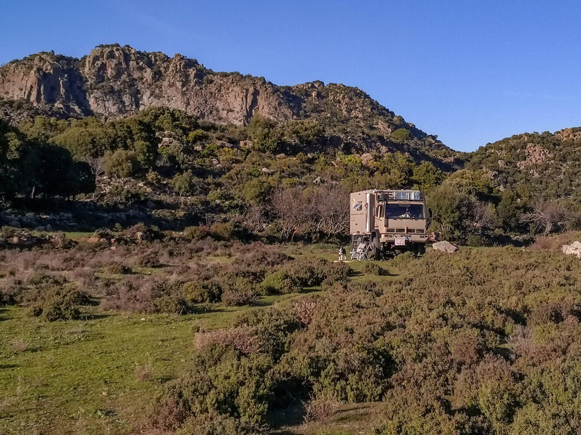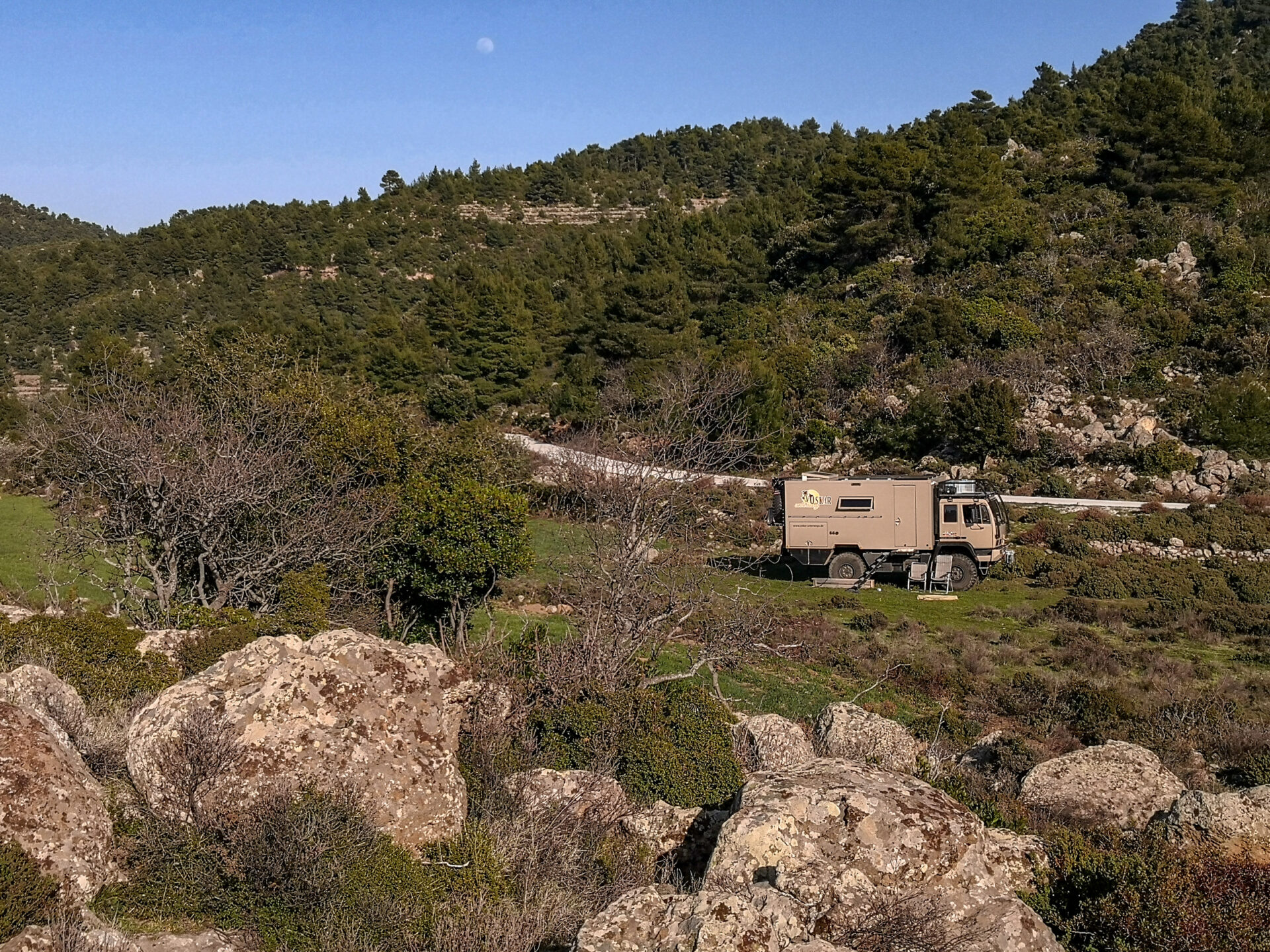 Auf der Halbinsel Methana, wohin wir am nächsten Tag fahren, stoßen wir seit langem wieder einmal an die Grenzen des machbaren für unseren Oskar. Die „Hauptstraße“ um die Insel herum ist schon eng und in schlechtem Zustand, aber wir wollen trotzdem ein Stück weiter an der Küste entlang und erst dann wieder zurück auf die Hauptroute, die sich durchs Landesinnere schlängelt. In Agios Nikolaos ist dann allerdings Schluss, die Dorfstraße wird immer enger und als nächstes käme eine scharfe Linkskurve – keine Chance. Also alles wieder rückwärts raus und auf einem anderen Weg zurück auf die Hauptstraße. Weiter oben in den Bergen finden wir einen ruhigen und Platz für die Nacht, wo wir uns für die nächsten drei Tage einrichten. Am Abend kommt noch Jens vorbei, ein ehemaliger „Nachbar“ aus Elea und am nächsten Tag klappt es dann endlich auch mit einem Treffen mit Conny und Tommy von Mantoco, mit denen wir schon länger in Kontakt sind.