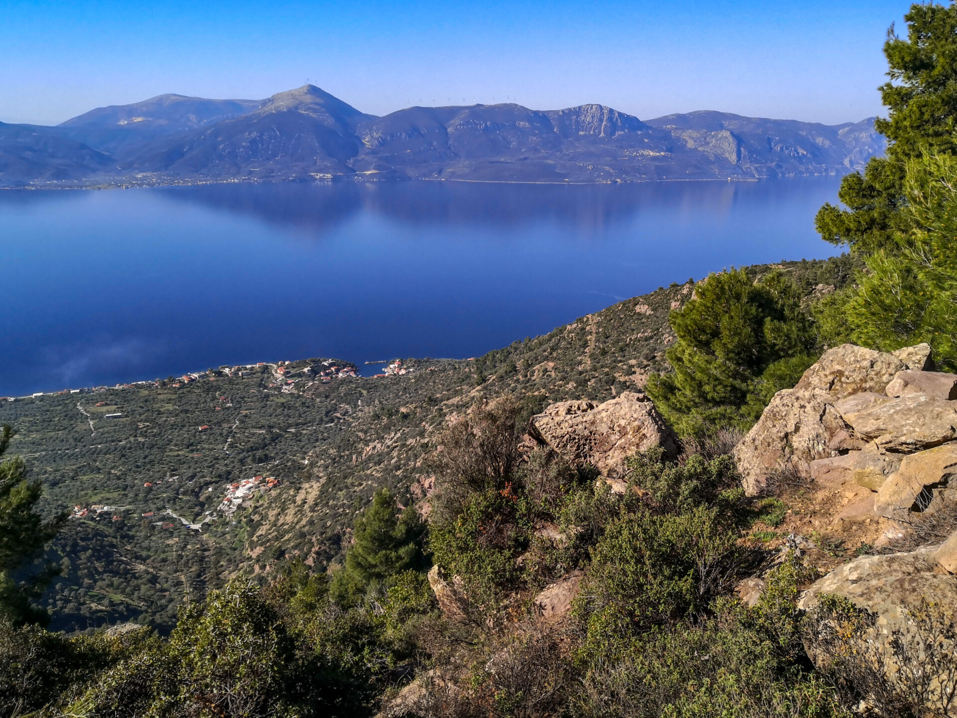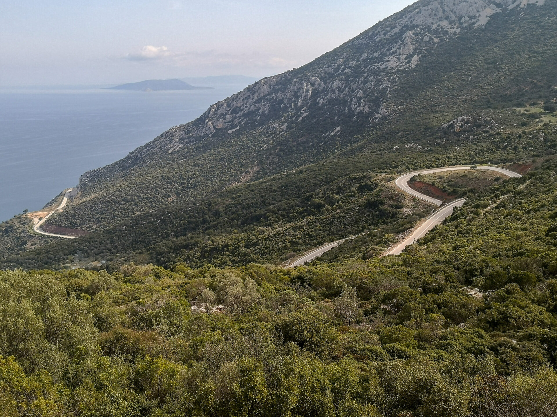 Der Weg dorthin führt durch wunderschöne Berglandschaft, wo wir nach ca. 80 Kilometern auch die Nacht verbringen wollen. Allerdings sagt der Wetterbericht für die höheren Lagen Schnee an und darauf wollen wir es nun nicht ankommen lassen. Bis zum kleinen Hafen von Agios Andreas sind es zwar nochmal fast 80 Kilometer, aber wir nehmen die lange Fahrt auf uns, da wir vom letzten Jahr wissen, dass wir dort problemlos auch für ein paar Tage bleiben können.