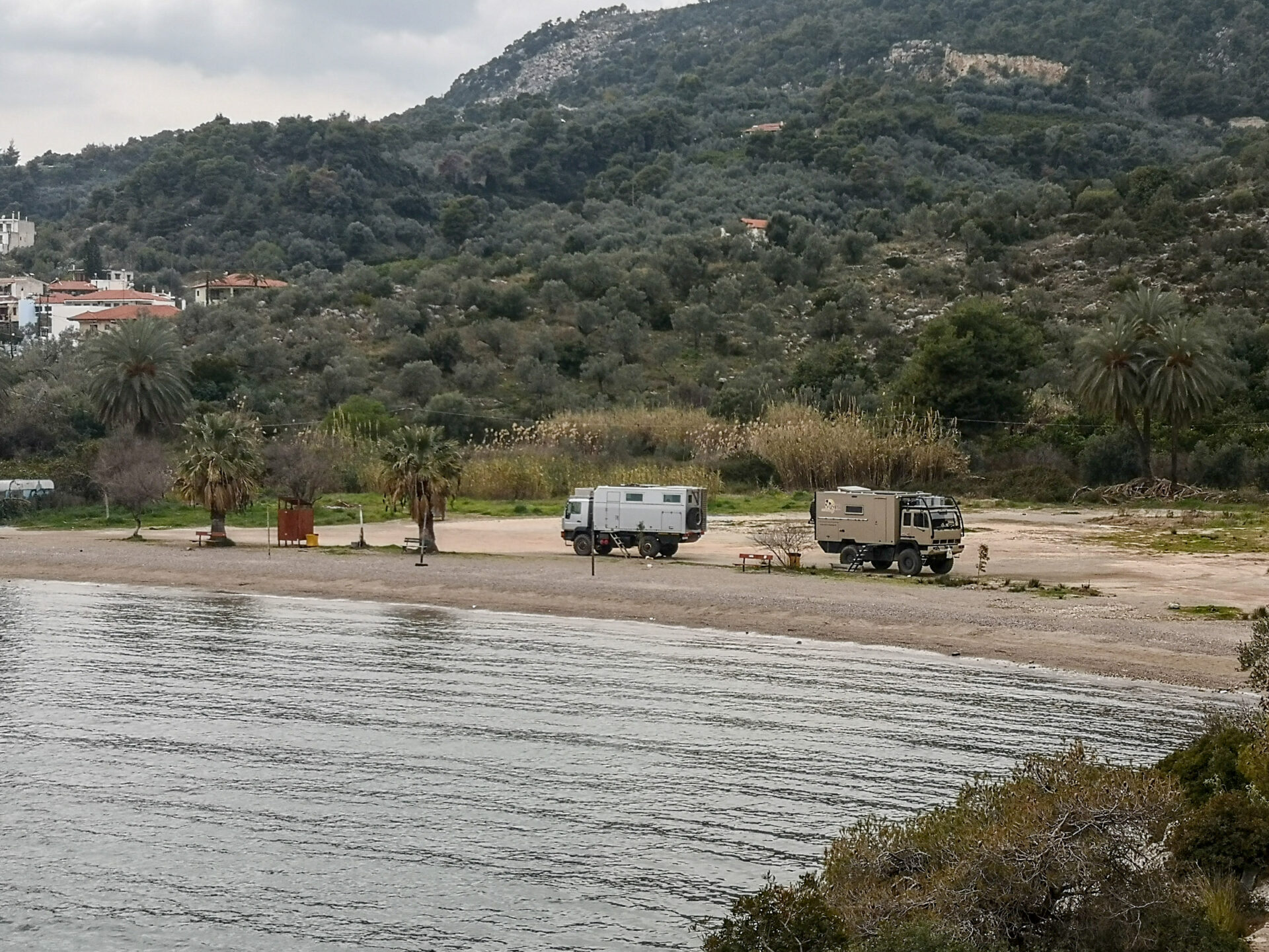 Wir werden nicht enttäuscht. Ein weitläufiger, flacher Strand, schattige Plätze unter Bäumen und einige bekannte Gesichter sind auch schon da: Lisi mit ihren Hunden Dyna und Akina und Lisa und David mit ihrem Hund Marley, die beiden Schweizer aus Schweden. Alles prima, nur das Wetter spielt nicht mit. Es wird kälter und regnet. Den nächsten Tag verbringen wir im gut geheizten Oskar. Wintereinbruch in Griechenland Mitte Februar. In Athen schneit es, hier glücklicherweise nicht. Aber es ist saukalt.