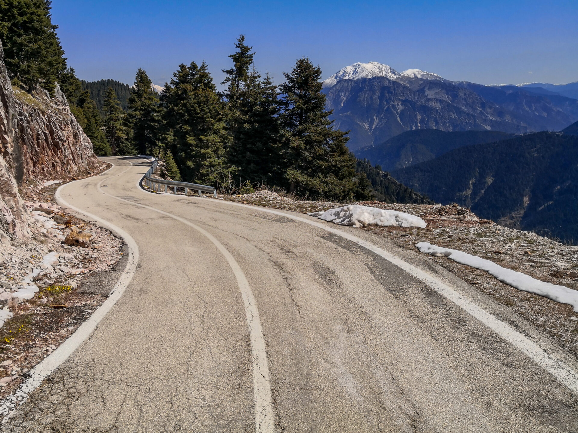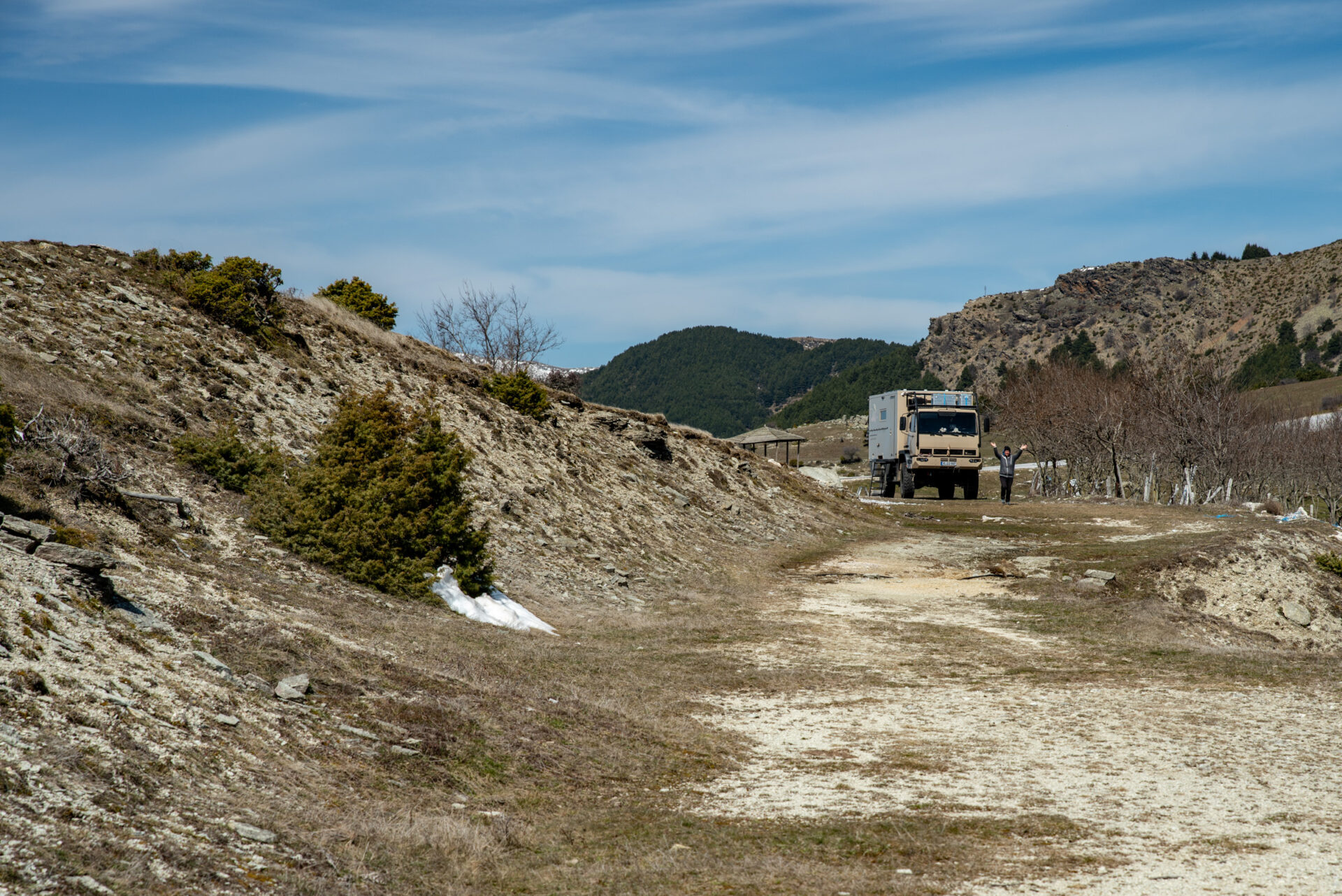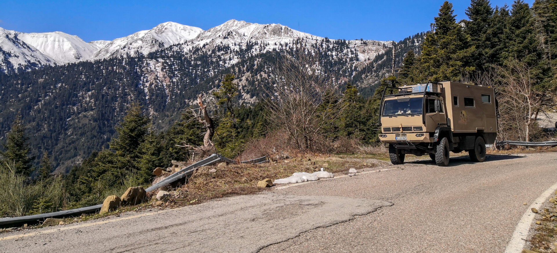 Nachdem die Weiterfahrt am nächsten Tag durch eher langweilige Landschaften führt, biegen wir in Larisa links ab und nehmen die kleine Straße auf der Westseite des Olymp statt der Autobahn. Der Umweg lohnt sich, plötzlich sind wir den schneebedeckten Bergen ganz nah. Am liebsten würden wir die Nacht hier oben verbringen, aber wir haben uns für den Abend mit Paola und Igel in Methoni verabredet.