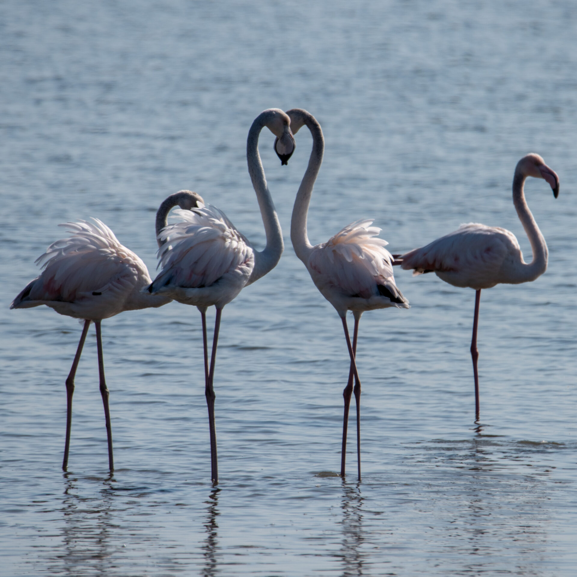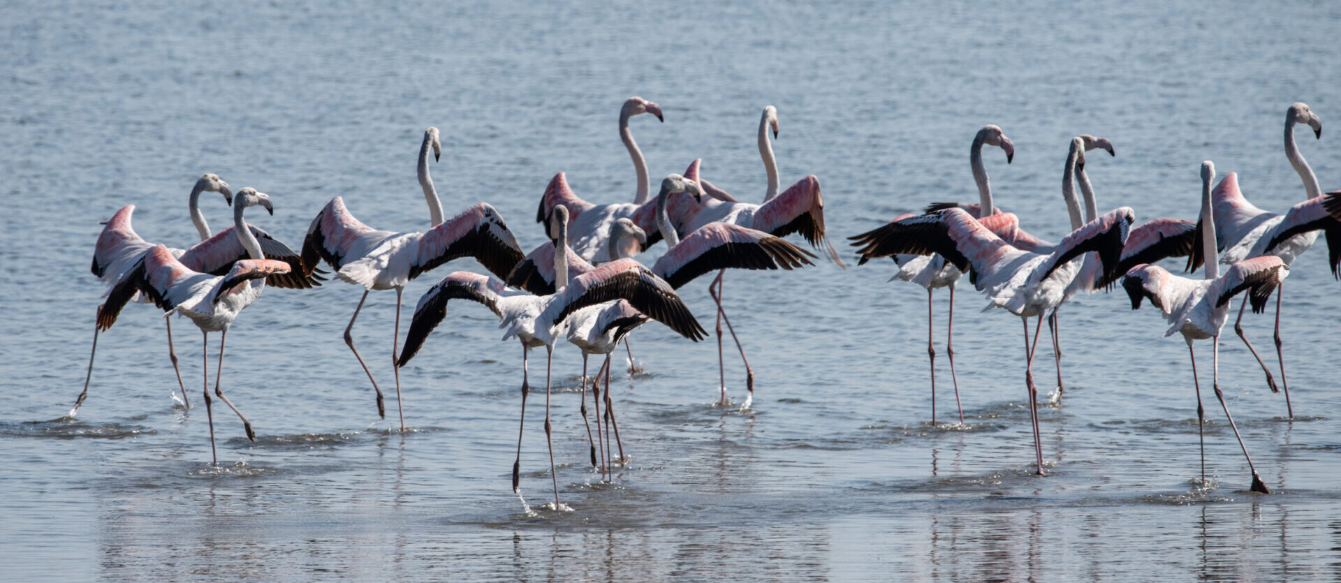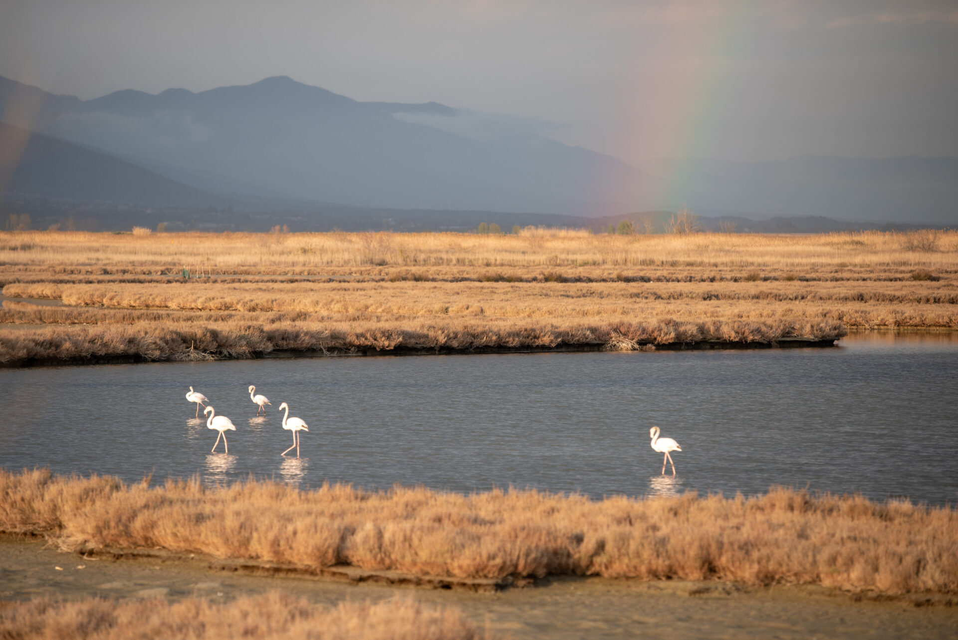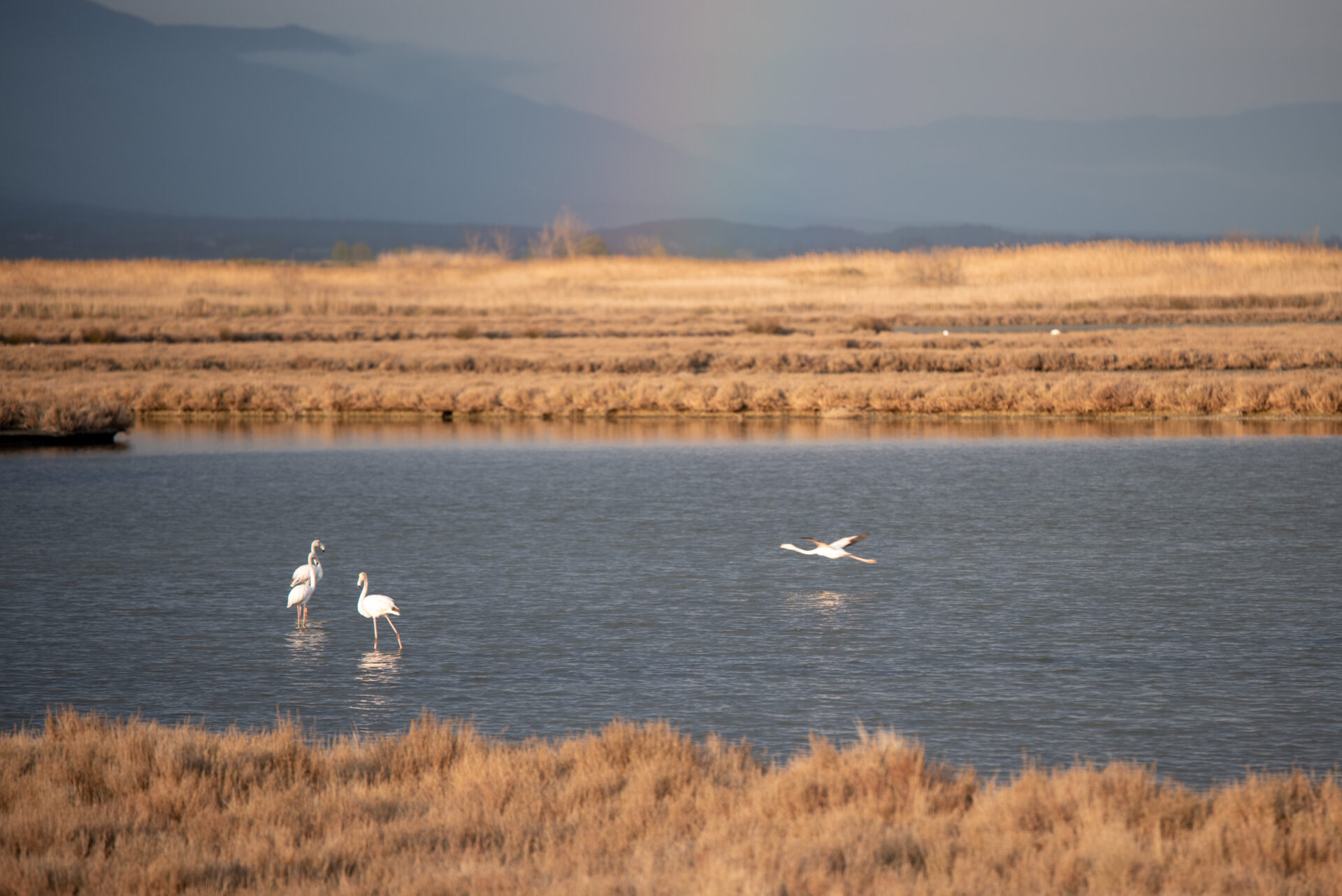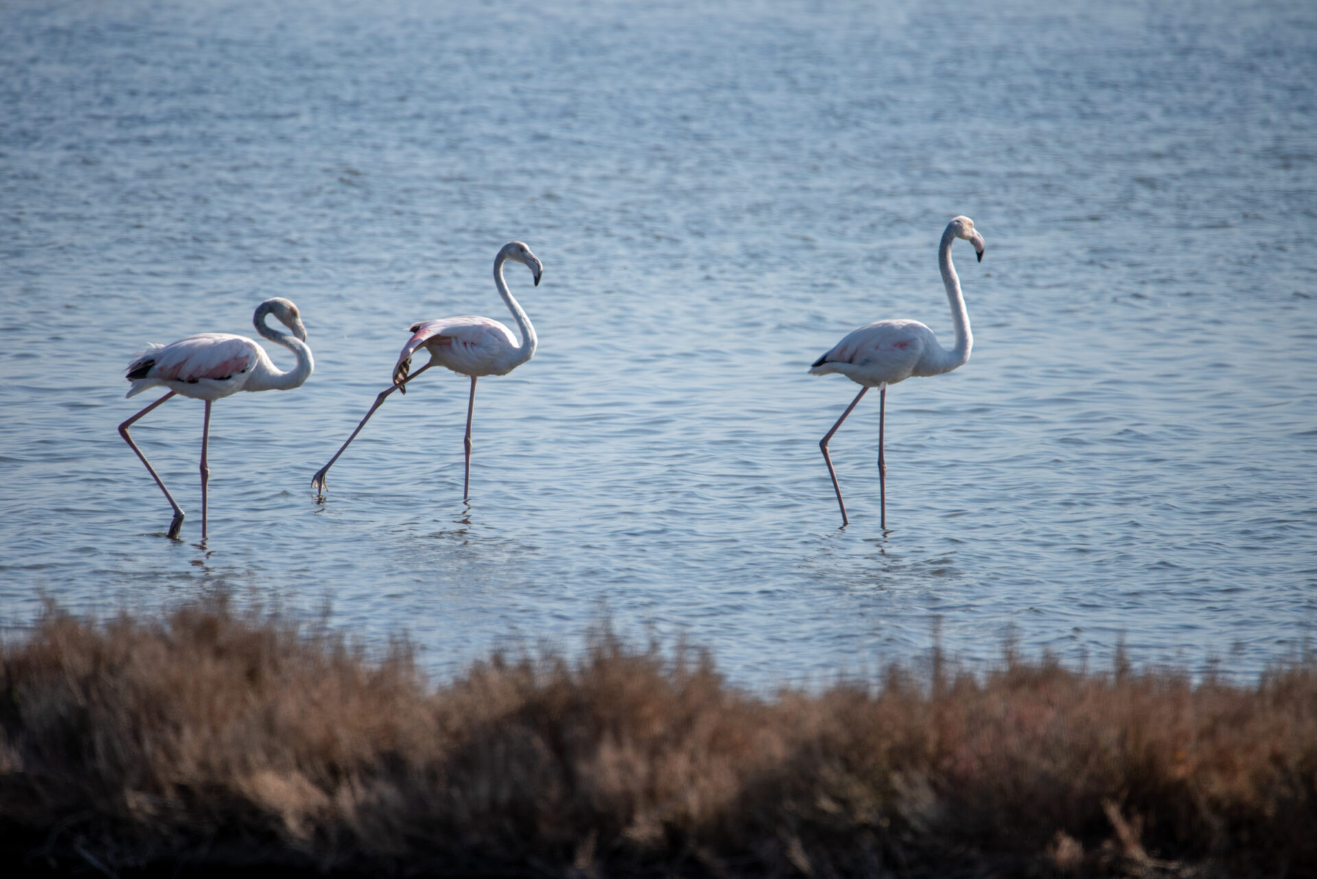 Der nächste Tag gehört wieder zu denen, auf die man gerne verzichten würde. Wir steuern verschiedene Übernachtungsplätze an, die uns dann entweder nicht gefallen oder zu denen die Zufahrt für uns gesperrt ist, weil wir über 3,5 Tonnen schwer sind. Es ist bereits später Nachmittag und wir sind schon fast 200 km gefahren. Entsprechend genervt sind wir alle drei. Anja findet nochmal ein Plätzchen in der Nähe eines Naturschutzgebiets, nochmal 42 km weiter. Der Strand ist, wie so oft in Griechenland, ziemlich vermüllt, aber ansonsten schön und mit unzähligen Flamingos in der Lagune, die wir aus nächster Nähe beobachten können.
