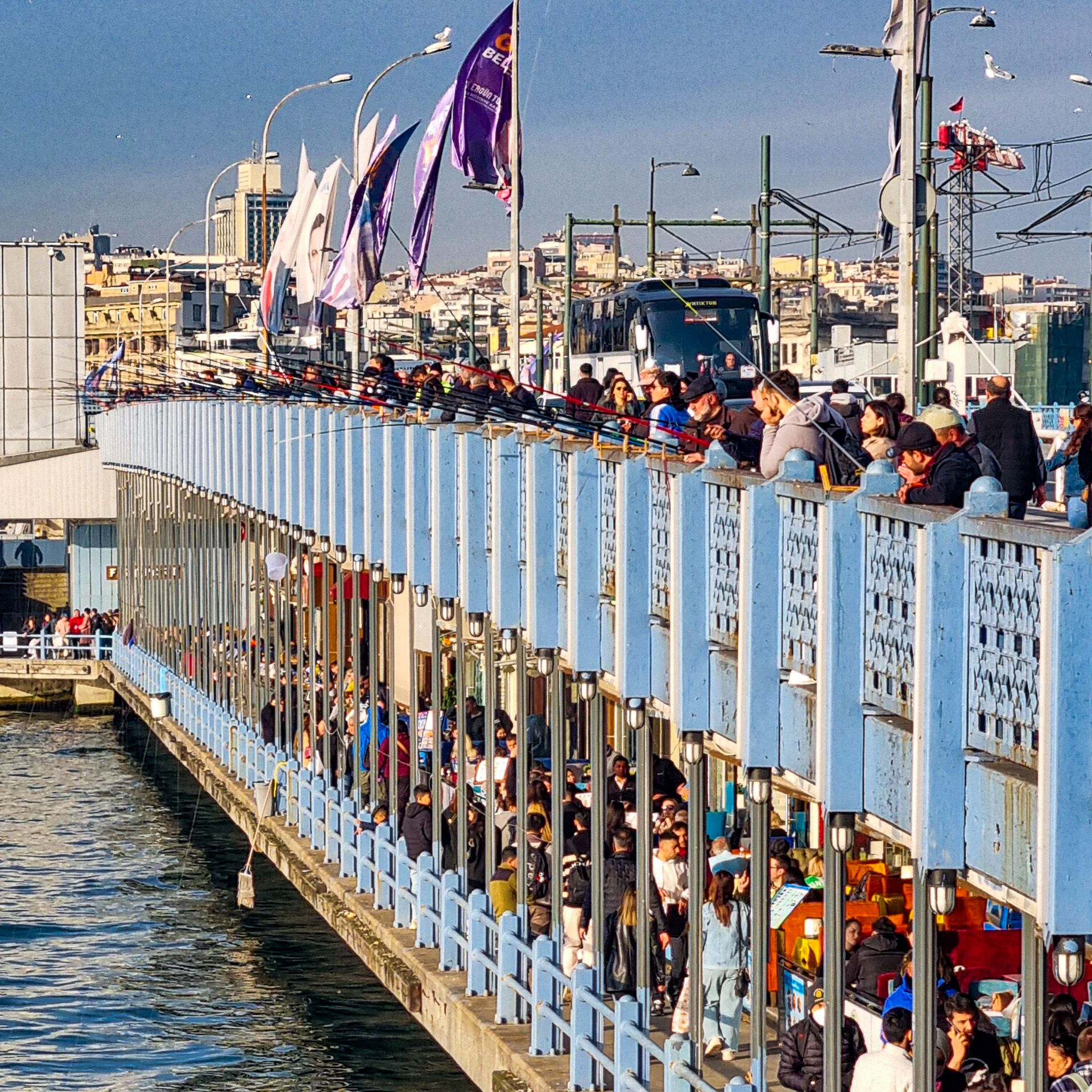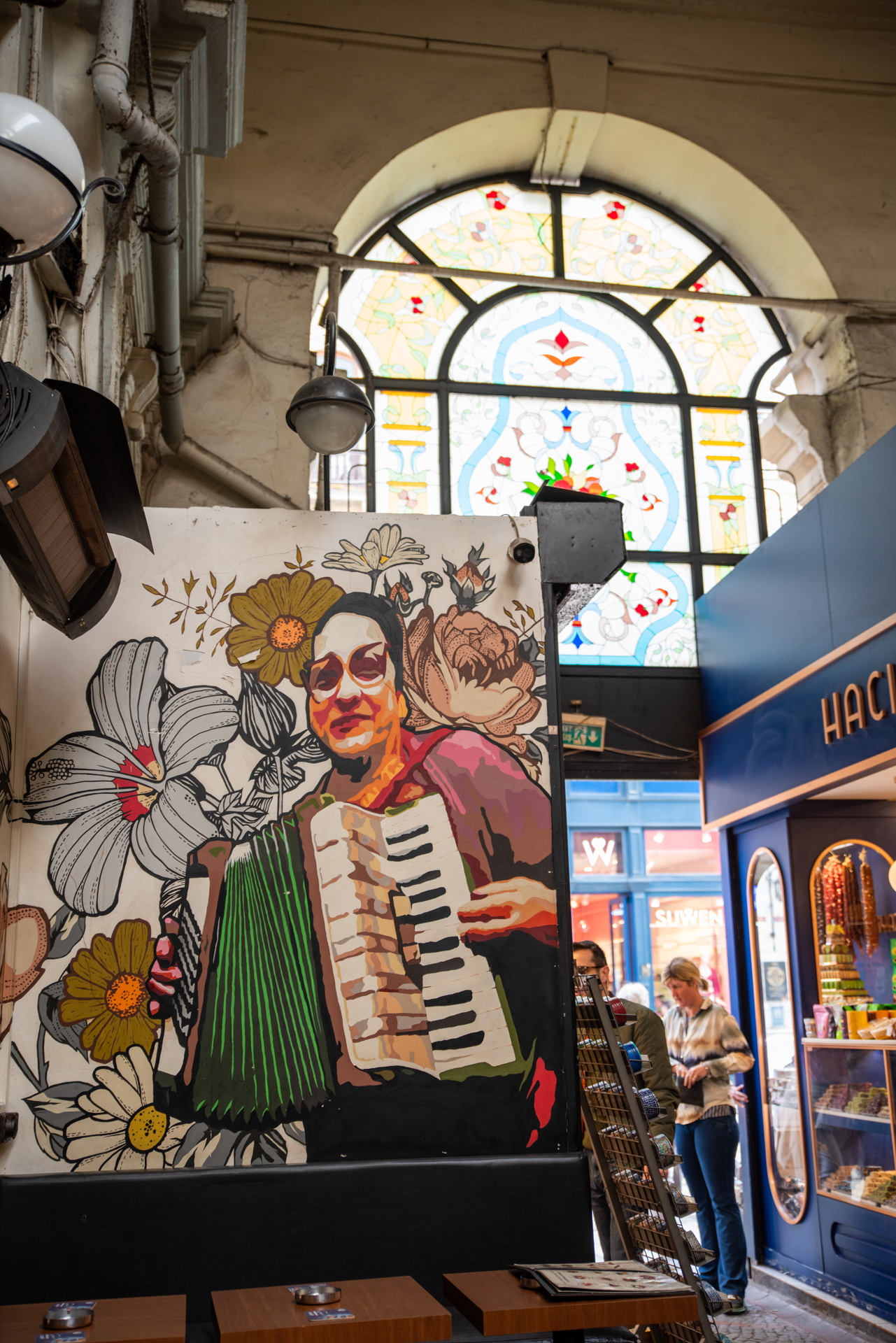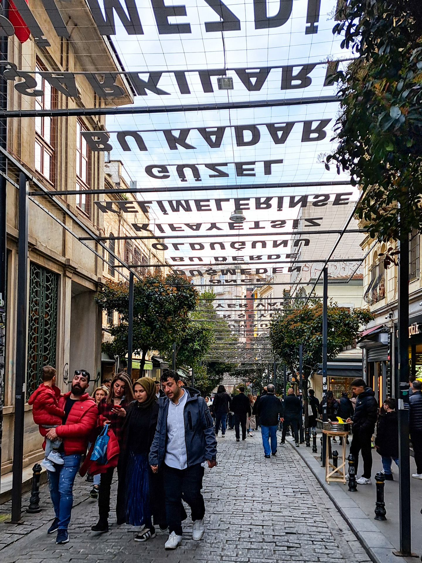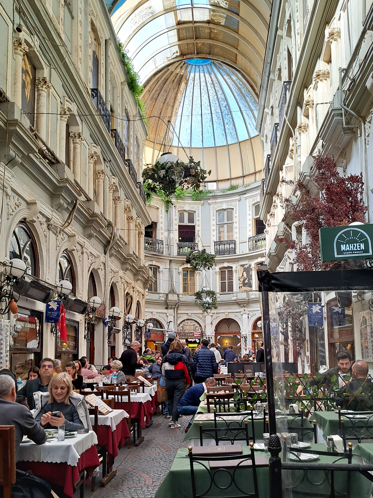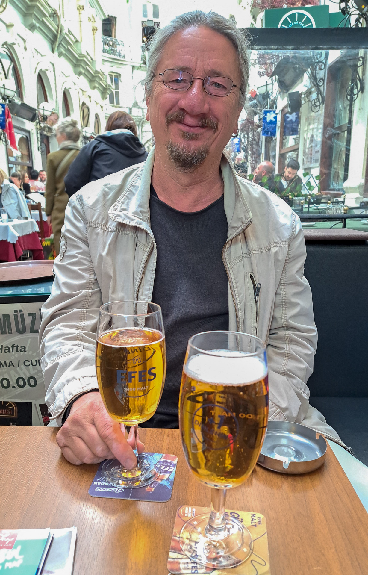 Über die Galata-Brücke mit ihren hunderten Anglern gelangen wir in den Stadtteil Beyoğlu und fahren von dort durch den Tünel mit der zweitältesten U-Bahn der Welt die gut 600 Meter hinauf nach Şişhane und bummeln die Istiklal Caddesi entlang bis zum Taksim Platz. Es ist Sonntagnachmittag und das Gedränge auf der großen Einkaufsmeile ist unglaublich. Zum Glück entdecken wir auf dem Rückweg vom Taksim die Çiçek Pasajı, eine historische Passage von 1876 mit mehreren kleinen Restaurants und vor allem: frisch gezapftem EFES.