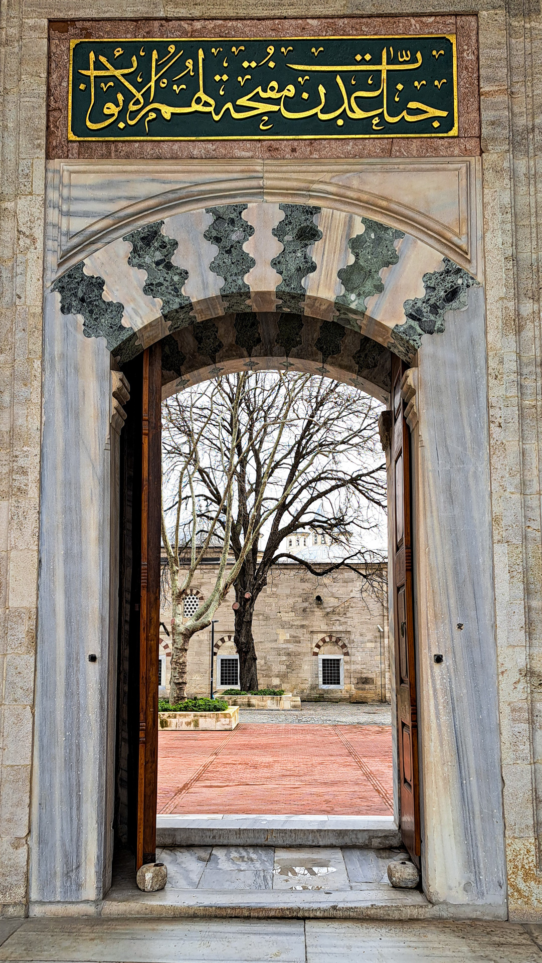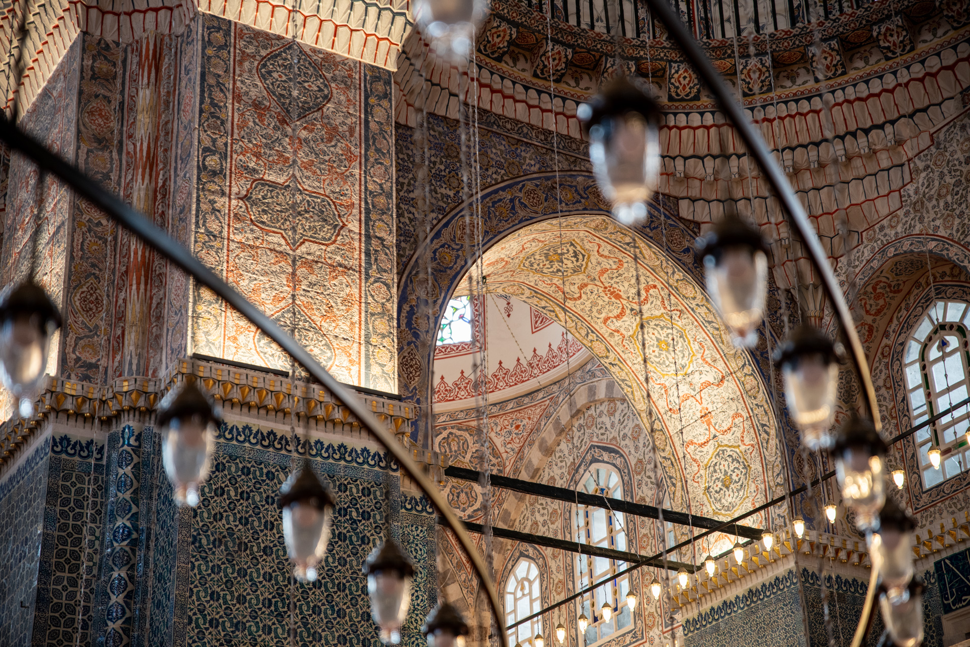 Zu unserer Überraschung ist der Eintritt in dieses touristische Highlight tatsächlich frei, selbst die obligatorischen Kopftücher für die Frauen werden am Eingang kostenlos verteilt. Gleiches gilt übrigens auch für alle anderen großen und kleinen Moscheen der Stadt, mit einer Ausnahme: die Hagia Sophia. Seit der erneuten Umwidmung des einstigen Museums zur Moschee im Jahr 2020 dürfen Touristen nicht mehr in den eigentlichen Gebetsraum, sondern nur auf die Empore im ersten Stock. Dafür sind pro Tourist 25€ Eintritt fällig, gläubige Muslime können die Moschee kostenlos betreten. Die Schlange am Touristeneingang sieht darüber hinaus nach mindestens 2-3 Stunden Anstehzeit aus und so beschließen wir fürs Erste, auf einen Besuch zu verzichten.