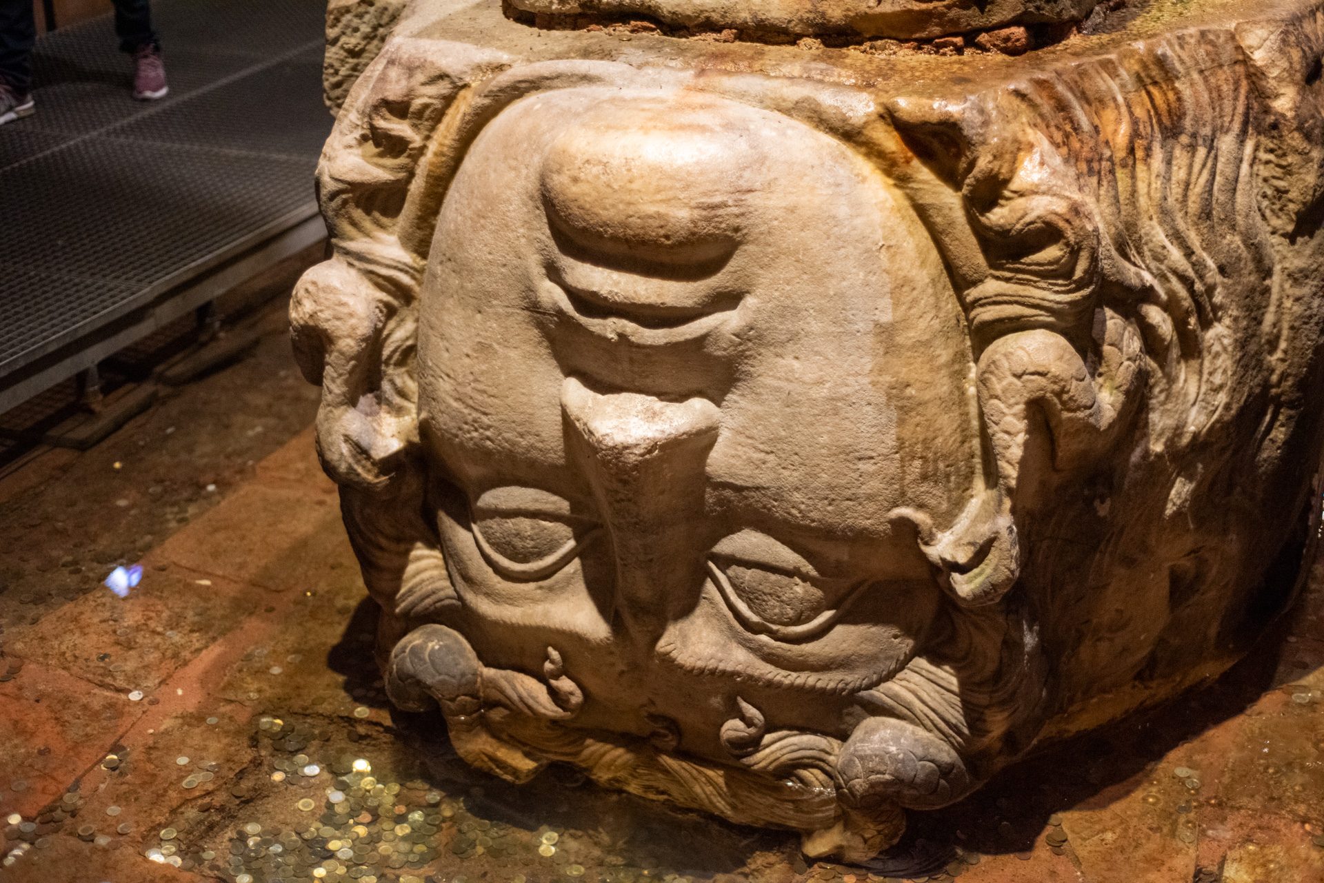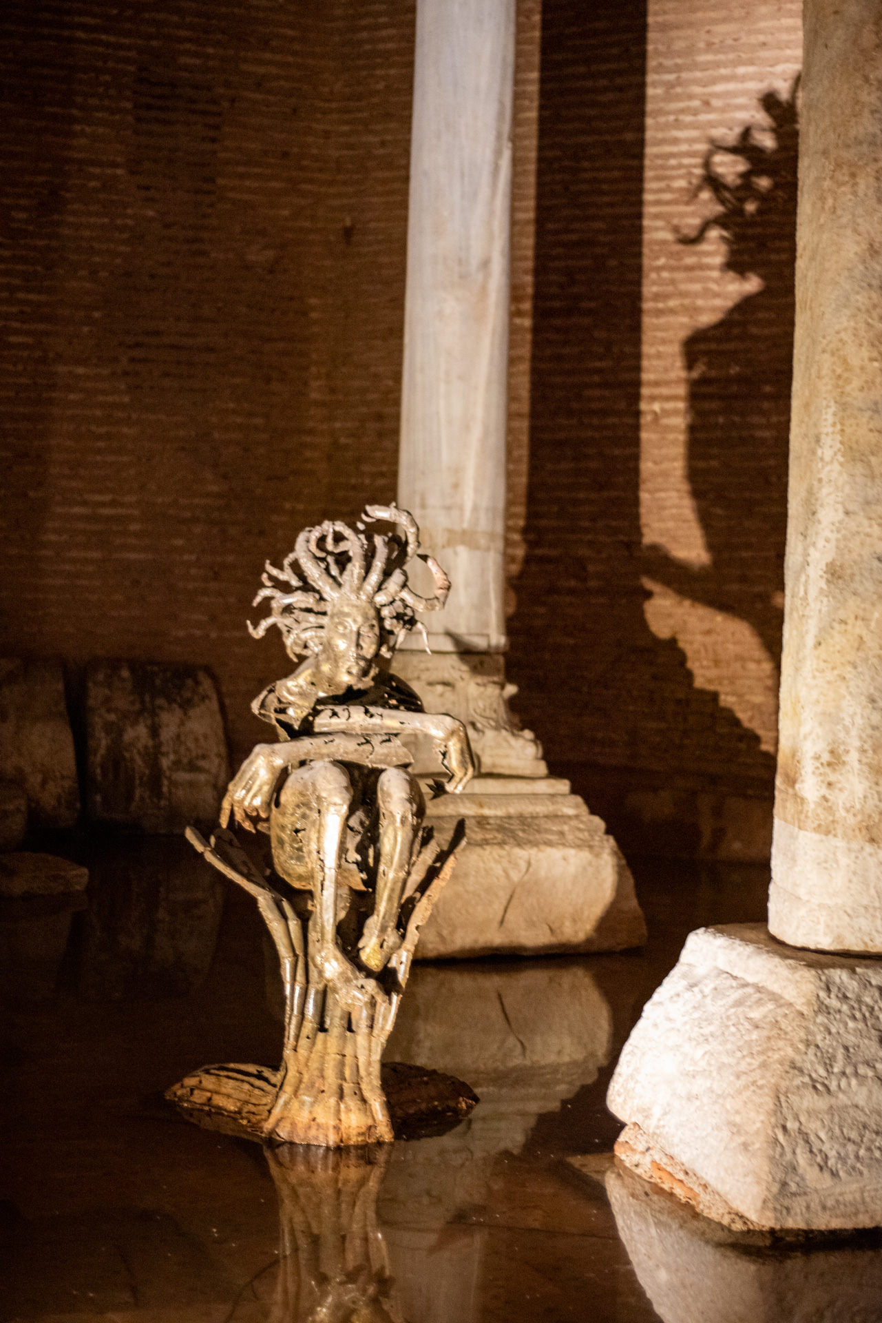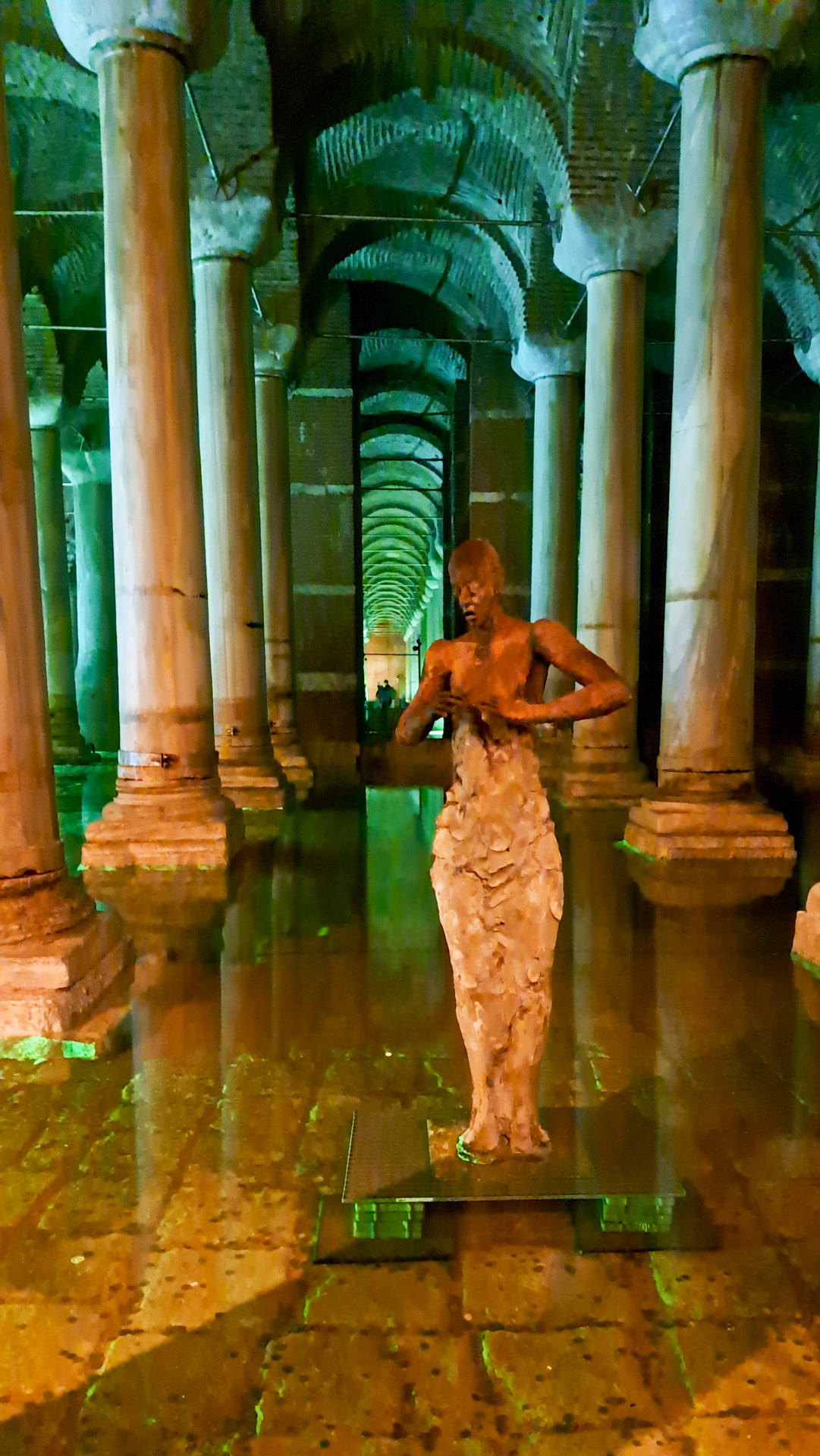 Am nächsten Morgen entscheiden wir uns, die 600 Lira (17€) Eintritt für die Yerebatan Sarnıcı doch noch zu investieren. Pünktlich um 9 Uhr stehen wir am Eingang und dürfen als eine der ersten die spätantike Zisterne betreten. Erbaut zwischen 532 und etwa 542 im Auftrag Kaiser Justinians diente sie als Wasserspeicher für den Großen Palast im damaligen Konstantinopel. Sie hat ein Fassungsvermögen von ca. 80.000 Kubikmetern Wasser. Das riesige Gewölbe wird getragen von 336 jeweils acht Meter hohen Säulen, angeordnet in zwölf Reihen. Neben der gelungenen Beleuchtung, die die riesigen Säulen in immer wieder wechselnden Farben in Szenen setzt, finden sich auch zahlreiche Werke moderner Künstler entlang des Steges, der für die Besichtigung installiert wurde. Ein absolut lohnendes Erlebnis.