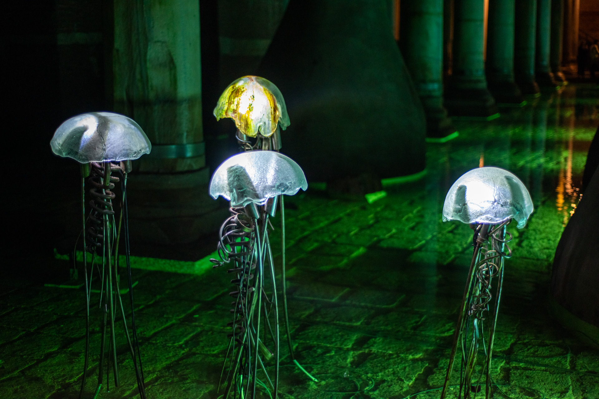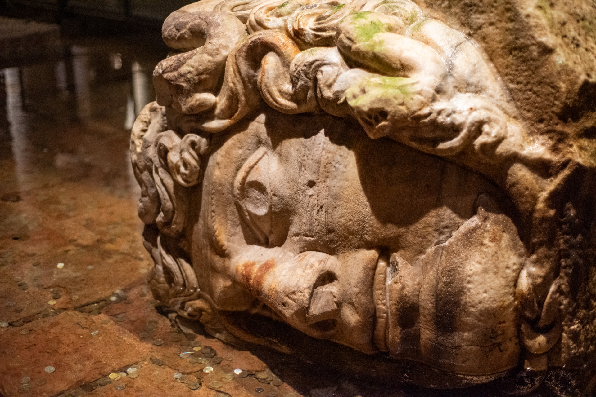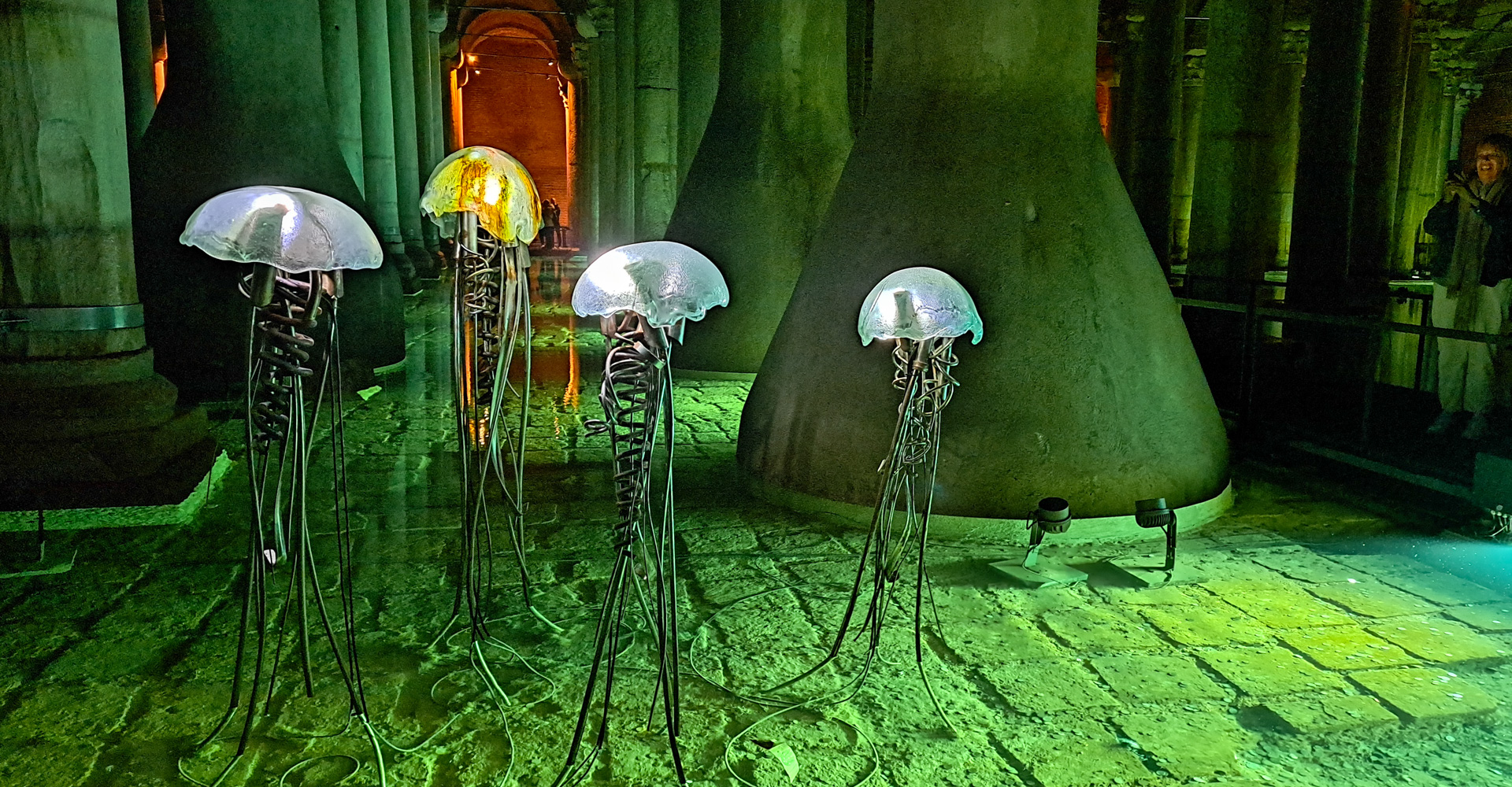 Am nächsten Morgen entscheiden wir uns, die 600 Lira (17€) Eintritt für die Yerebatan Sarnıcı doch noch zu investieren. Pünktlich um 9 Uhr stehen wir am Eingang und dürfen als eine der ersten die spätantike Zisterne betreten. Erbaut zwischen 532 und etwa 542 im Auftrag Kaiser Justinians diente sie als Wasserspeicher für den Großen Palast im damaligen Konstantinopel. Sie hat ein Fassungsvermögen von ca. 80.000 Kubikmetern Wasser. Das riesige Gewölbe wird getragen von 336 jeweils acht Meter hohen Säulen, angeordnet in zwölf Reihen. Neben der gelungenen Beleuchtung, die die riesigen Säulen in immer wieder wechselnden Farben in Szenen setzt, finden sich auch zahlreiche Werke moderner Künstler entlang des Steges, der für die Besichtigung installiert wurde. Ein absolut lohnendes Erlebnis.