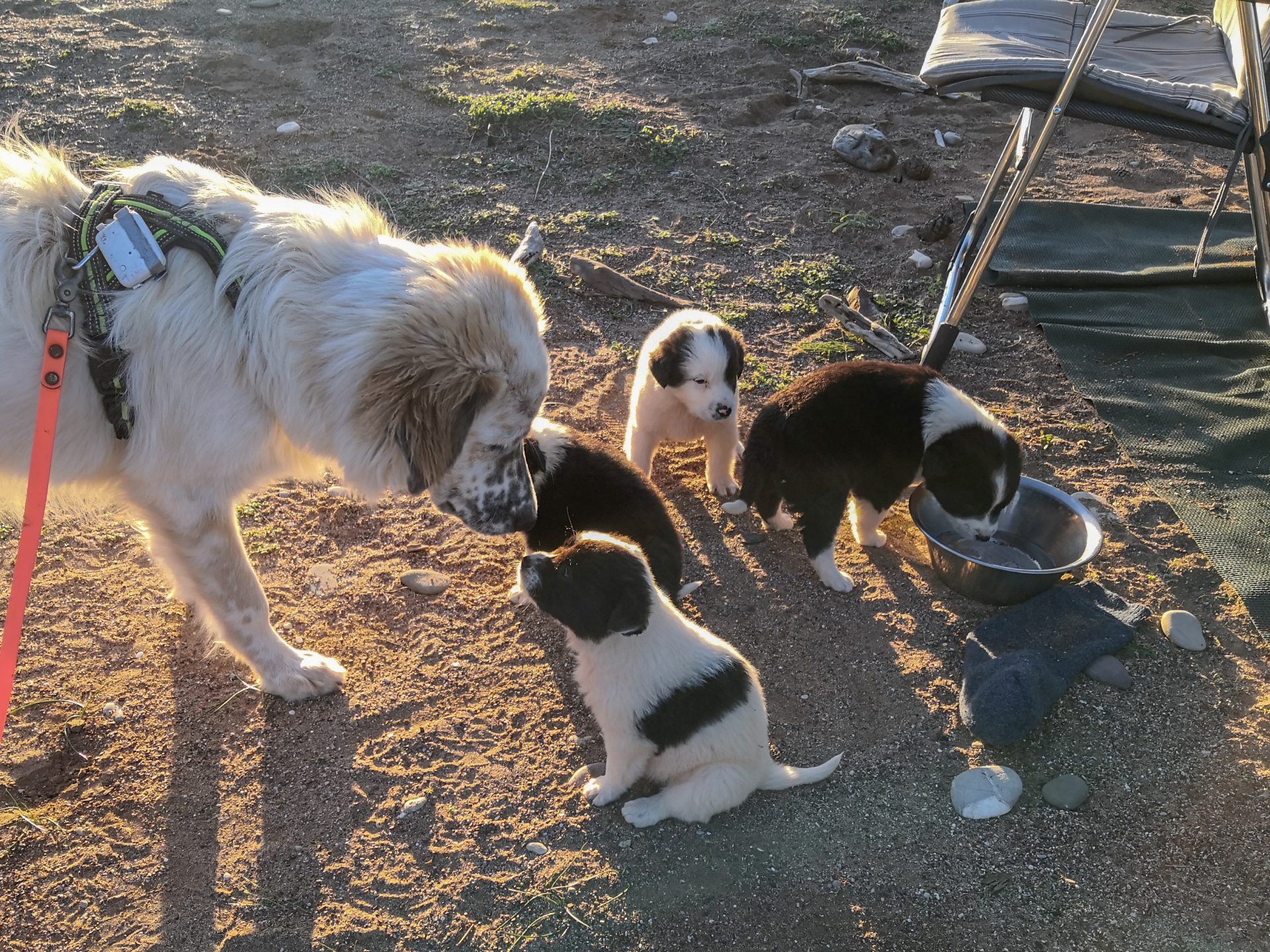 Zwischenzeitlich sind die beiden richtige Wonneproppen, ca. 3 Monate alt, und sie wachsen und wachsen. Yannis wiegt bereits 6,2 Kilo, Alma 5,6 Kilo! Sie halten uns natürlich ganz gewaltig auf Trab, sind zwar sauber, aber zwei kleine Spaziergänge in der Nacht brauchen sie immer noch. Außerdem: Wie war das mit dem „Hier“, „Sitz“, “Platz“ und „Bleib“???? Wir erinnern uns noch dunkel an die Erziehung von Tibo. Aber das war nur ein Welpe und außerdem ein Labrador. Zwei Racker und dann auch noch – zumindest zu einem großen Teil – Herdenschutzhunde, das ist eine ganz andere Herausforderung. Wir haben allerdings keine Bedenken mehr, dass sich irgendjemand oder irgendetwas unbemerkt unserem Oskar nähert, der ist zwischenzeitlich gut bewacht!