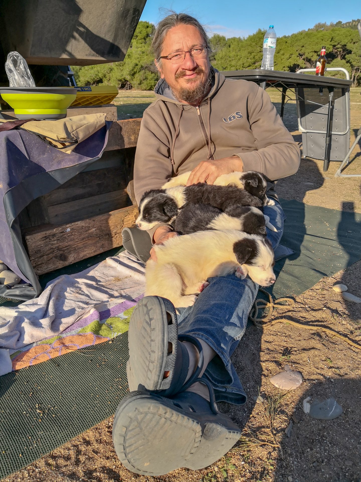 Wir fahren zurück nach Elea. Als erstes halten wir bei Michelle und Ulf, die am Anfang des Strandes stehen. Die Welpen müssen raus und wir brauchen Ansprache. Dann fahren wir weiter nach hinten, auf den Platz etwas abseits, an dem wir vorher gestanden sind. Da unser LKW schwer zu übersehen ist und wir uns ja erst vor knapp 3 Stunden von allen verabschiedet haben, bekommen wir bald Besuch. Es spricht sich schnell herum, dass wir gerade vier Welpen an Bord haben.
