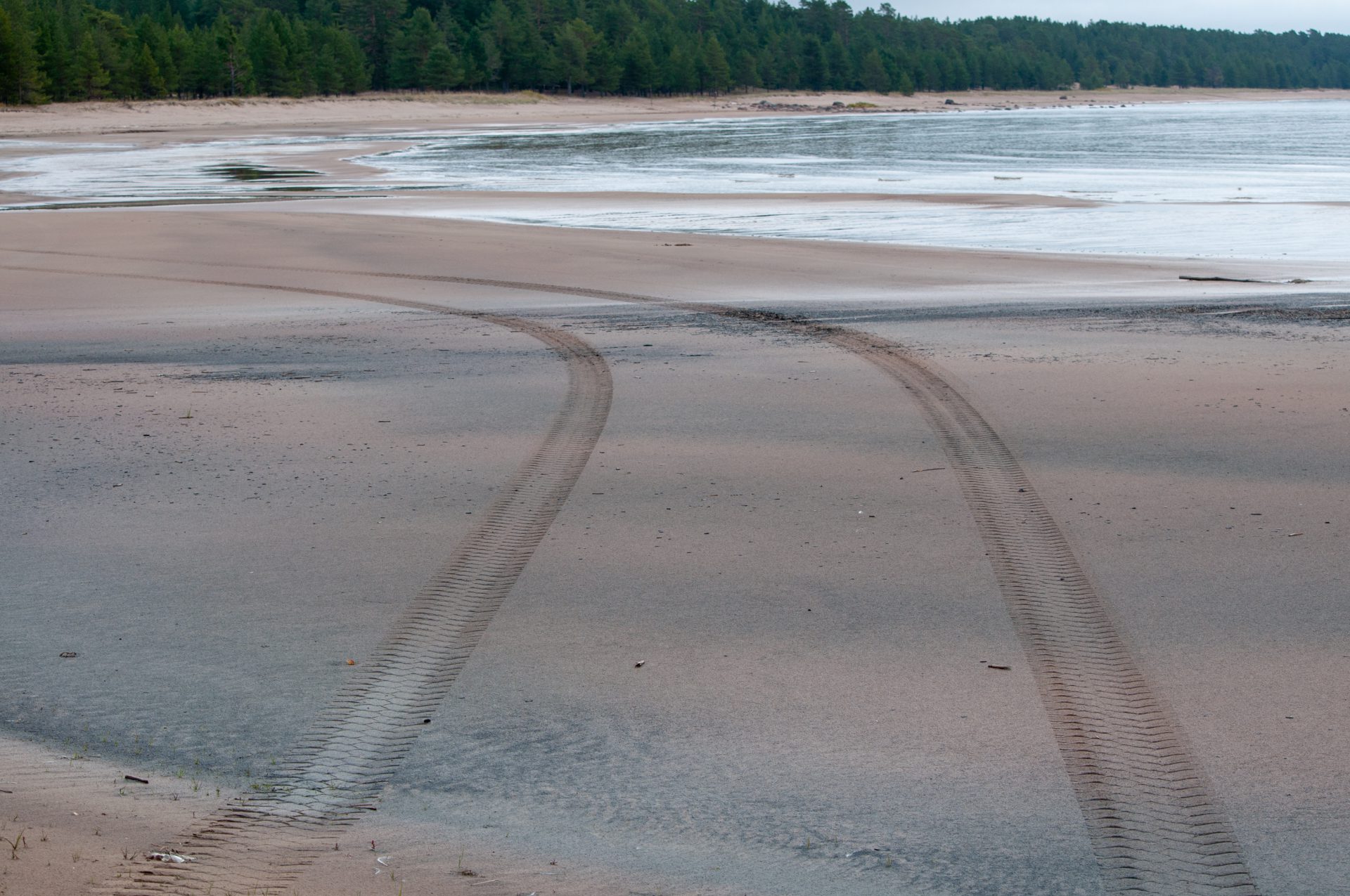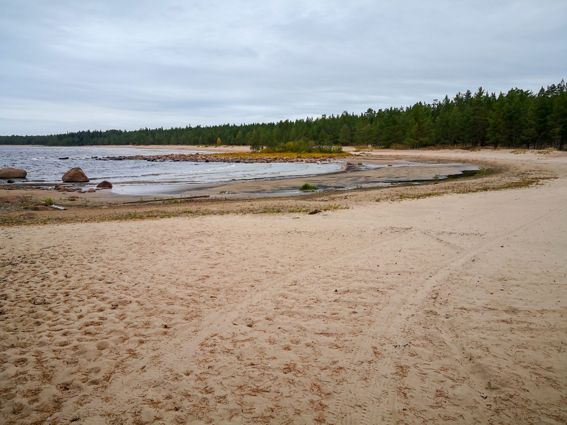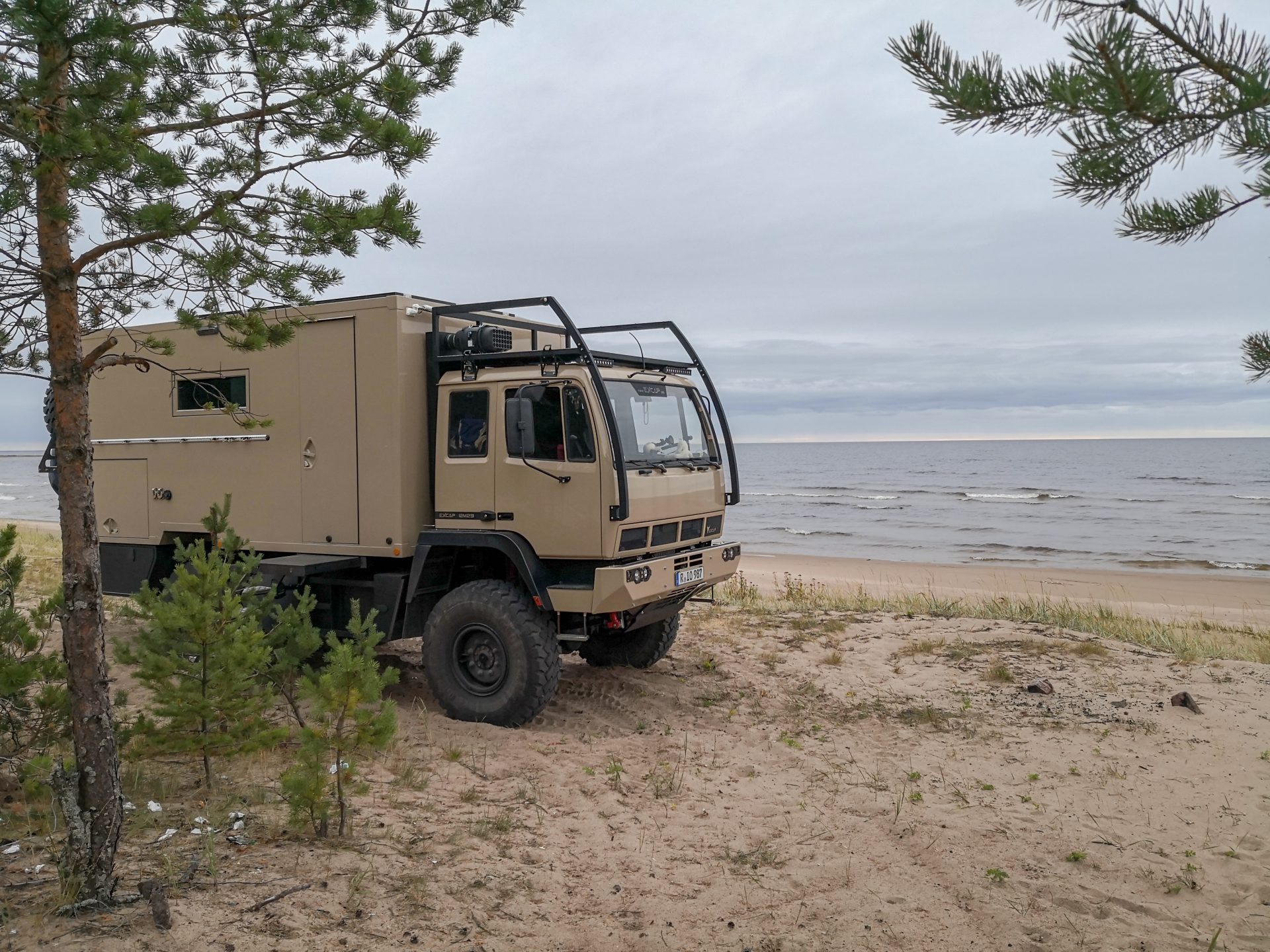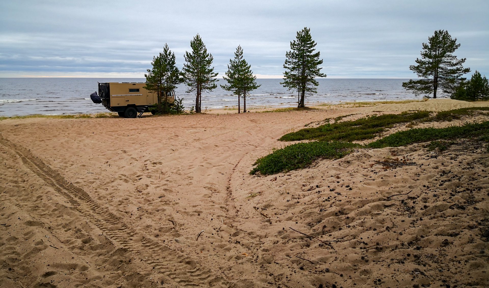 Sodann erkunden wir bei Helligkeit die Gegend. Wie kommen wir hier wieder raus? Gut ausgerüstet sind wir. Wir haben eine Astschere, eine Schaufel und eine Motorsäge an Bord. Zur Not sägen wir also einfach mal den Wald um, dann wird das schon werden. Denn durch die engen Waldwege kommen wir mit unserem Dicken nicht. Zurück wollen wir auch nicht. Da sehen wir einen breiteren Weg – der über den Sandstrand auf der anderen Seite führt. Ein bisschen Sandfahren üben schadet ja nicht! Auf geht’s. Ich laufe voraus, falls doch irgendetwas aus dem Weg zu räumen wäre. Aber Jochen mit Karacho und Bravour rein in den Sand und schnell wieder raus. Offroad durch den Wald und wir sind wieder in der Zivilisation. Schön war’s am Ladogasee.