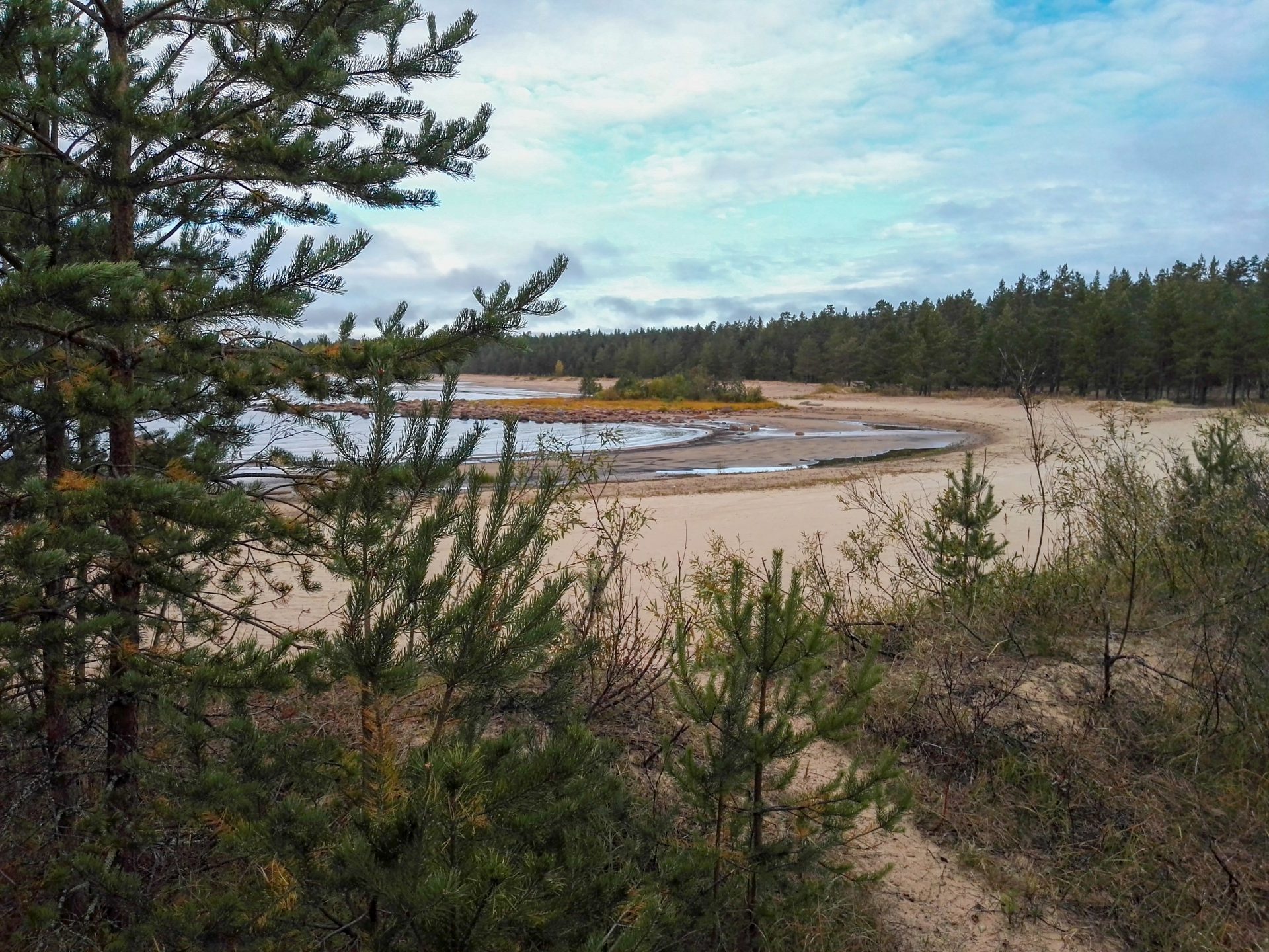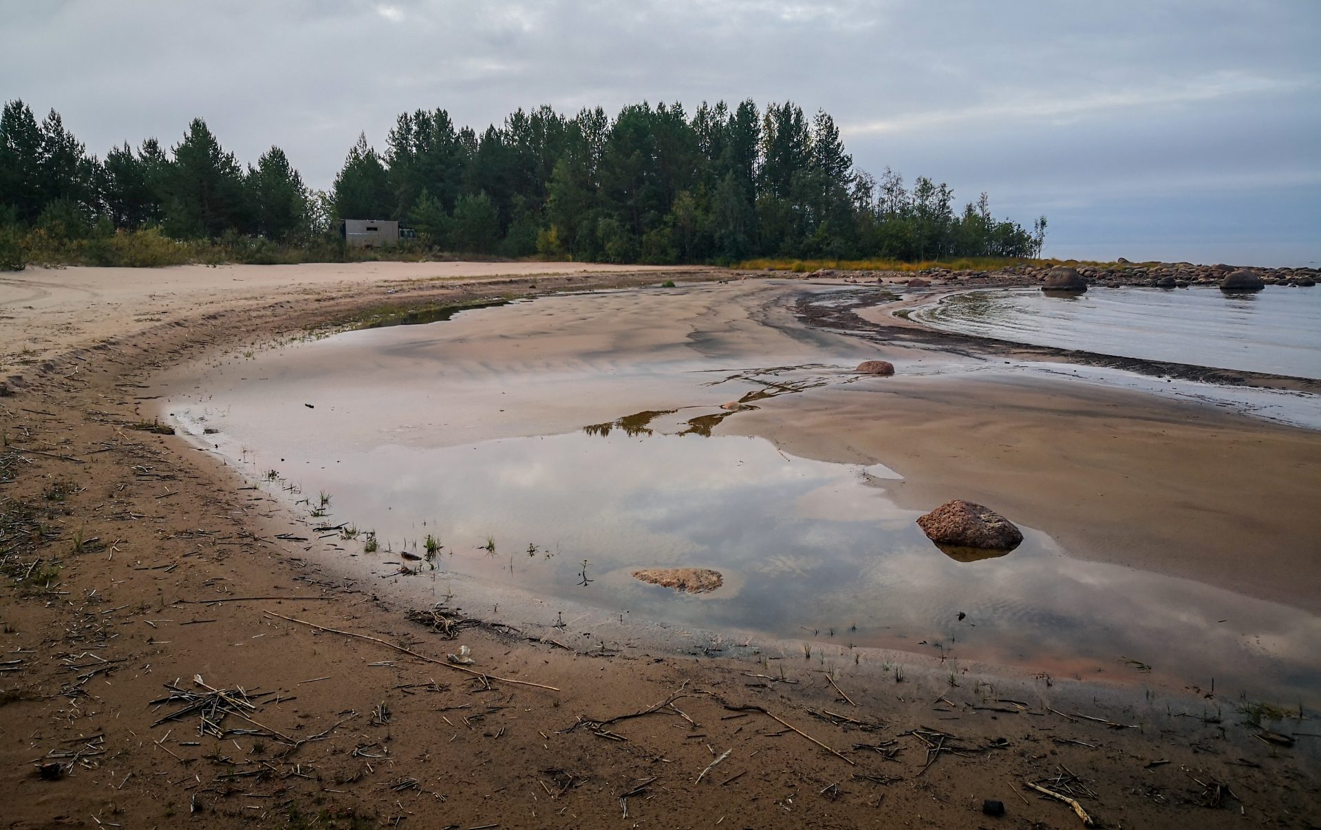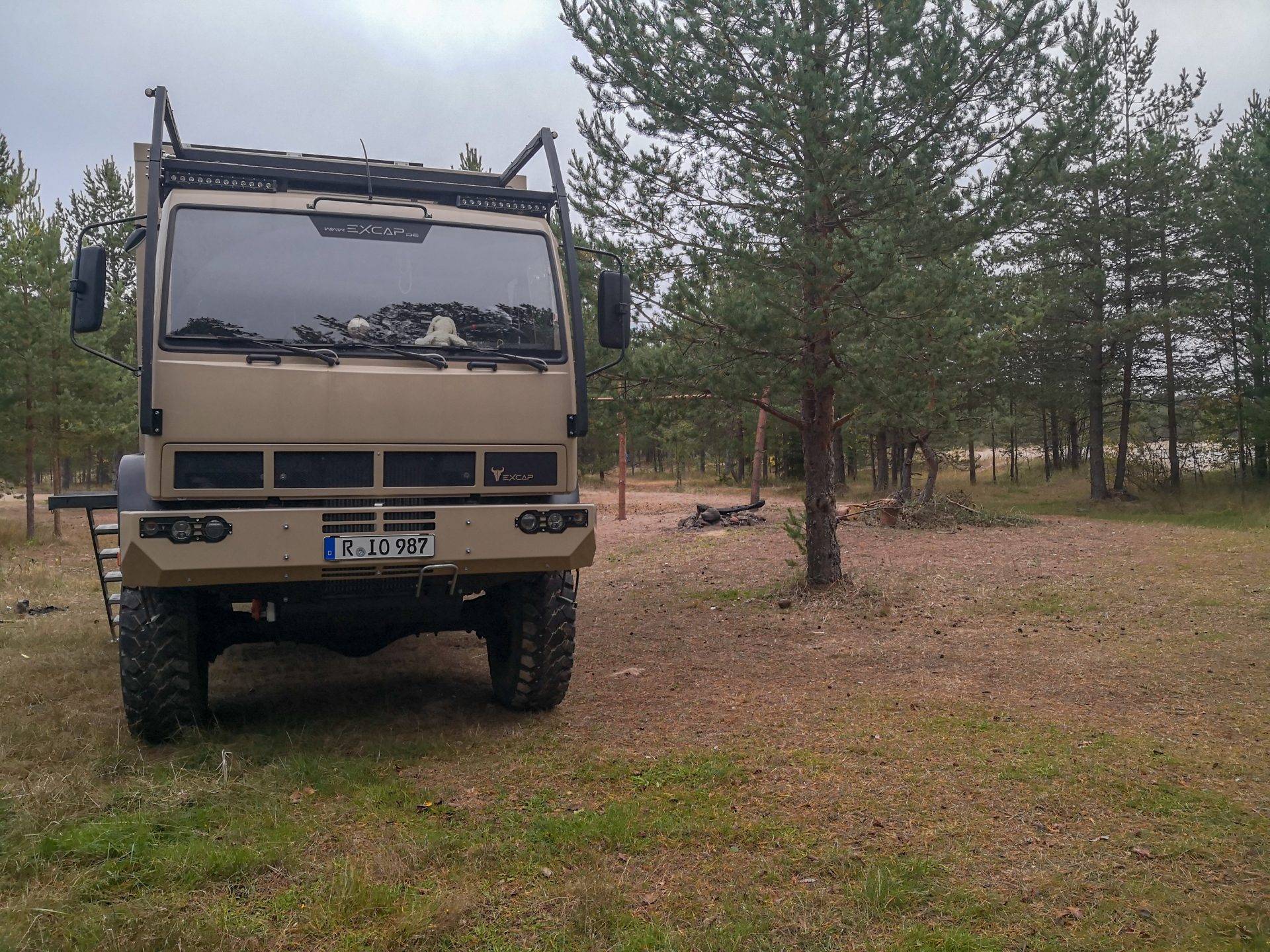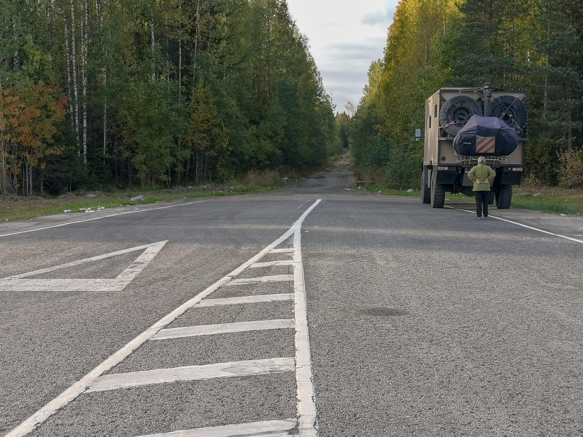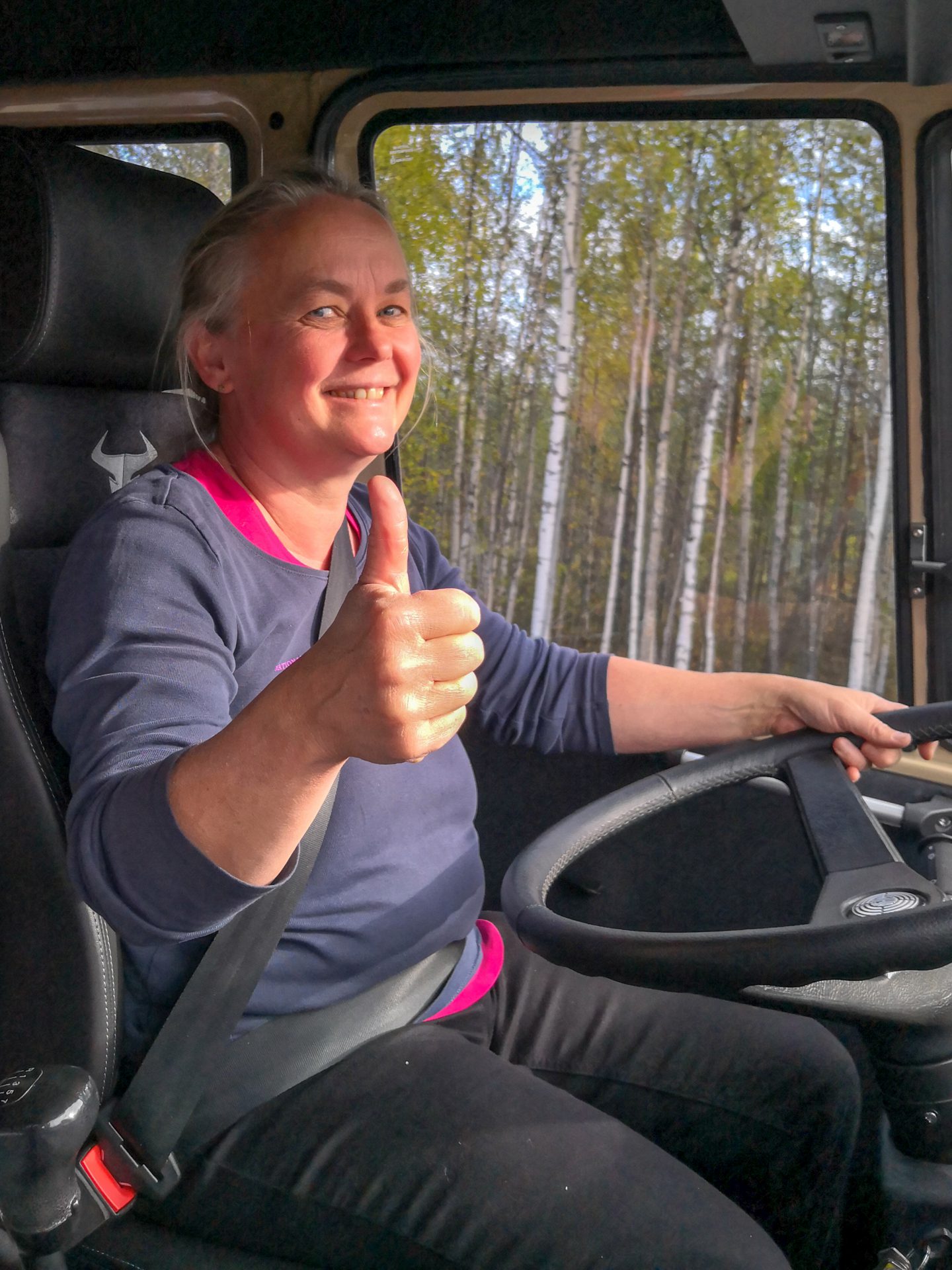 Sodann erkunden wir bei Helligkeit die Gegend. Wie kommen wir hier wieder raus? Gut ausgerüstet sind wir. Wir haben eine Astschere, eine Schaufel und eine Motorsäge an Bord. Zur Not sägen wir also einfach mal den Wald um, dann wird das schon werden. Denn durch die engen Waldwege kommen wir mit unserem Dicken nicht. Zurück wollen wir auch nicht. Da sehen wir einen breiteren Weg – der über den Sandstrand auf der anderen Seite führt. Ein bisschen Sandfahren üben schadet ja nicht! Auf geht’s. Ich laufe voraus, falls doch irgendetwas aus dem Weg zu räumen wäre. Aber Jochen mit Karacho und Bravour rein in den Sand und schnell wieder raus. Offroad durch den Wald und wir sind wieder in der Zivilisation. Schön war’s am Ladogasee.