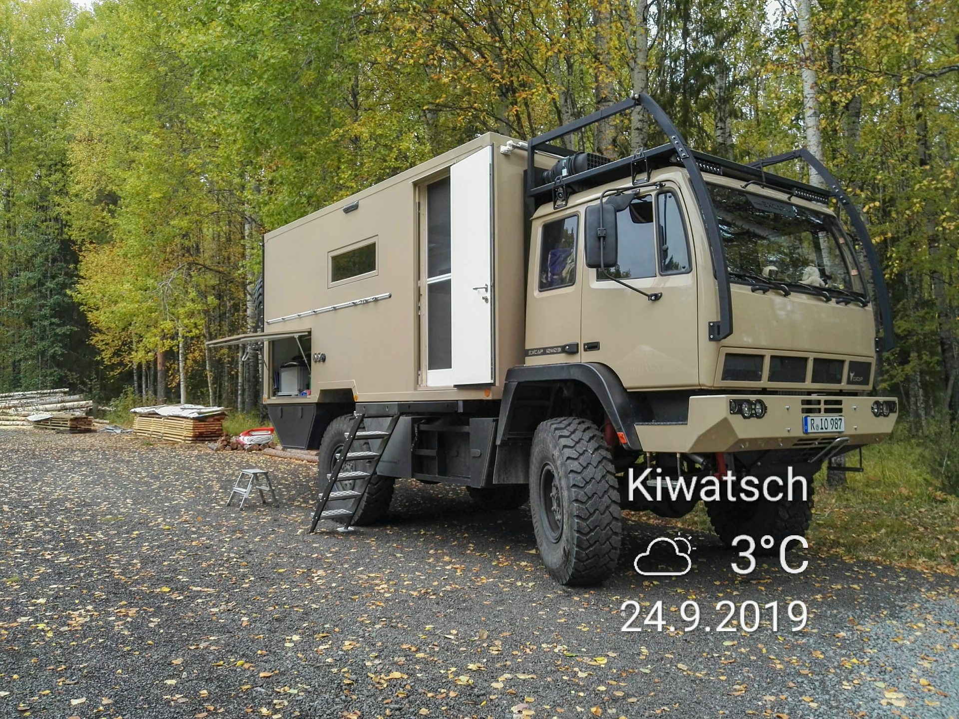 Am nächsten Tag wollen wir nach Kiwatsch. Hier soll es den berühmten Kiwatschwasserfall geben! Wir wussten zu dem Zeitpunkt nicht, dass dort auch jede Menge wilder Tiere auf uns warten. Wir steuern einen der wenigen Campingplätze an, da es in dieser Gegend schwierig ist, frei zu stehen. Die E105 ist geradeaus durch ewige Wälder geschlagen, Abfahrten nach rechts oder links sind schwierig bis nicht möglich. Am Campingplatz angekommen, wird unsere in offensichtlich perfektem Russisch vorgetragene Frage: Guten Tag, sprechen Sie Englisch? mal wieder mit einem nachdrücklichen Njet! beantwortet. Aber der junge Mann ist sehr freundlich und zuvorkommend und wir verständigen uns sehr gut mit Händen und Füßen. Der Platz ist für unser Fahrzeug an und für sich nicht geeignet. Es ist ein liebevoll hergerichteter Platz für Zelt- und Jugendgruppen. Aber da rein gar nichts los ist, dürfen wir eine Nacht bleiben. Am Abend gibt es ein leckeres Wachteleieressen!