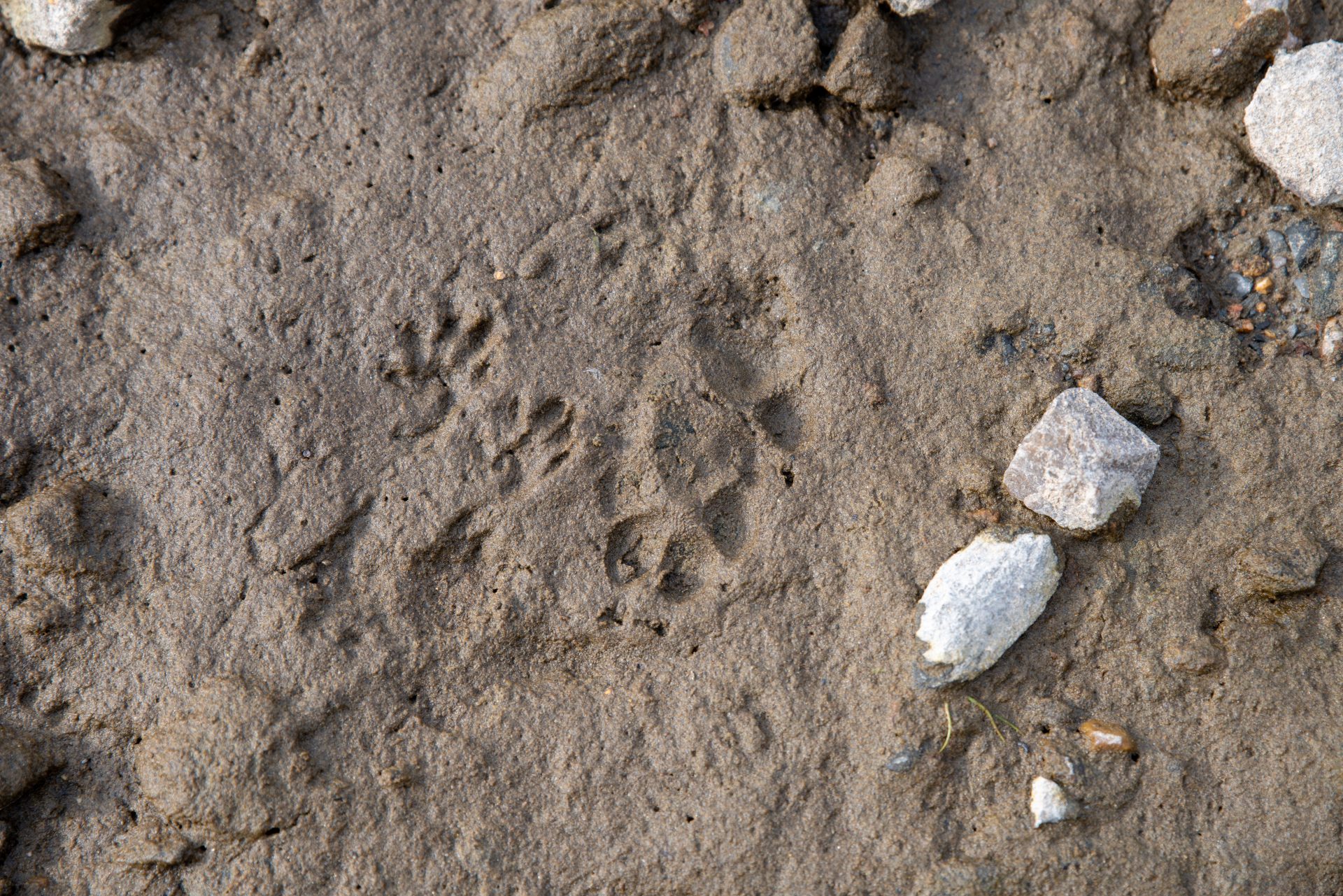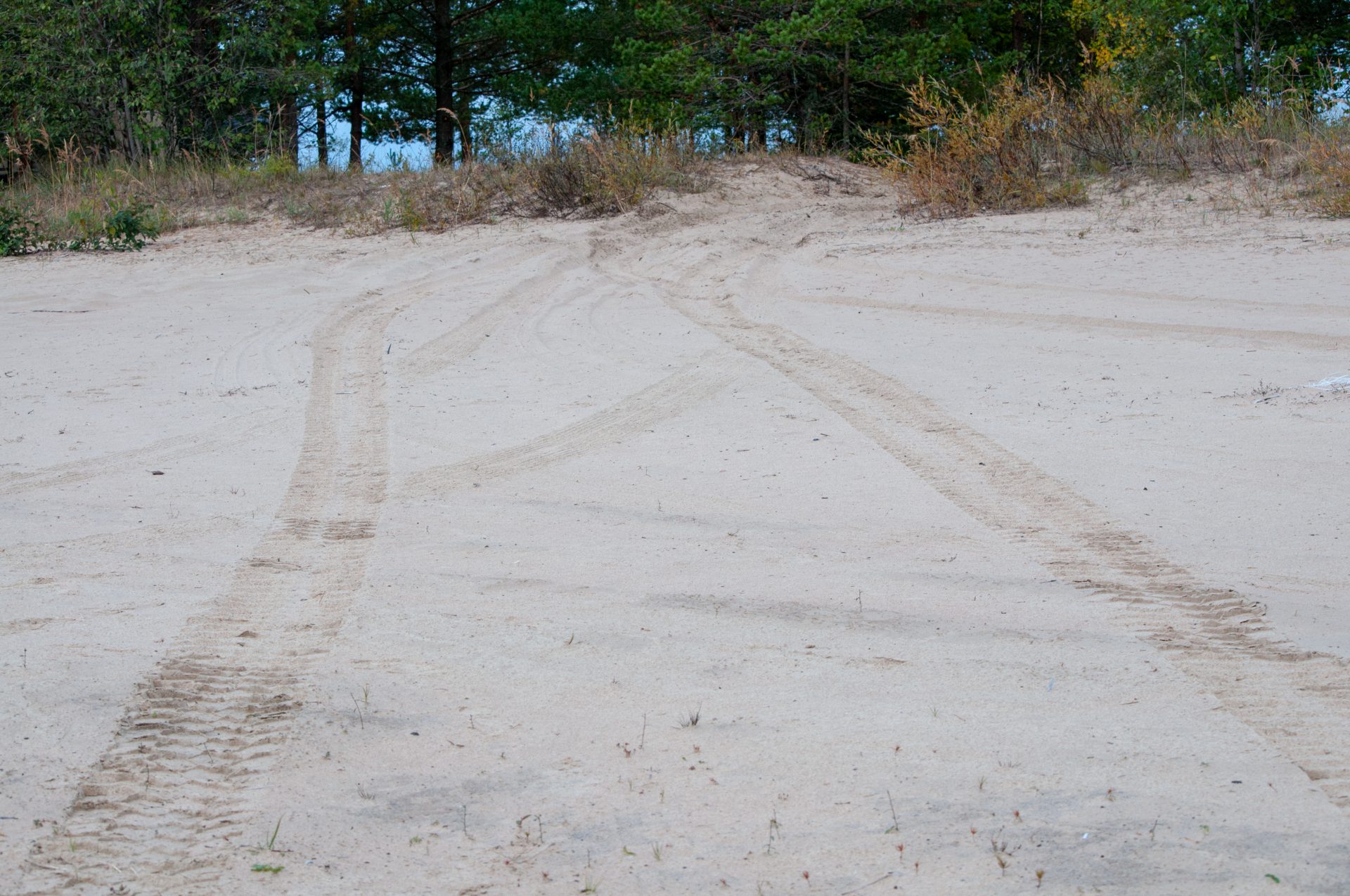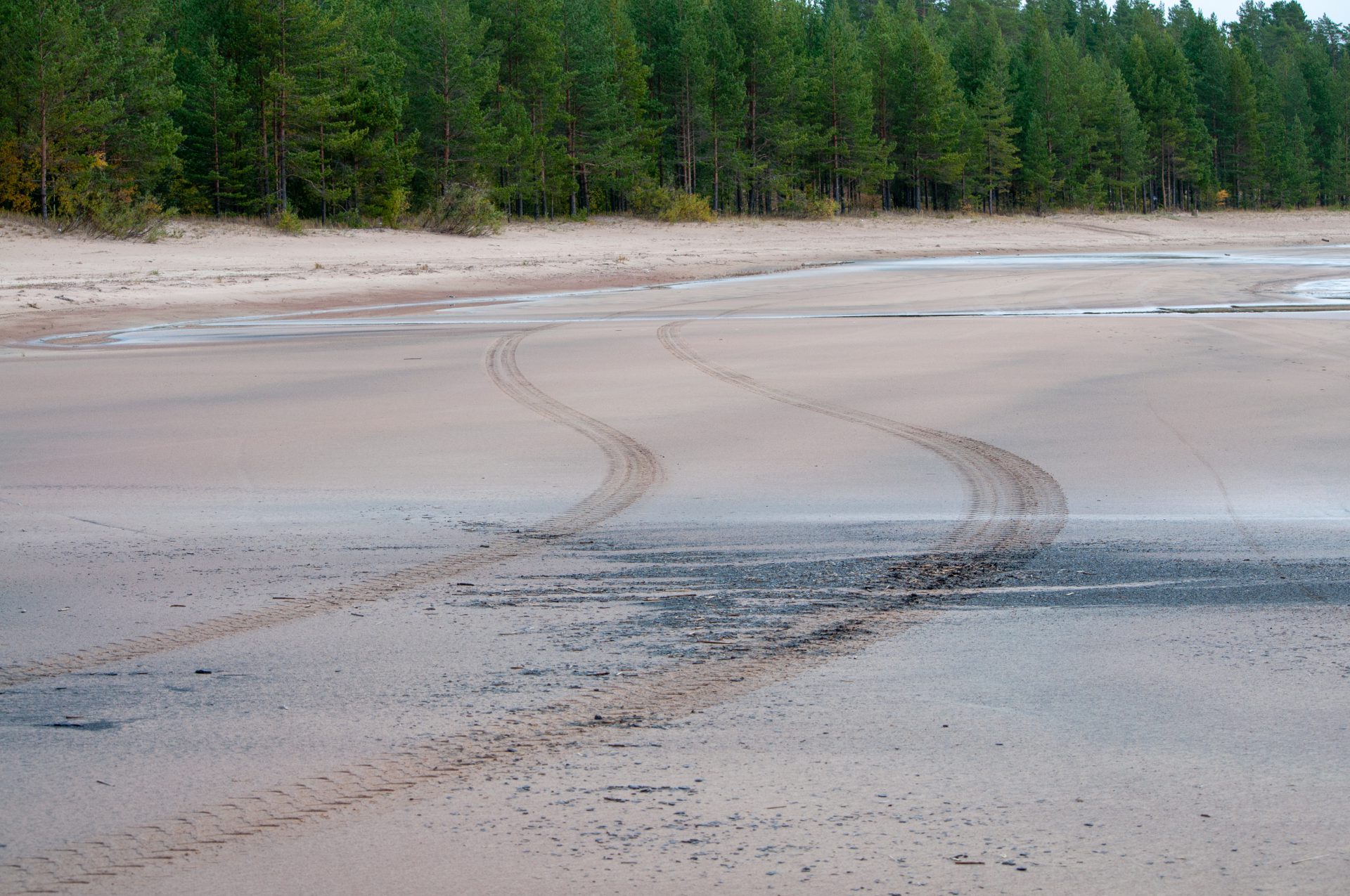 So. Es ist schon spät und wird dunkel. Der Strand ist nun einsam und leer. Wie kommen wir denn da wieder raus? Wir fahren den Strand zurück zu der Böschung, an der wir runter gefahren sind. Aber Rauffahren – Fehlanzeige. Wir sinken jedes Mal so tief ein, dass wir uns festgraben würden, wenn wir das weiter versuchen. Wir versuchen es an anderen Stellen. Nichts geht. Der Sand ist so tief und weich und Oskar so dick und schwer… Es wird dunkler…. Glücklicherweise waren wir am Nachmittag eine große Runde am Strand spazieren und wussten, dass es ein ganzes Stück weiter ein wenig flacher wird und auf eine Wiese geht, an die sich der Wald anschließt. Der harte Sand direkt am Wasser trägt uns. Allerdings sind an einer Stelle zahlreiche hohe Steine, die den Weg versperren. Oskar sei Dank, Offroad kann er ja. Dann haben wir es endlich geschafft. Mit Schmackes die flache Böschung hoch und schon stehen wir auf der Wiese. Vor uns aber nun nur Wald, kein Durchkommen auf den kleinen Wegen zur Straße. Wir beschließen zu bleiben und die Lösung des Problems auf morgen zu verschieben. Wir haben Hunger und brauchen jetzt dringend ein Bier! Und in all der Aufregung haben wir natürlich vergessen, von dieser Chaosaktion ein tolles Video zu drehen. Am nächsten Morgen bieten immerhin die Reifenspuren noch ein paar Bilder an. Wir müssen noch viel lernen auf der Reise!