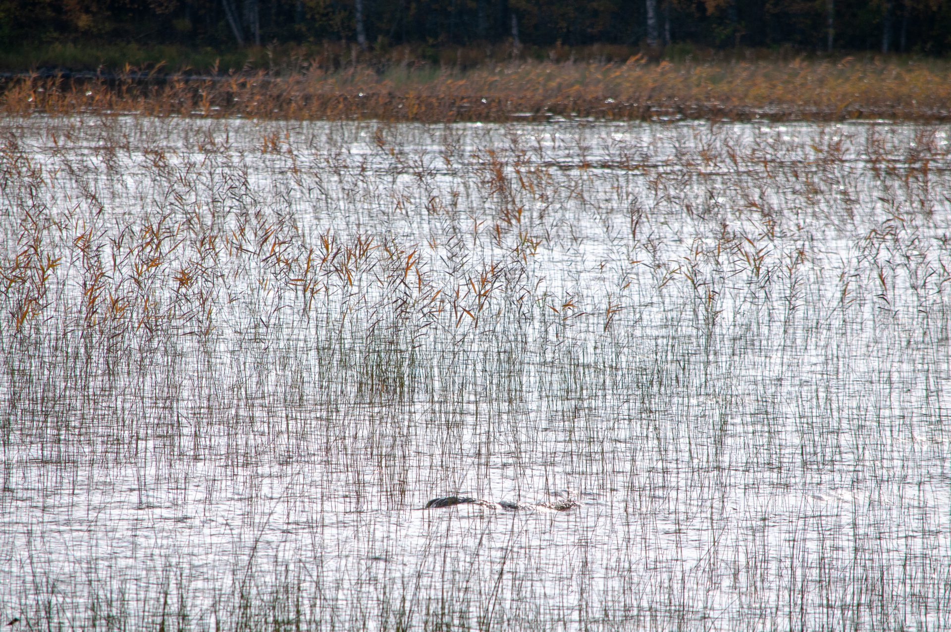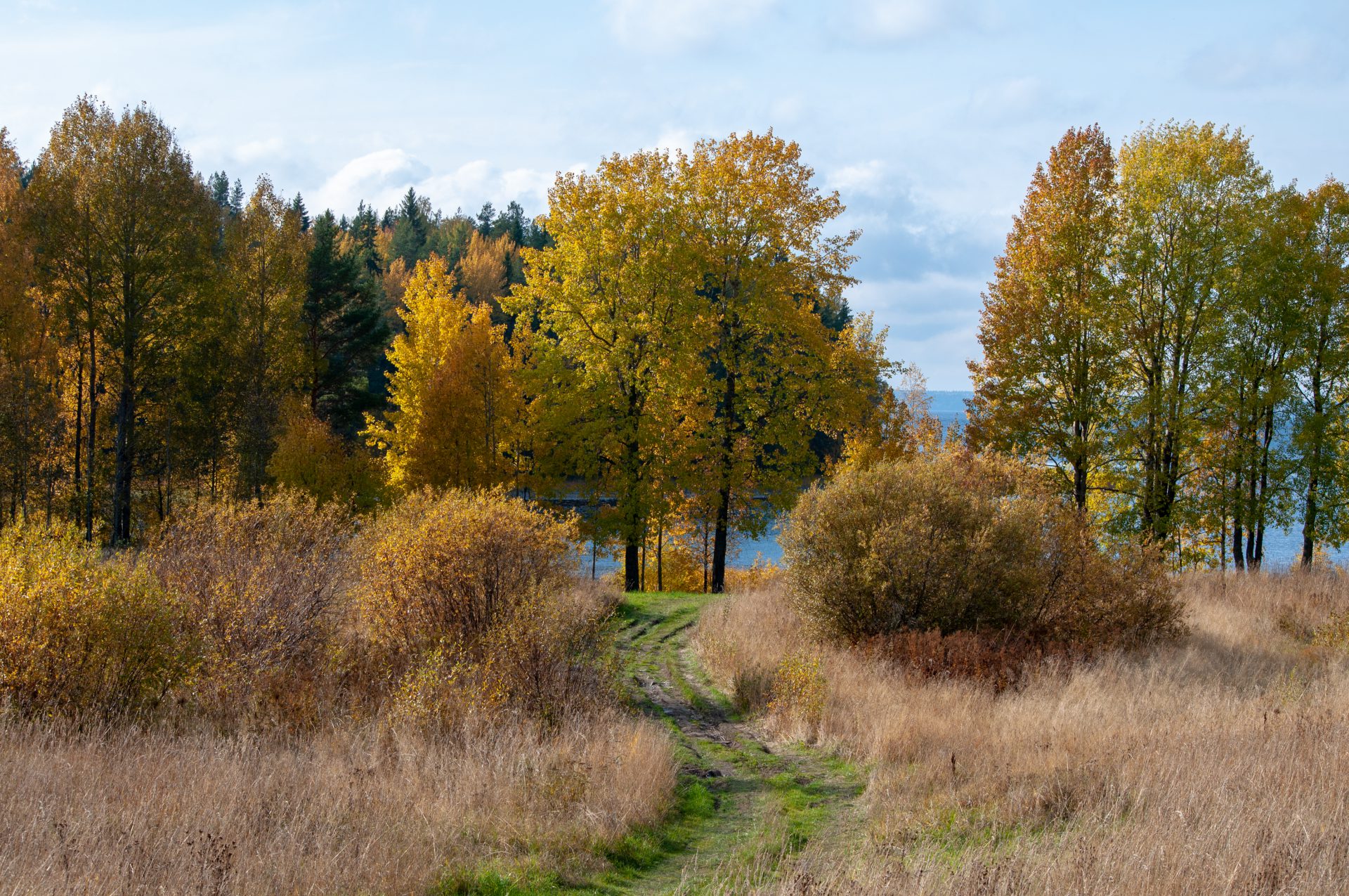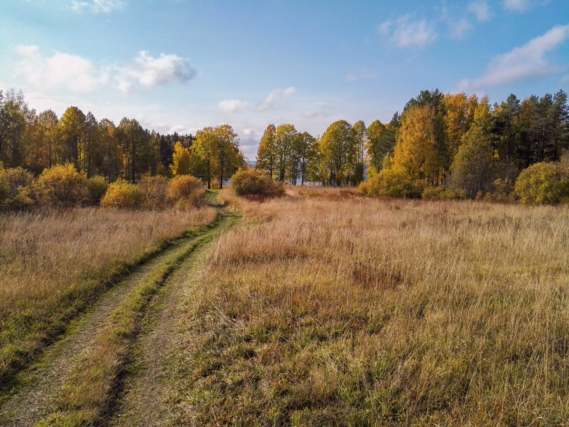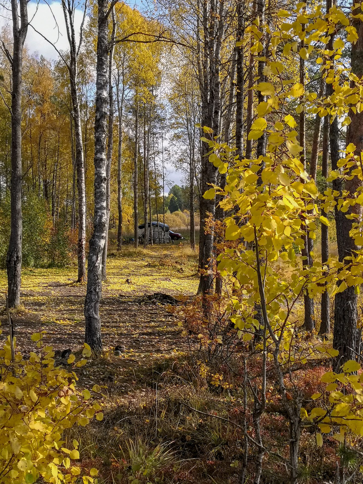 Am nächsten Tag beschließen wir, nochmals ins Landesinnere Richtung Norden zu fahren in der Hoffnung, dass das Wetter einigermaßen mitspielt. Wir wollen um den Ozero Yanis Yarvi fahren und uns einen Platz am See suchen. Wir nehmen die Straße Richtung Alattu und stellen uns schon mal gedanklich auf Schlaglochpiste ein. Hinter Alattu endet die Teerstraße und geht in eine Schotterpiste über. Das ist erheblich besser als Teerstraßen mit Löchern und Wellen. Die Sonne scheint und wir erfreuen uns an den wunderschönen Herbstfarben. Um an den See zu gelangen, biegen wir auf einen kleinen Feldweg ein. Wir sind auf der Strecke kaum einem Auto begegnet, die Gegend ist sehr dünn besiedelt. Wir wähnen uns einsam und allein, wie schön. Aber die Menschen in Russland lieben das Leben in der Natur, angeln, grillen, Lagerfeuer. So treffen wir auf zwei Männer und eine Frau, die etwas konsterniert kucken angesichts des seltsamen deutschen Fahrzeugs und deren Insassen. Wir begrüßen uns und verständigen uns wieder mit Händen und Füßen. Nur einer der beiden Herren spricht etwas englisch. Dann geht jeder seiner Wege, wir machen einen langen Spaziergang und genießen die Abendsonne.