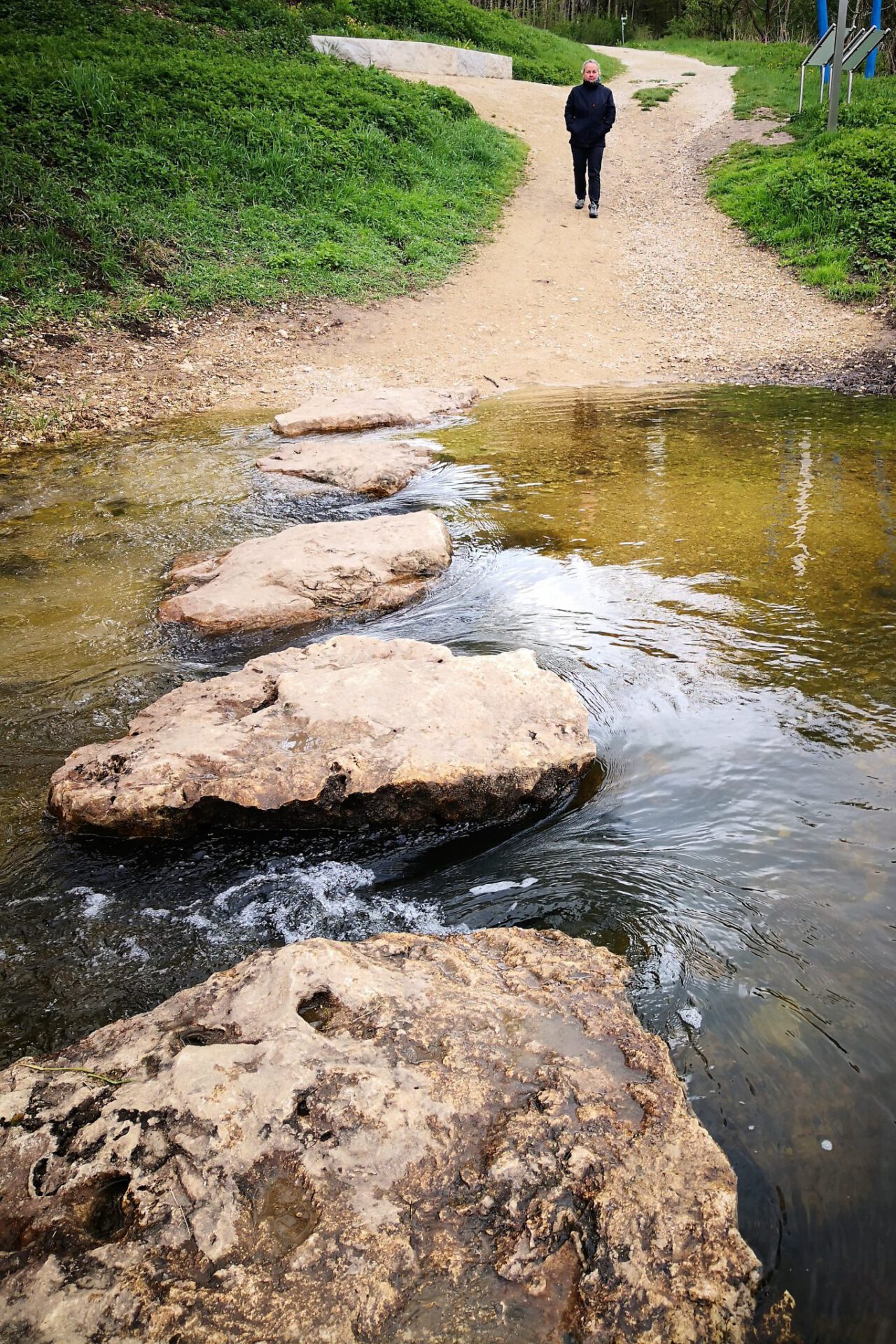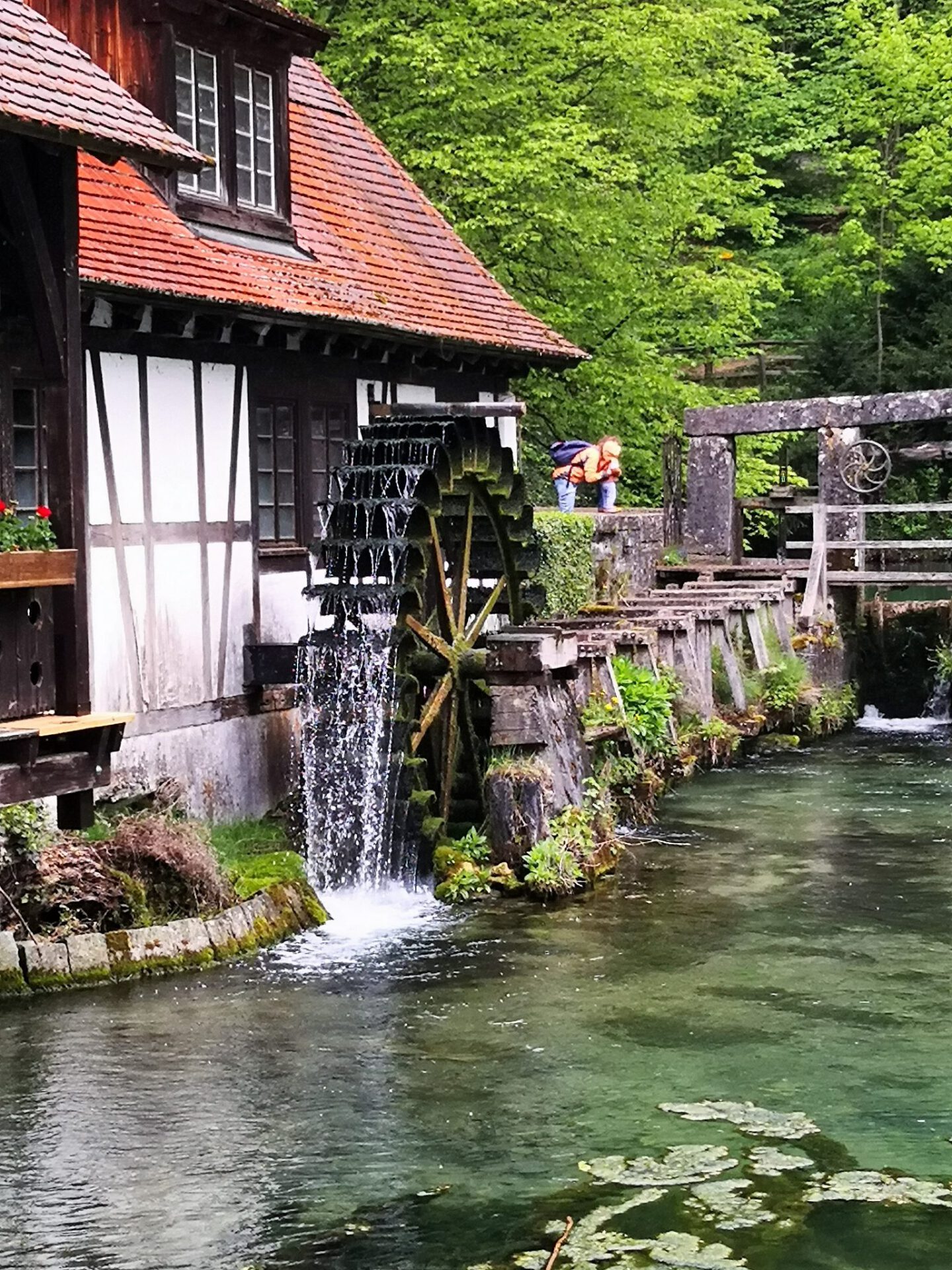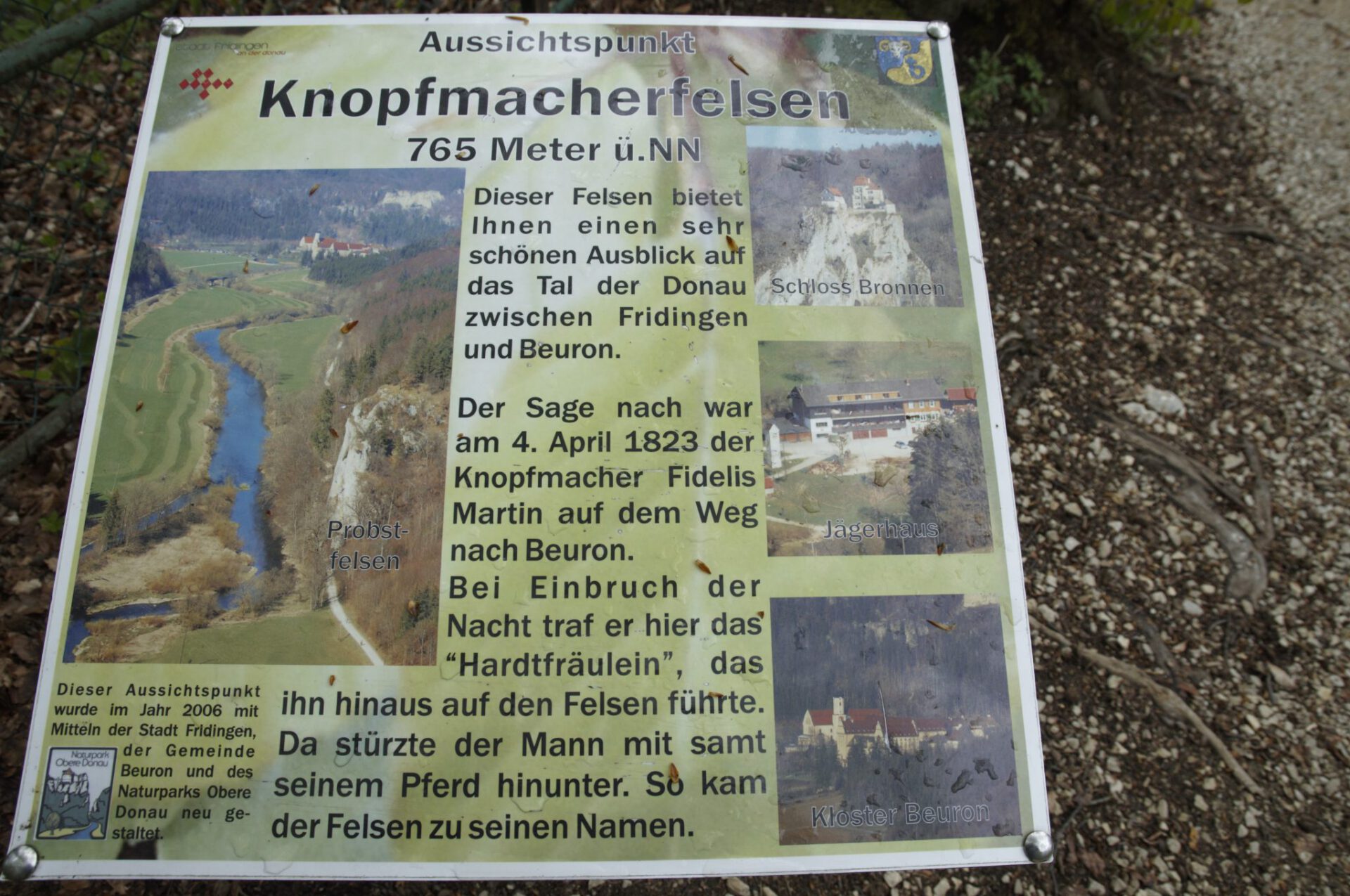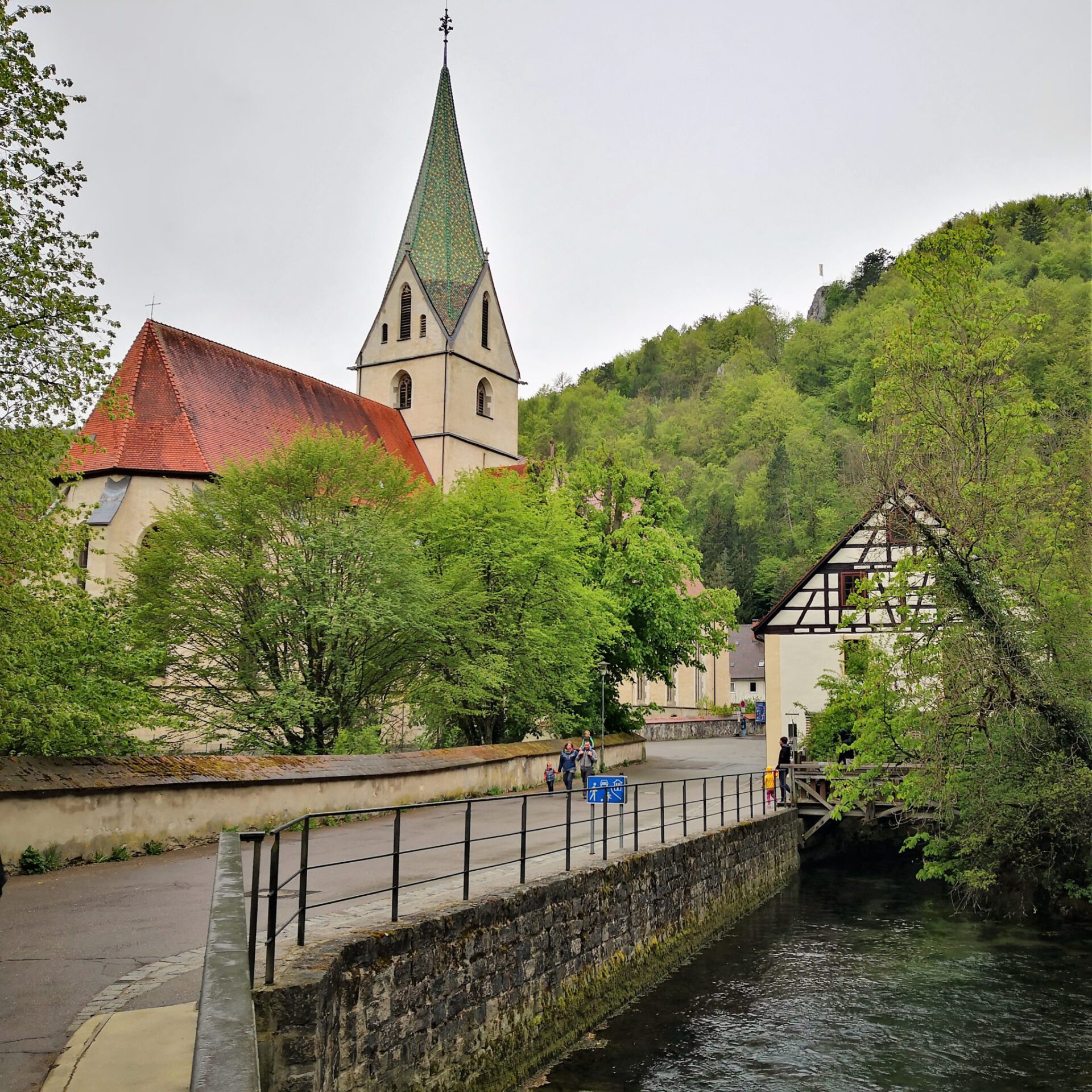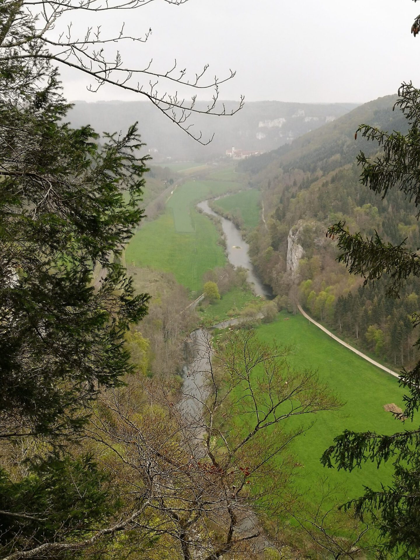 Am nächsten Tag fahren wir weiter über Blaubeuren, schauen am Blautopf vorbei, und weiter nach Sigmaringen, wo wir übernachten. Von Sigmaringen aus geht es dann über das obere Donautal Richtung Donaueschingen. Eine wirklich wunderschöne Landschaft! Vom Knopfmacherfelsen aus hat man einen großartigen Blick ins Donautal – naja, wenn es nicht gerade schneit und wolkenverhangen ist! Ist das frostig da oben – Anfang Mai! Aber wir genießen trotzdem die Aussicht.