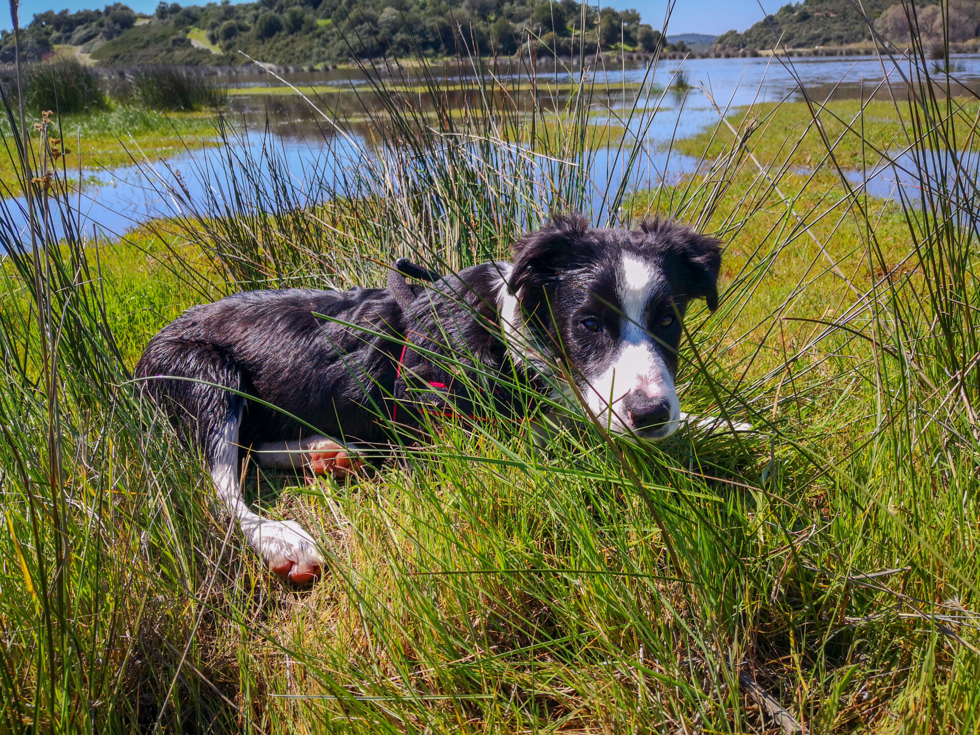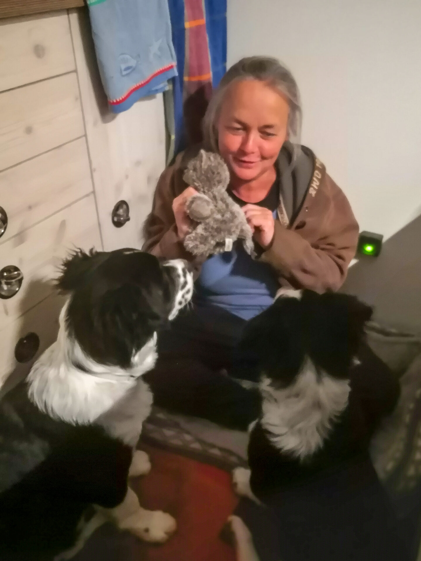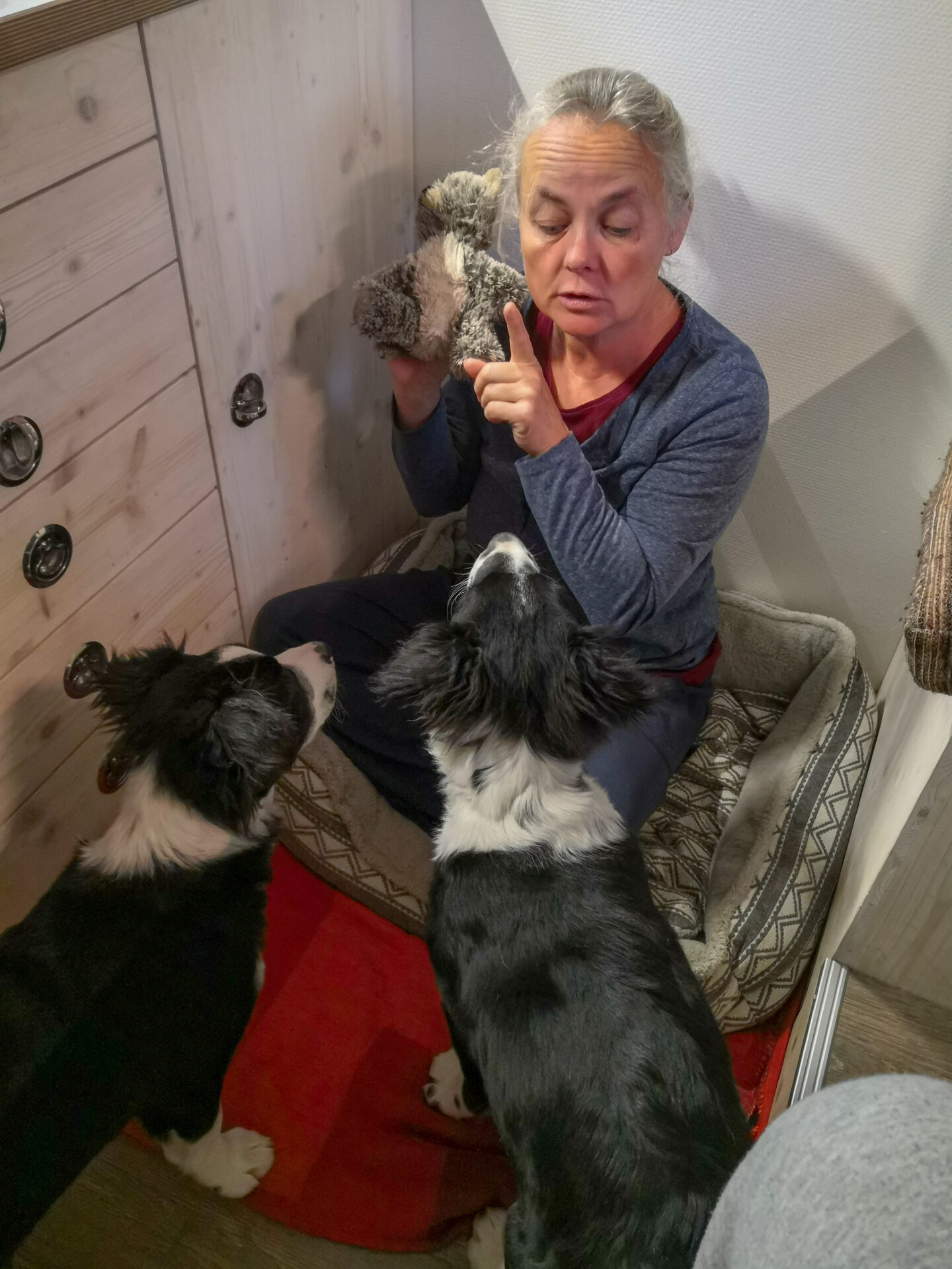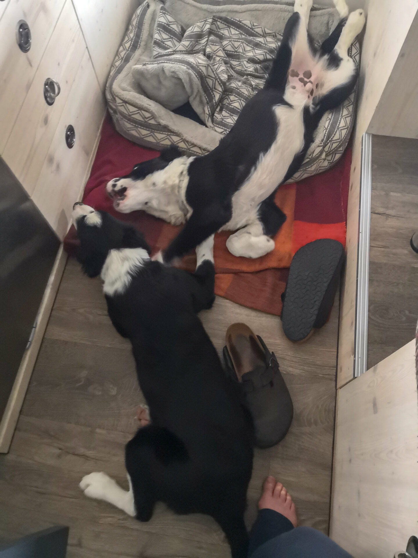 Aber: die erste Zeit nur Regen, Regen und nochmal Regen, kalter Wind und Sturm. Ende März gibt es zwei sonnigere Tage und dann wieder Regen, Regen und Regen, kalter Wind und Sturm. Wir sind alle genervt und erschöpft. Es wird immer unerträglicher im LKW mit den zwei Hunden, die jeden Tag gefühlt ein Stück gewachsen sind. Außerdem werden die Streitereien zwischen den beiden Geschwistern immer heftiger. Wir müssen mindestens fünf Mal am Tag mit ihnen raus. Die Schmutztoleranz wird von Tag zu Tag größer. Ein „bisschen“ Dreck und alles nass, was soll’s. Aber jeden Tag gibt es eine Lektion in der Hundeschule im Oskar, das bringt ein wenig Ablenkung.