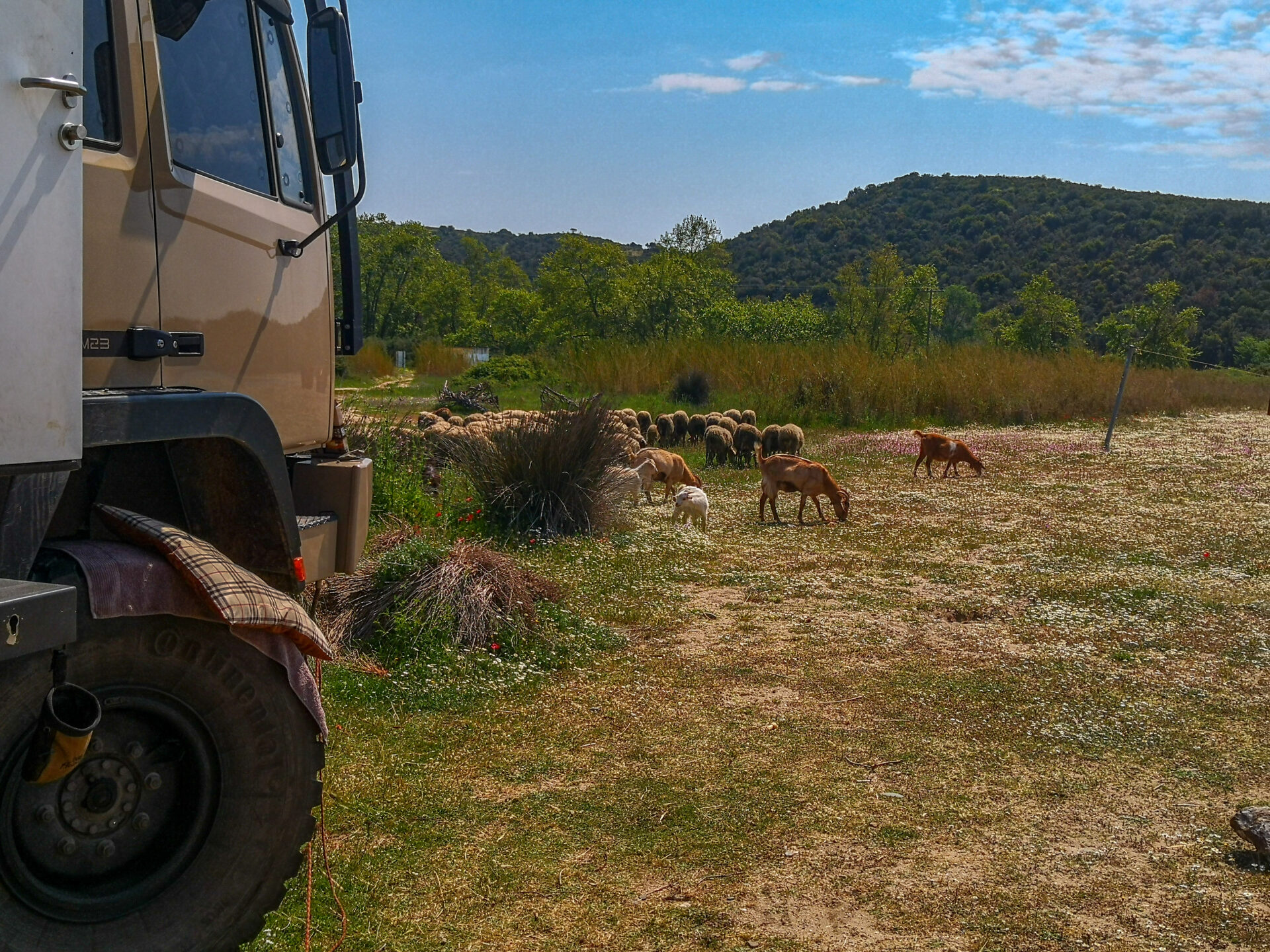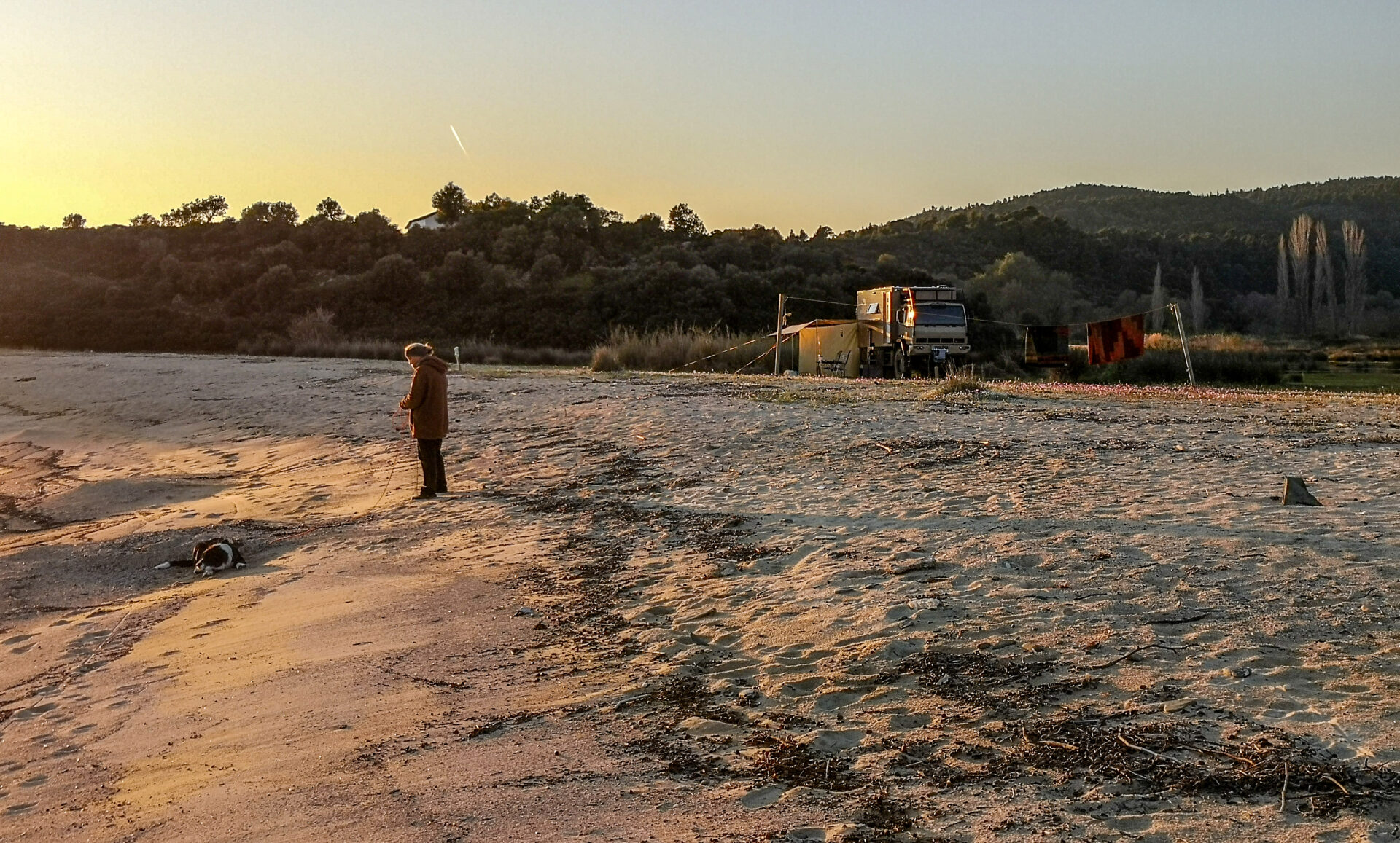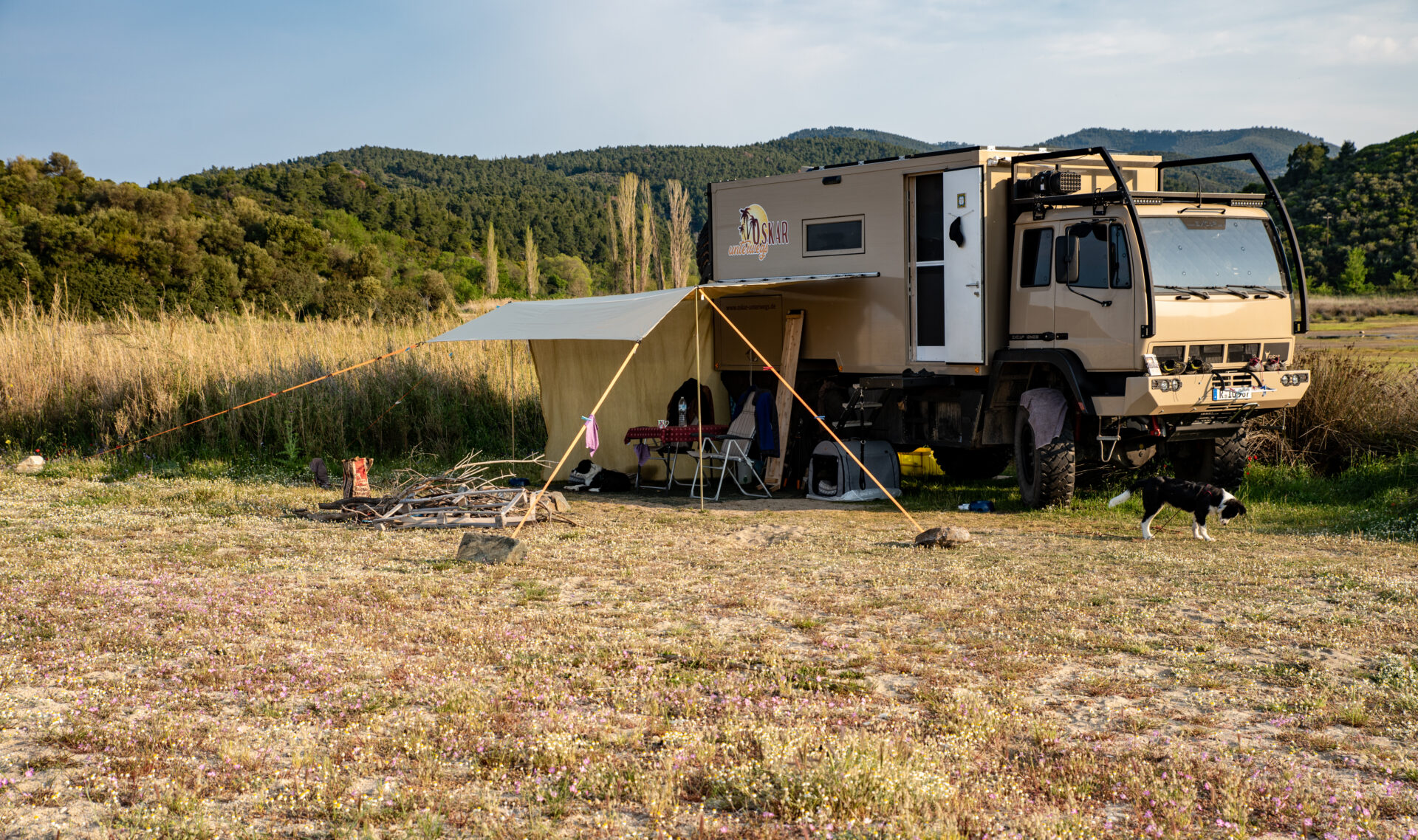 Wir installieren uns, nicht wissend in dem Moment, dass wir die nächsten 6 Wochen hier verbringen werden. Die Coronaregeln in Griechenland sind streng und deren Einhaltung wird auch strikt überwacht. Einmal die Woche gehen wir einkaufen. Hierfür müssen wir ein Formular mitführen, von uns ausgefüllt mit Anlass der Fahrt, Herkunftsort und Zielort, mit Datum und Uhrzeit. Beim ersten Einkauf werden wir noch misstrauisch beäugt, denn auf der Chalkidiki gibt es kaum bestätigte Fälle von Coronainfektionen. Zu einem späteren Zeitpunkt wurde der Zugang zur Chalkidiki aus diesem Grund von Thessaloniki aus auch gesperrt. Aber da wir ja ein „wenig“ auffallen mit unserem Fahrzeug, sind wir bald bekannt und bekommen keine Probleme.