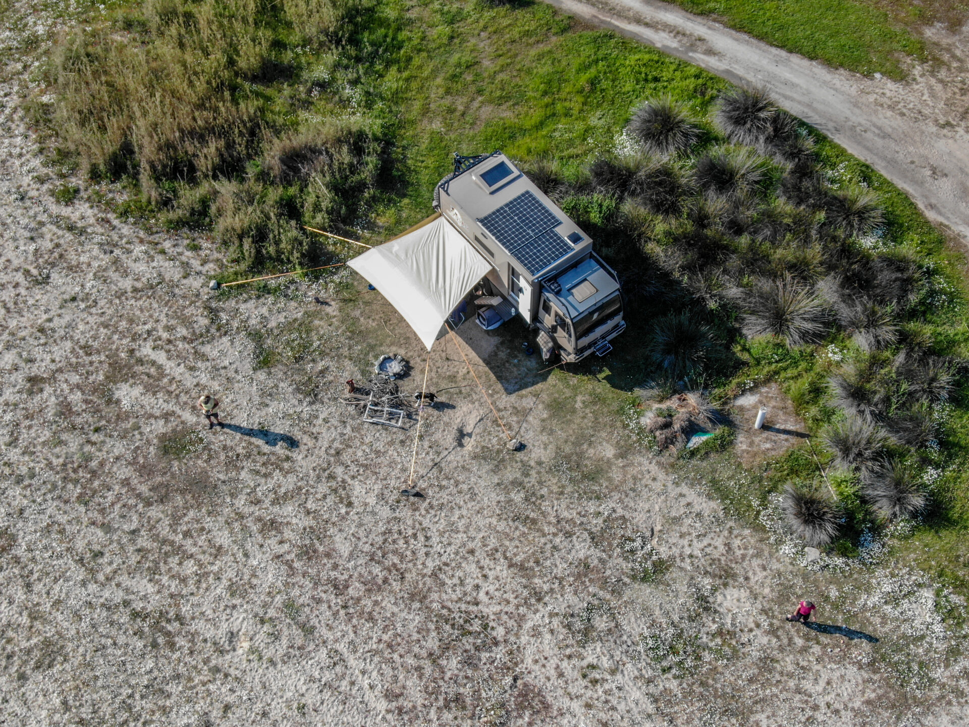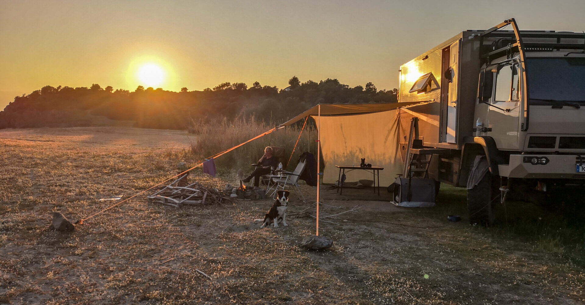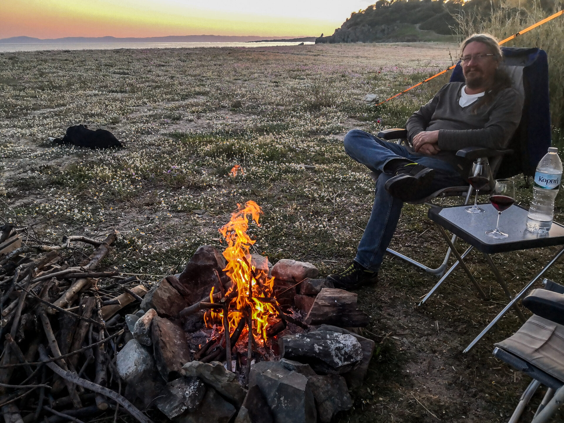 Wir beschließen, bei diesem guten Wetter nun das Beste aus unserer Zeit hier zu machen. Wir installieren uns mit Sonnensegel und Windschutz. Alma bekommt ihren Platz links von unserem Freisitz, Yannis rechts, dann sind die zwei Streithähne auch getrennt. Vor dem Freisitz bauen wir uns eine große Feuerstelle und genießen jeden Abend ein Lagerfeuer. So vergeht die Zeit fast wie im Flug. Der handwerklich geschickte Jochen näht uns in der Zeit zwei schicke Coronamasken.